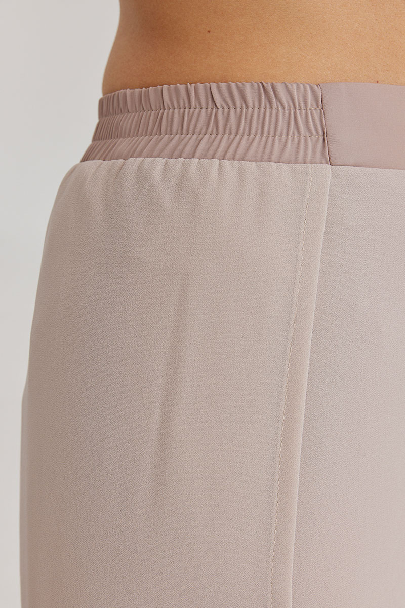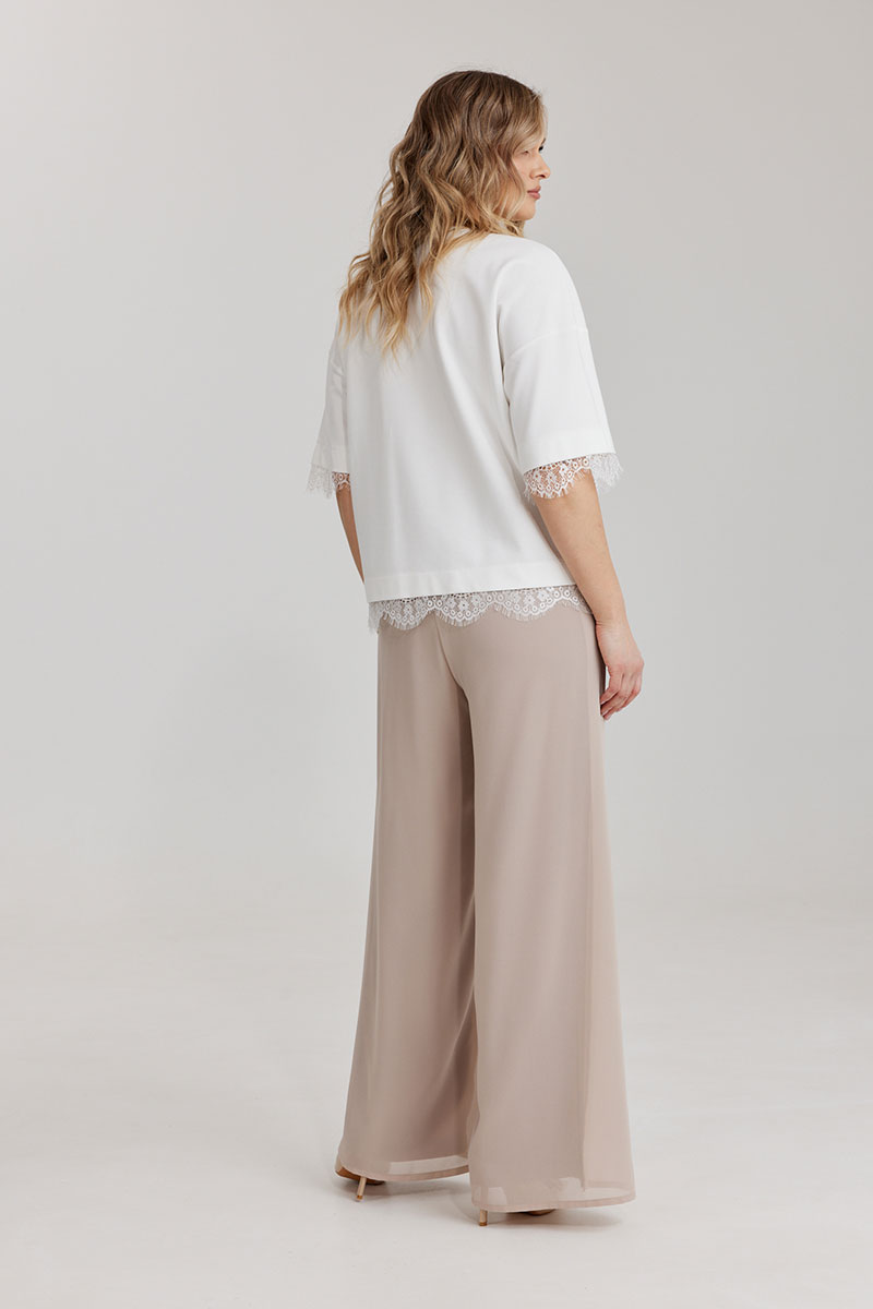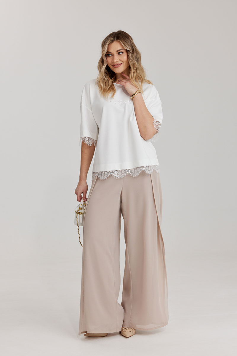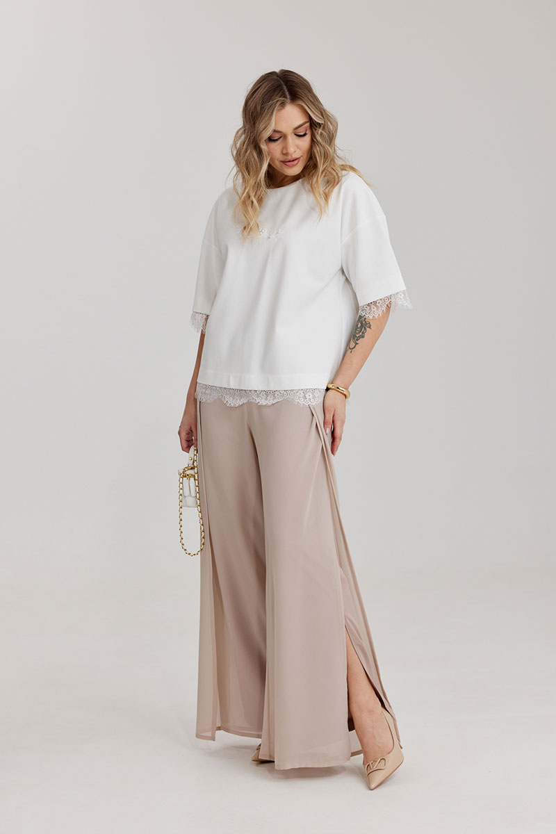 Брюки прямого силуэта, выполнены из шифоновой ткани на подкладке полной длинны. Боковой шов брюк открыт. Синка брюк заходит на перед по верхней части. Подкладка из не просвещающейся креповой ткани. Верх брюк обработан отрезным поясом. Центральная часть пояса без резинки, остальной пояс на резинке. Низ брюк обработан швом « в подгибку».