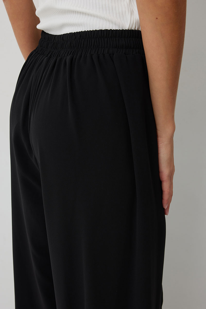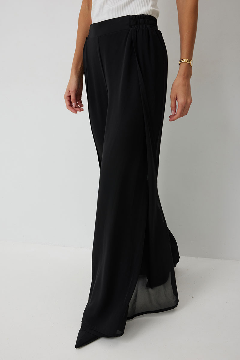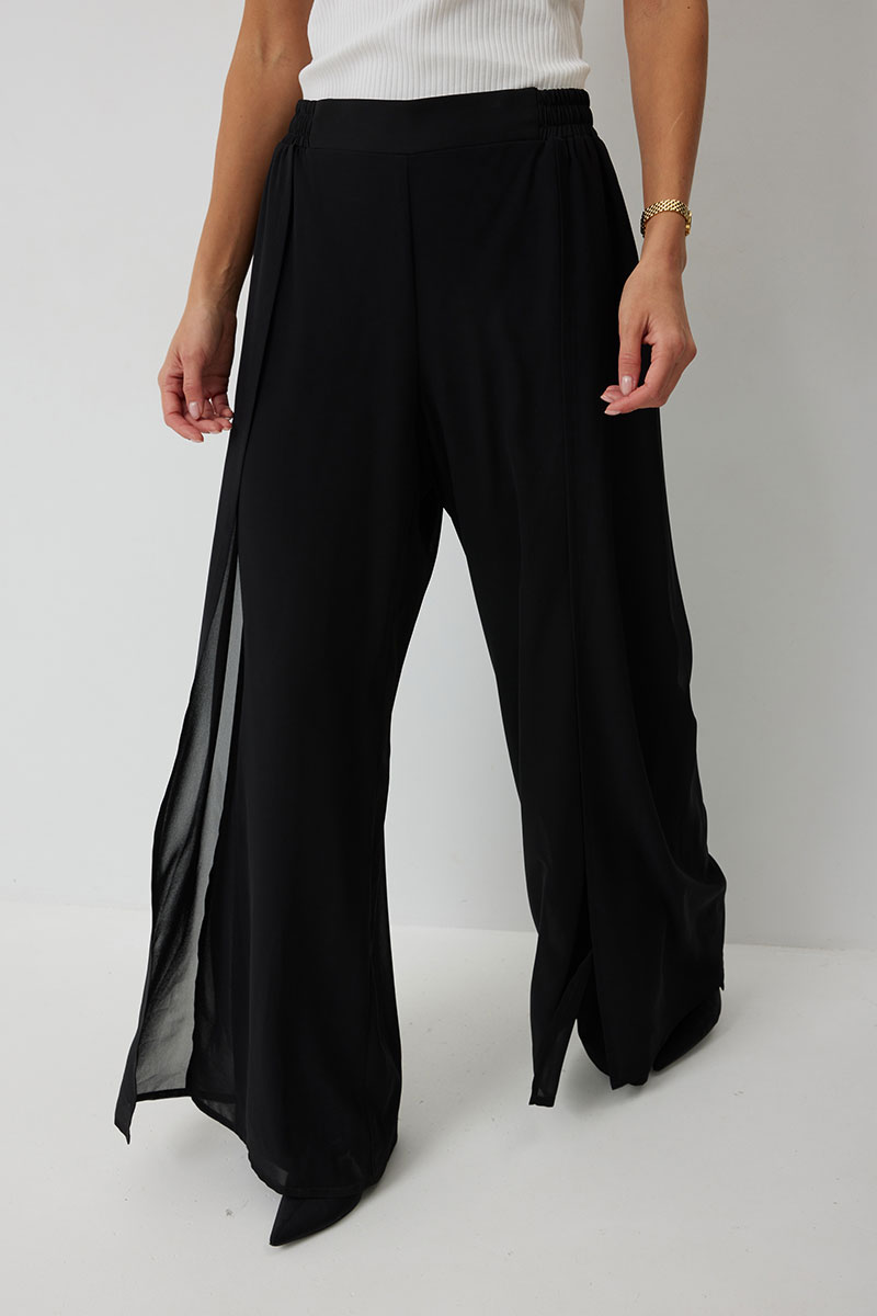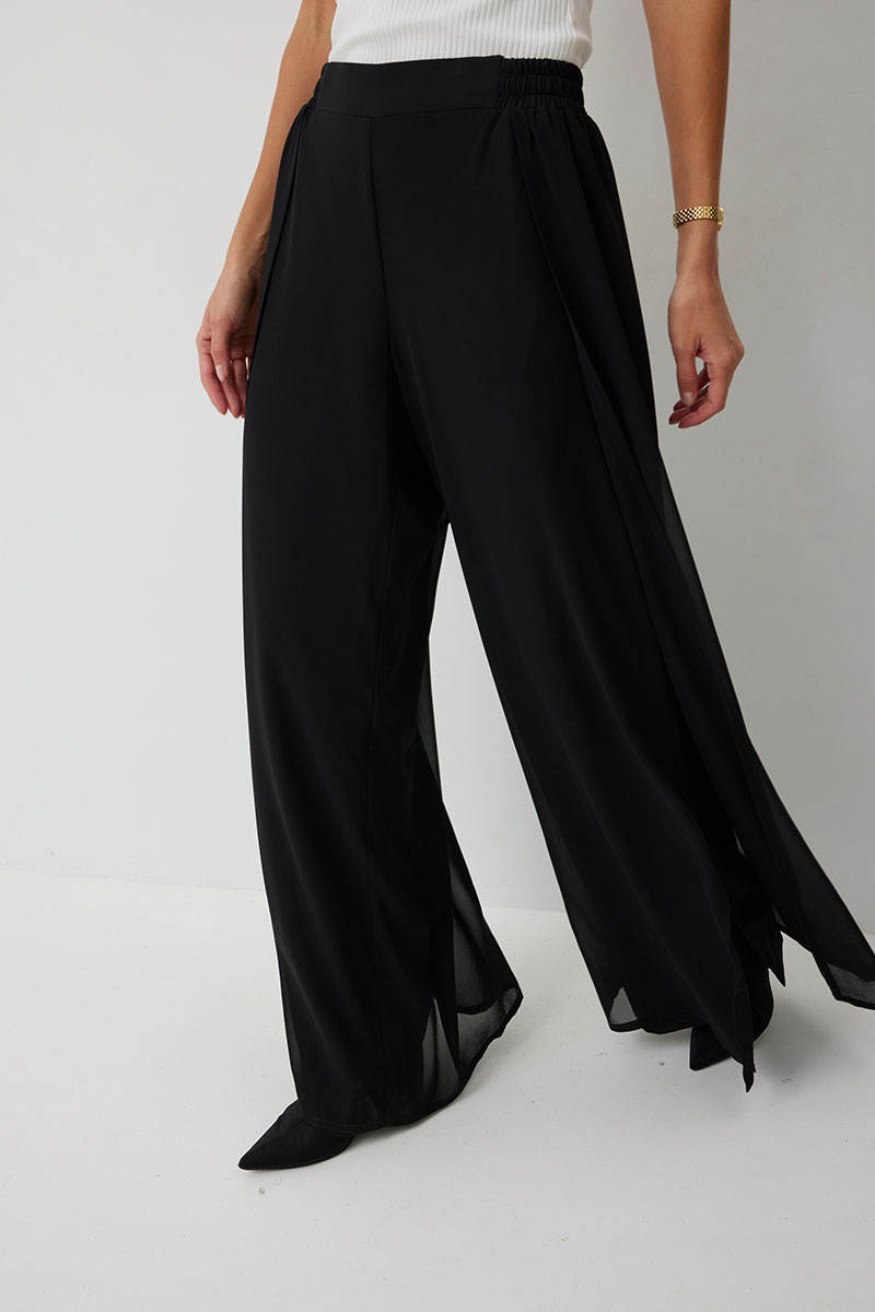 Брюки прямого силуэта, выполнены из шифоновой ткани на подкладке полной длинны. Боковой шов брюк открыт. Синка брюк заходит на перед по верхней части. Подкладка из не просвещающейся креповой ткани. Верх брюк обработан отрезным поясом. Центральная часть пояса без резинки, остальной пояс на резинке. Низ брюк обработан швом « в подгибку».
