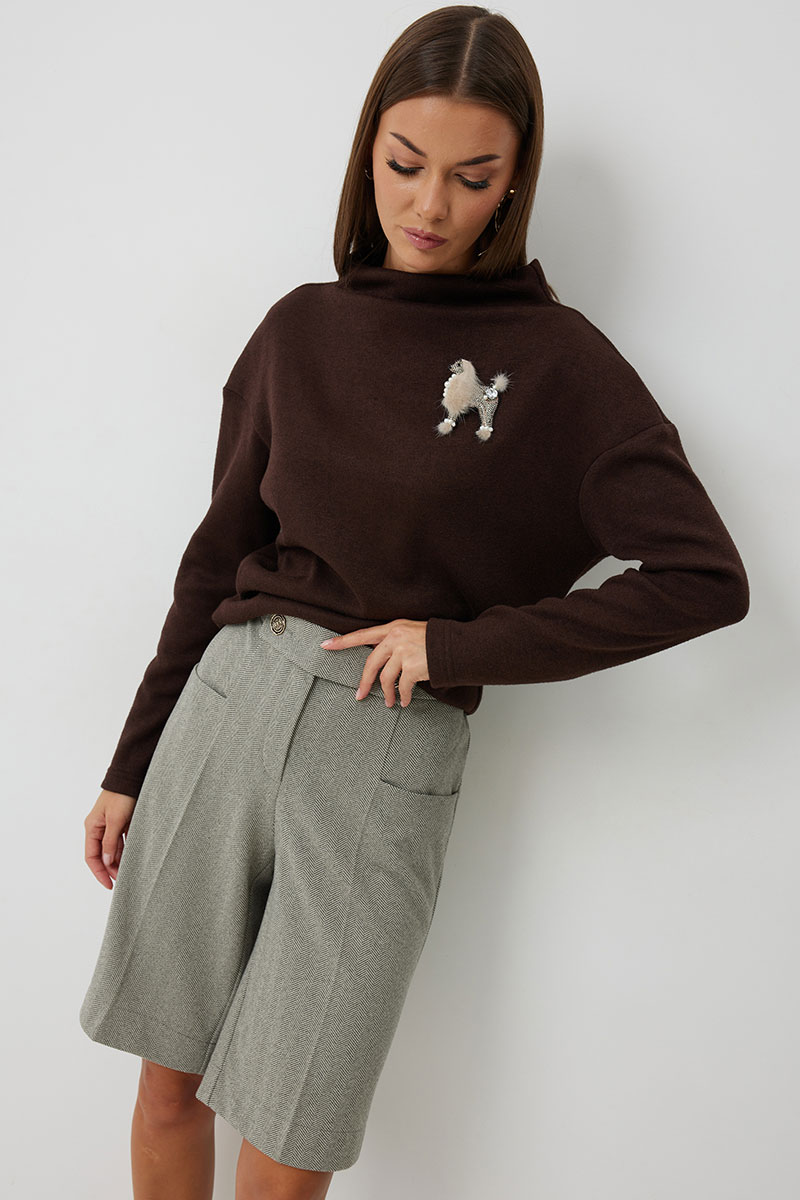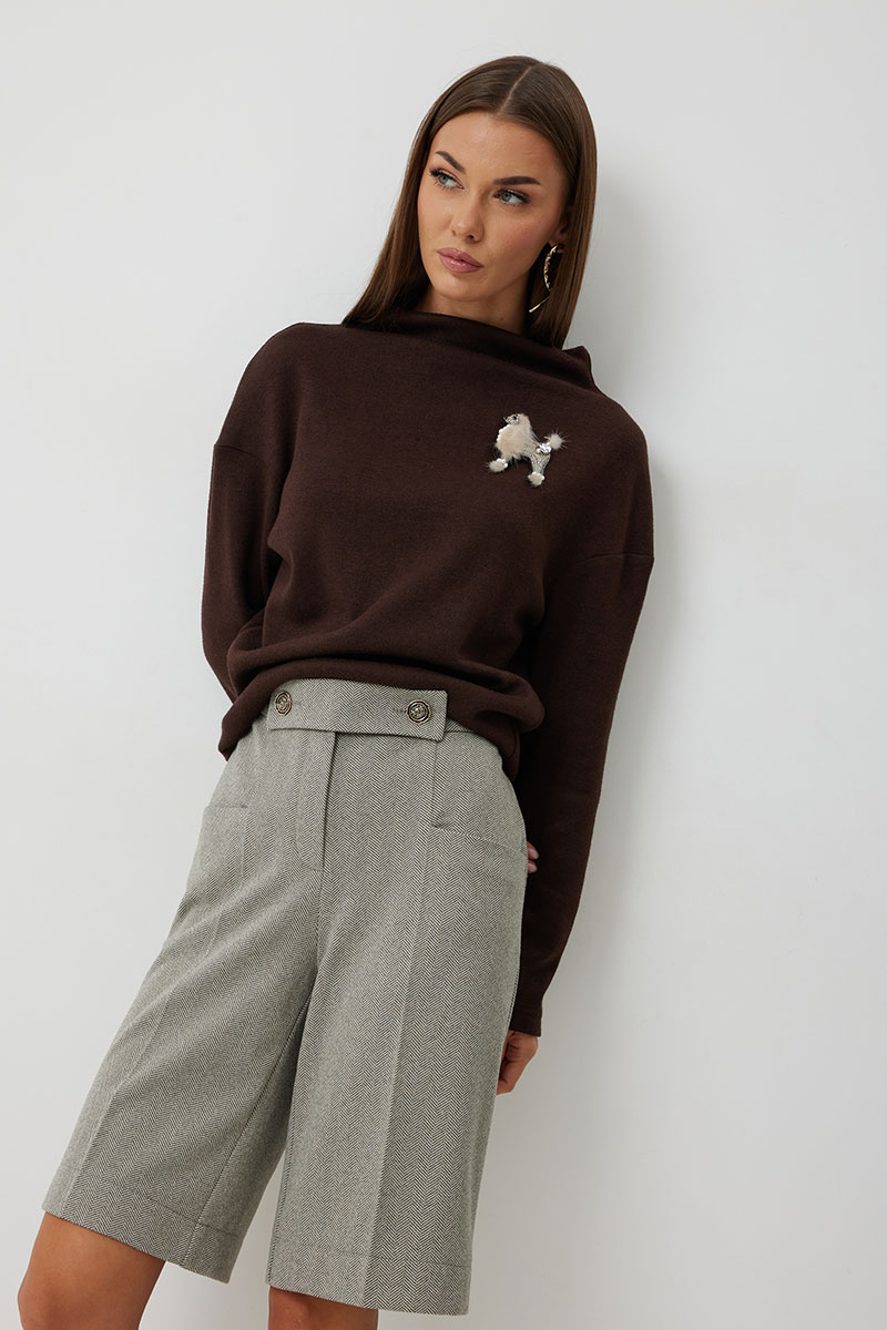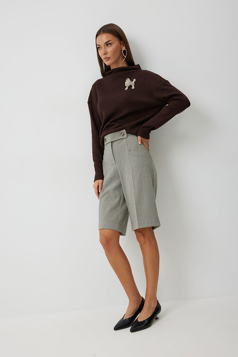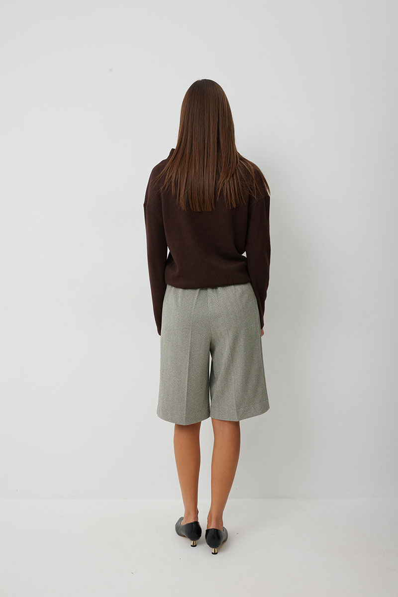 Бермуды женские прямые длиной до колена. На передних половинках обработаны карманы с отрезным фигурным бочком. На передних и задних половинках заутюжены стрелки. На задних половинках обработаны вытачки. Застёжка-молния распологается на передних половинках бермуд, обработана в гульфике. Верхний срез обработан отрезным поясом, по спинке брюк в пояс вставлена резинка. Пояс застегивается с помощью отрезной детали на декоративные пуговицы.