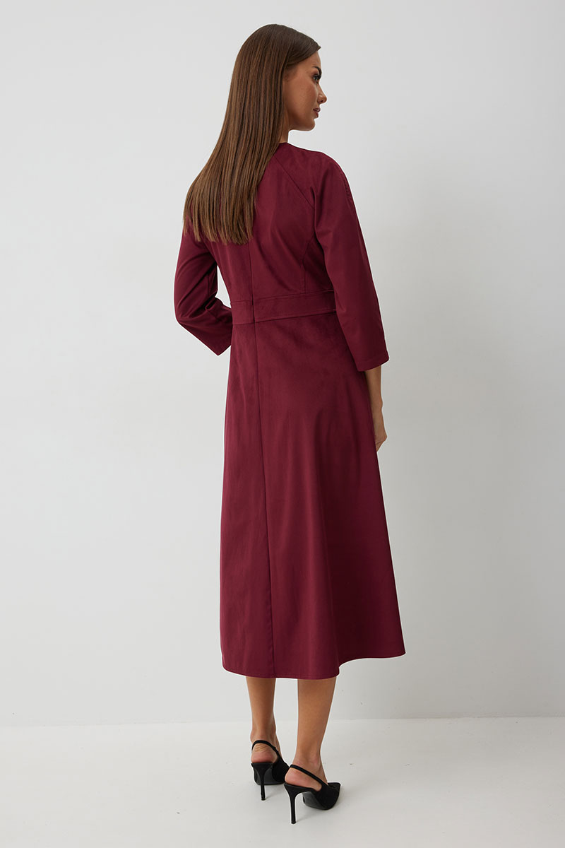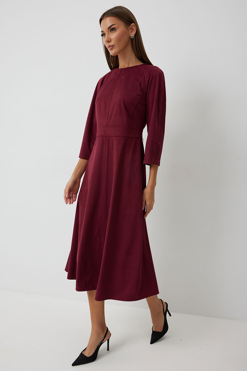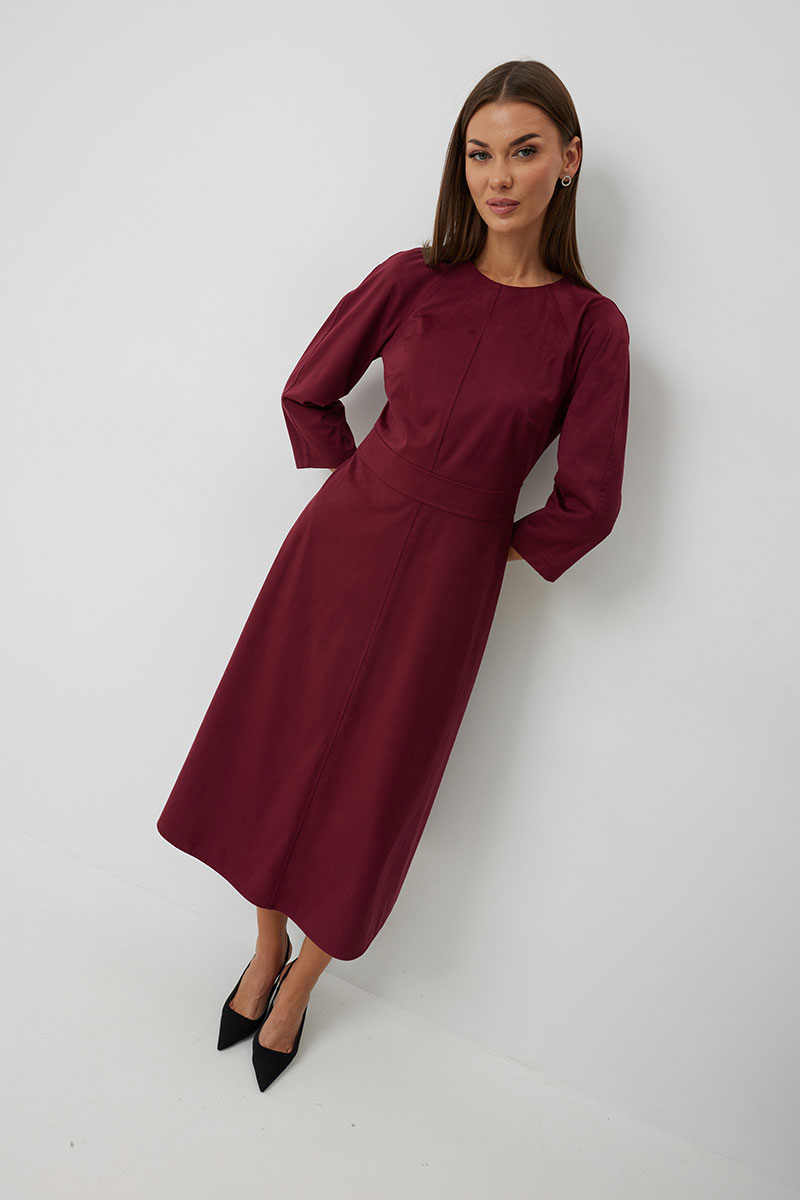 Платье женское полуприлегающего силуэта без подкладки, длиной до середины икры. Платье с отрезным лифом. По переду лиф с центральным швом, отрезными бочками и нагрудными вытачками. Спинка лифа с центральным швом и отрезными бочками. Отрезная юбка по переду и спинке со средним швом. Юбка соединяется с лифом отрезным поясом. Рукав-реглан полной длинны. Низ рукава и платья обработан швом «в подгибку». Горловина платья обработана обтачкой. По среднему шву спинки располагается застежка-молния.