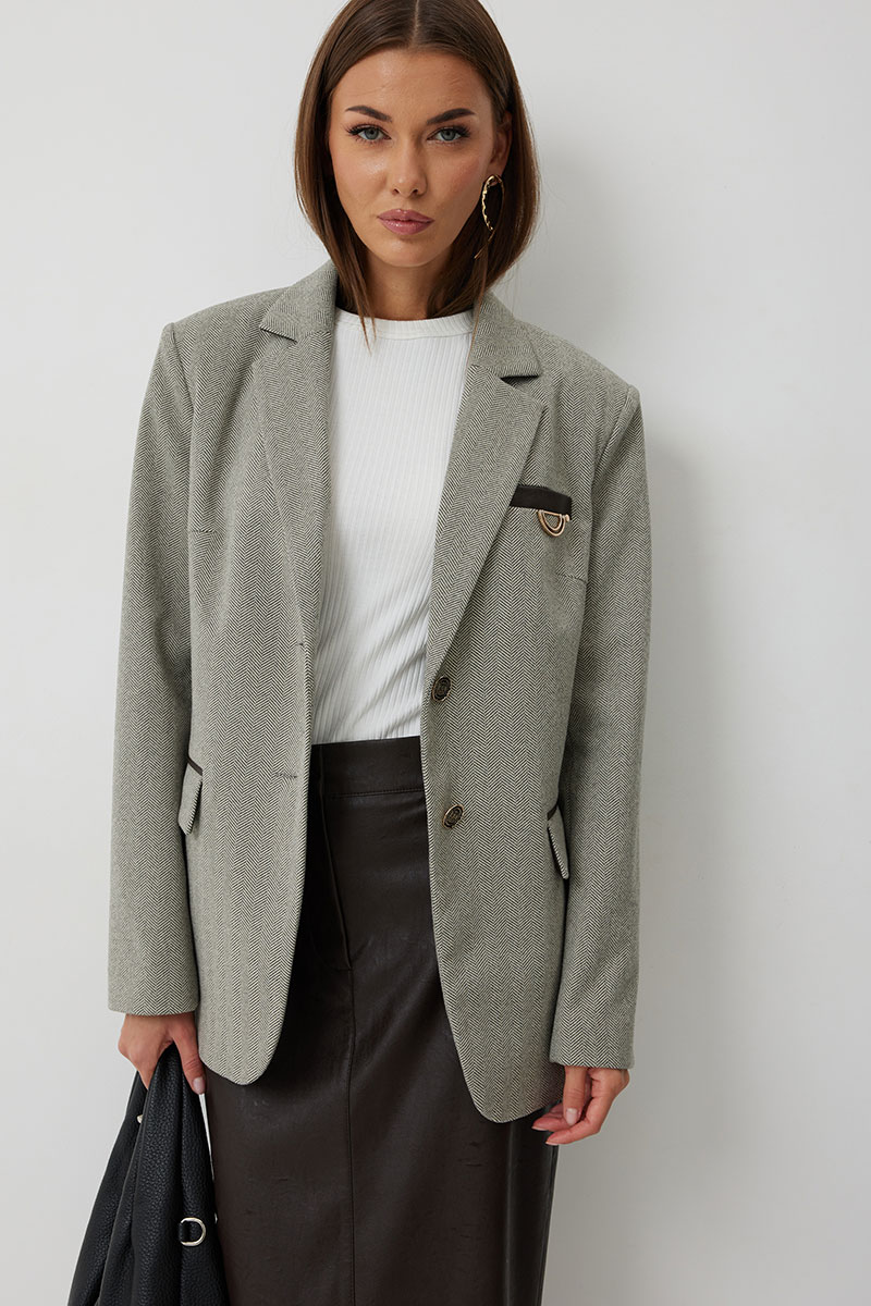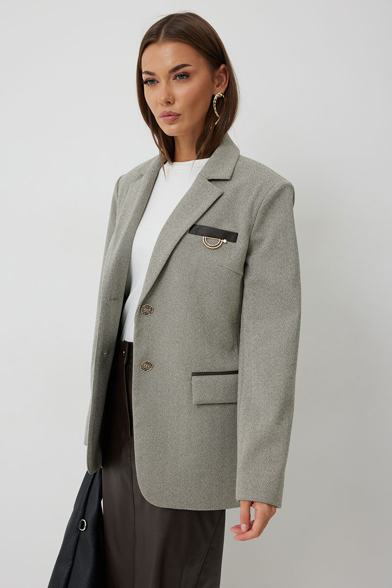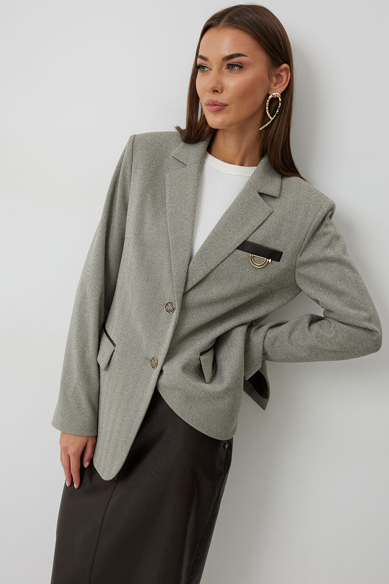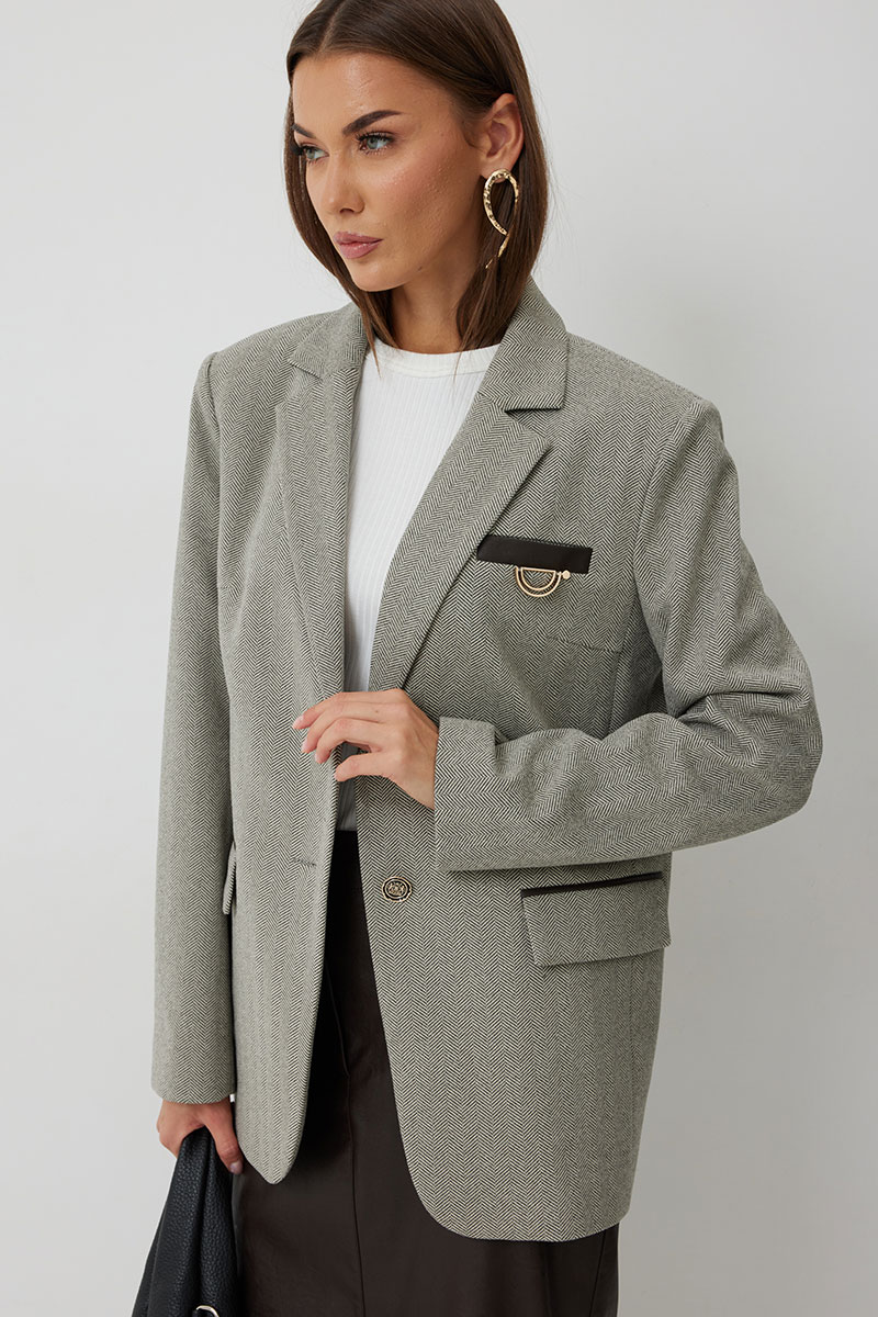 Жакет женский однобортный на подкладке прямого силуэта из трикотажной ткани. На передних частях жакета отрезной бочок с нагрудными вытачками. Обработаны прорезные карманы «в рамку» с клапаном. На левой части переда обработан карман с листочкой и декоративной пришивной деталью. Листочка, рамки кармана и нижний воротник выполнены из искусственной кожи. Спинка со шлицей в среднем шве. Рукав втачной двухшовный. Горловина обработана втачным воротником с отложными лацканами. Низ передних частей имеет закругленную форму. Жакет застегивается н а 2 декоративный пуговицы.