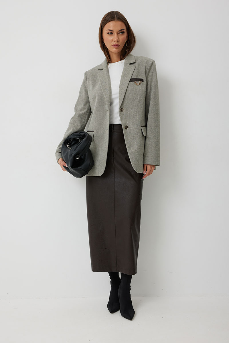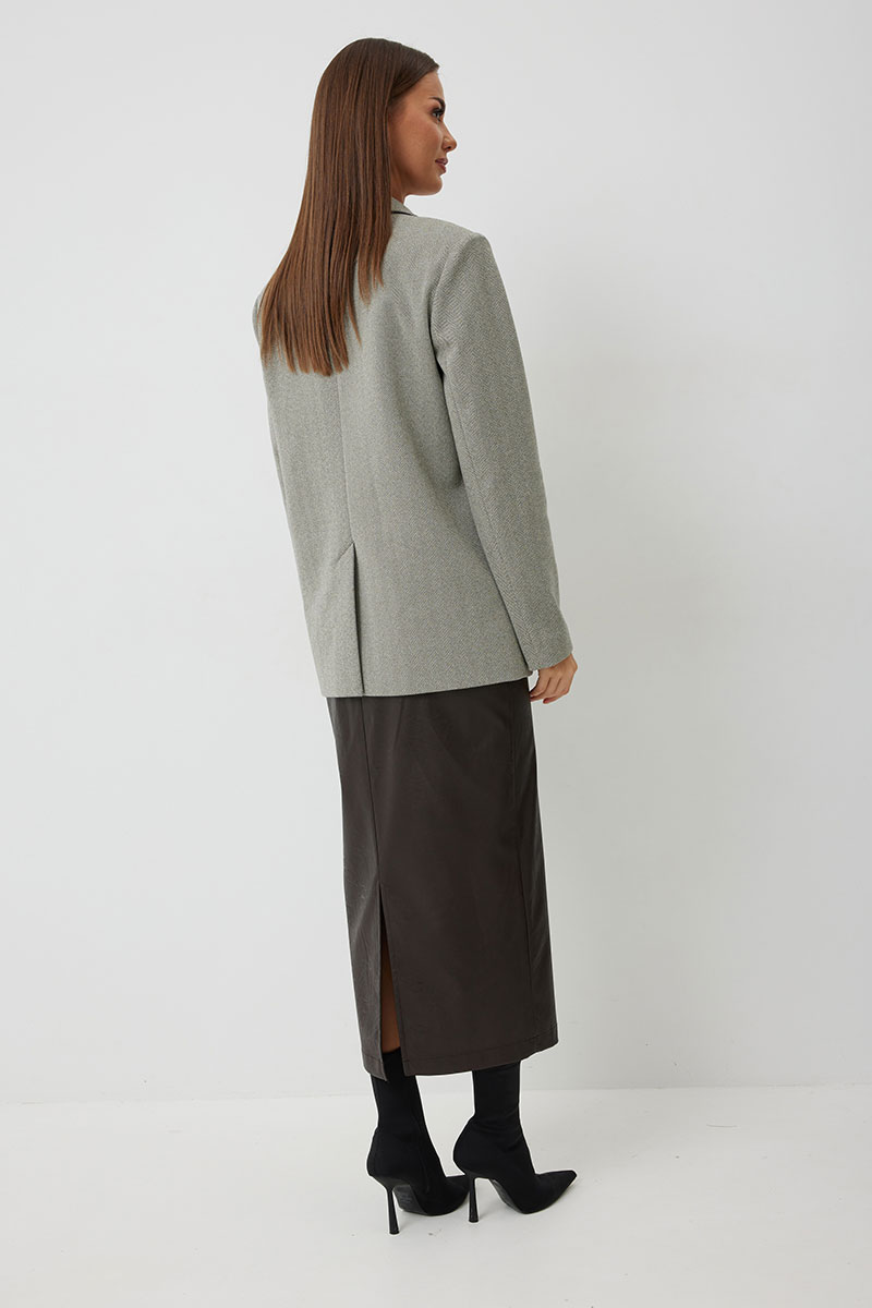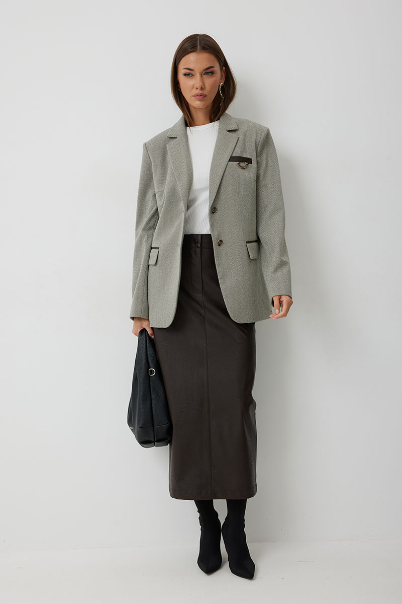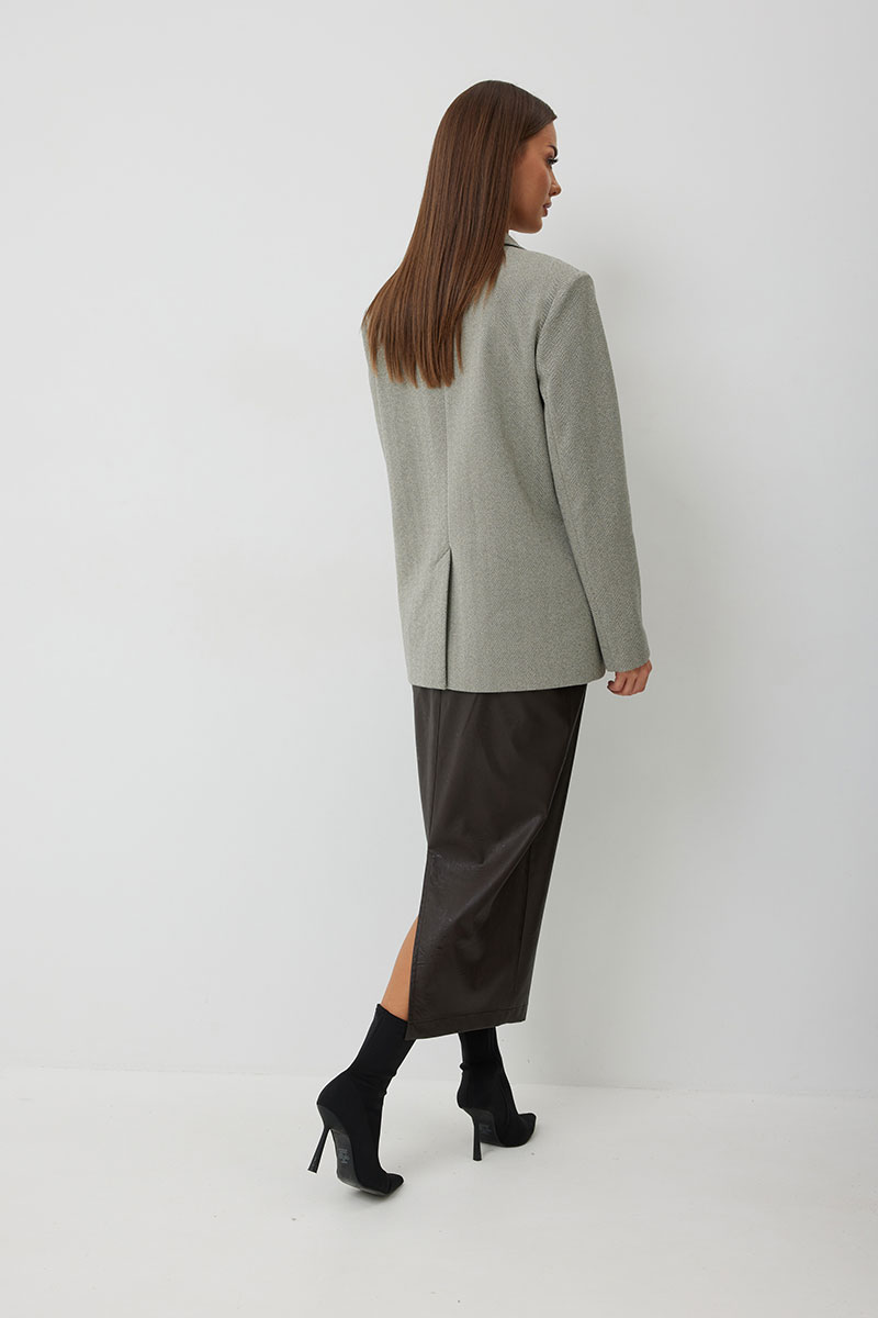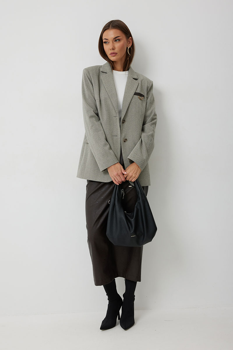 Жакет женский однобортный на подкладке прямого силуэта из трикотажной ткани. На передних частях жакета отрезной бочок с нагрудными вытачками. Обработаны прорезные карманы «в рамку» с клапаном. На левой части переда обработан карман с листочкой и декоративной пришивной деталью. Листочка, рамки кармана и нижний воротник выполнены из искусственной кожи. Спинка со шлицей в среднем шве. Рукав втачной двухшовный. Горловина обработана втачным воротником с отложными лацканами. Низ передних частей имеет закругленную форму. Жакет застегивается н а 2 декоративный пуговицы.