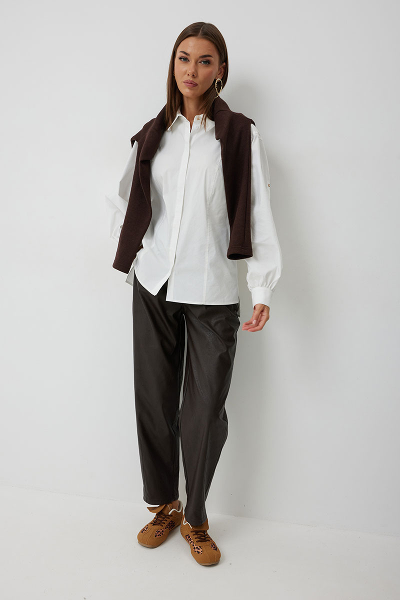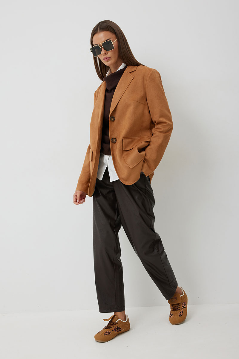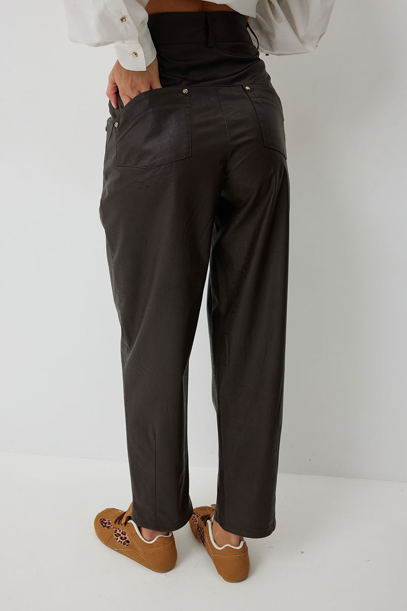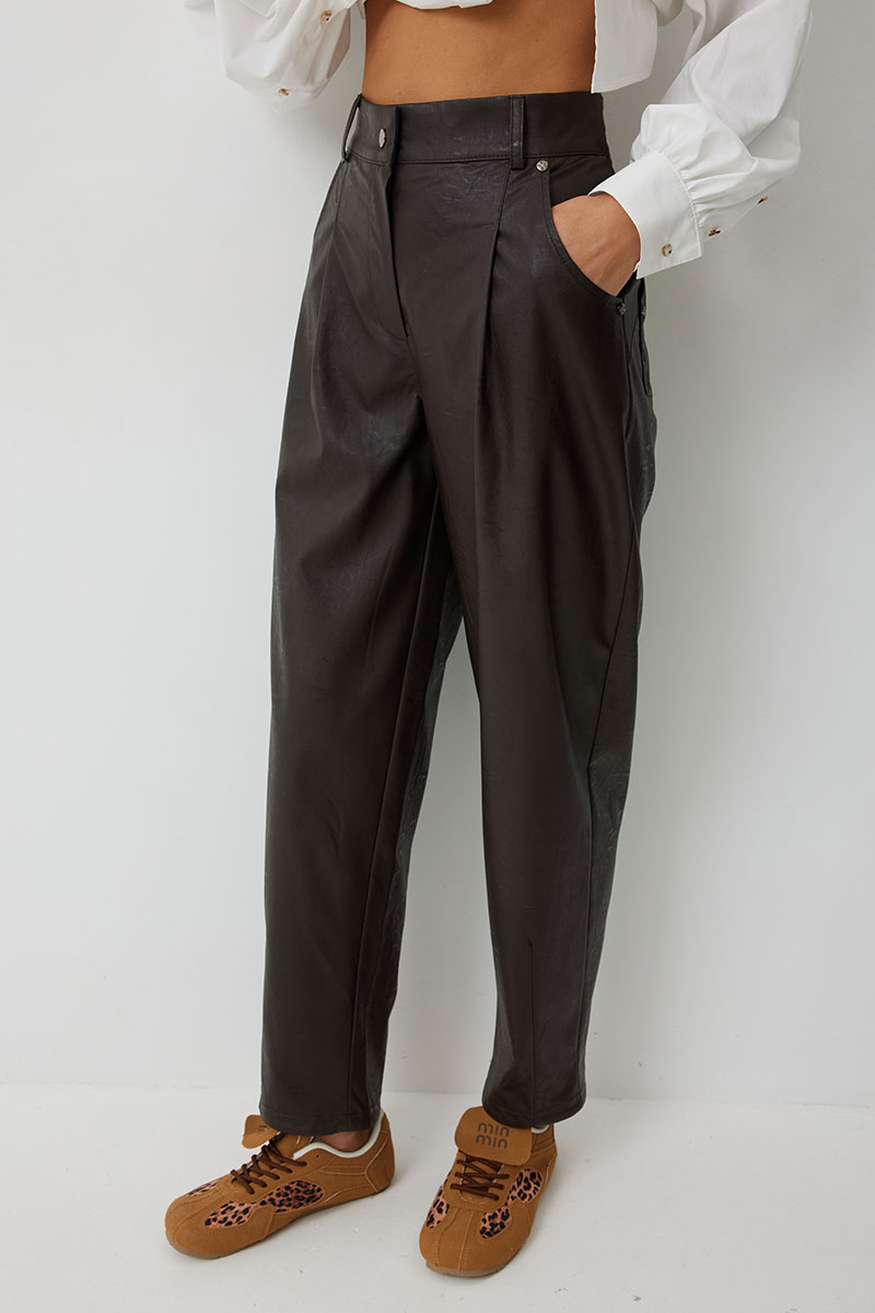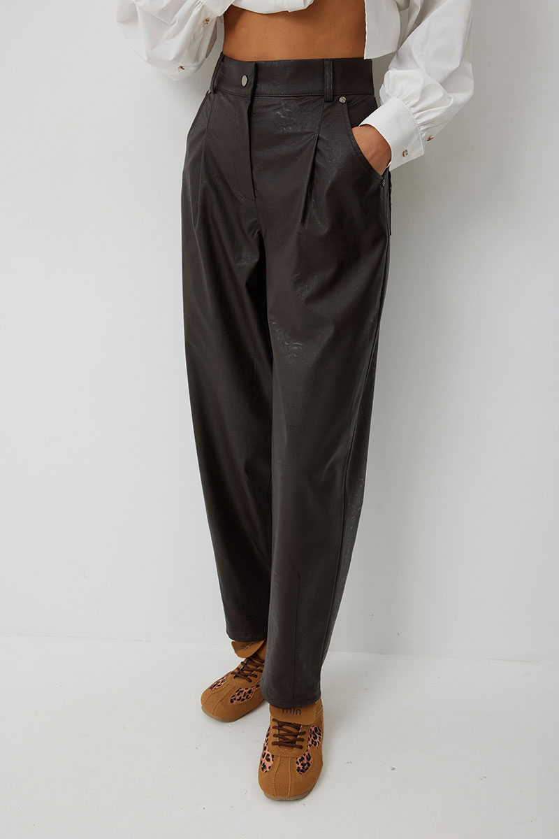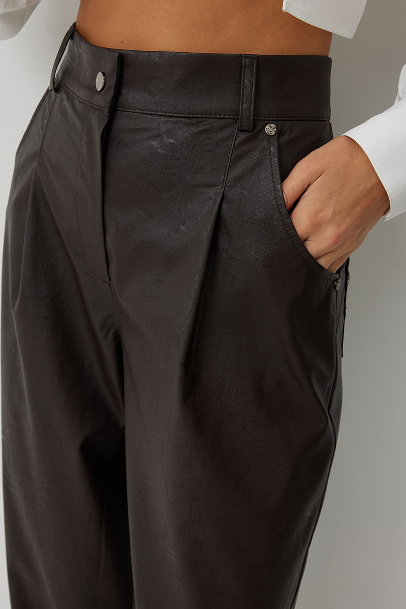 Брюки женские из искусственной кожи зауженные к низу. На передних частях брюк обработаны карманы с отрезным бочком и застрочены складки. По концам кармана установлены хольнитены. По спинке брюк накладные карманы с хольнитенами на концах и отрезной кокеткой. Верхний срез брюк обработан отрезным поясом со шлевками. Брюки застегиваются по переду на «молнию» в гульфике и кнопку по поясу.