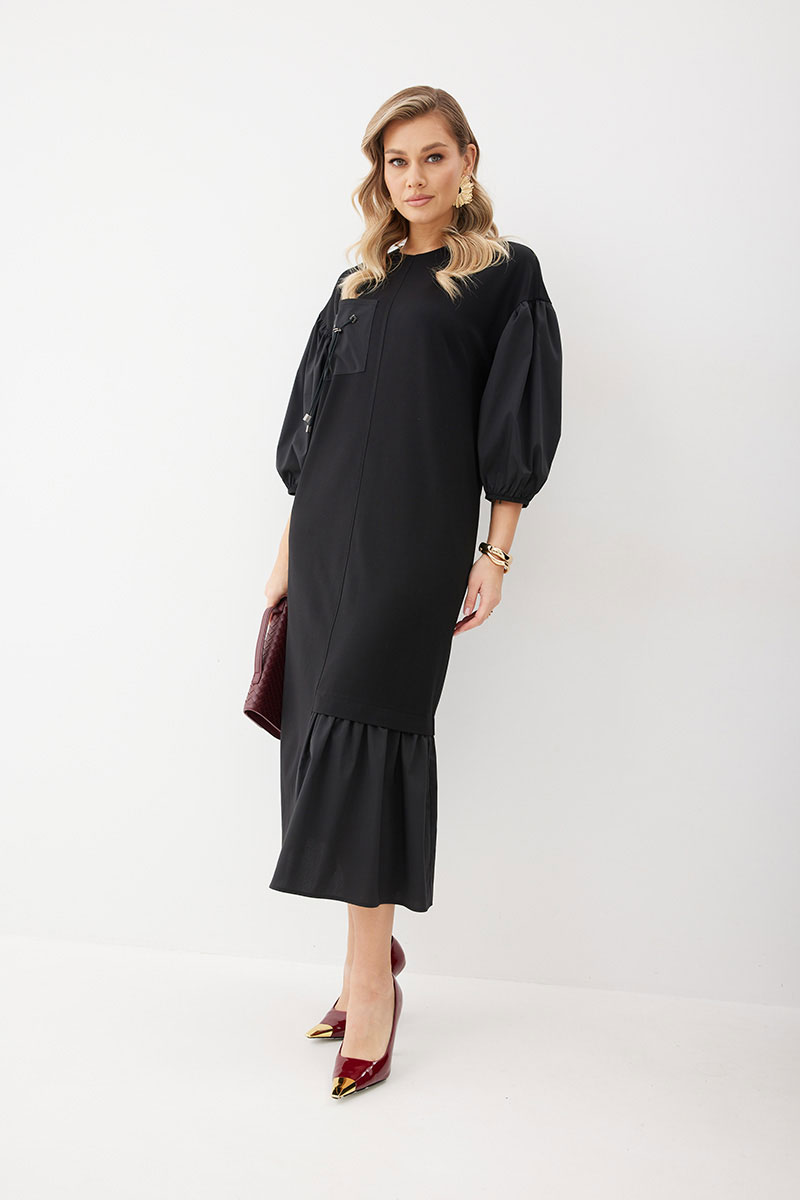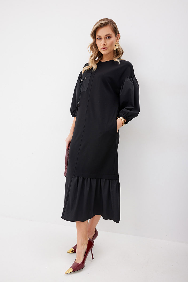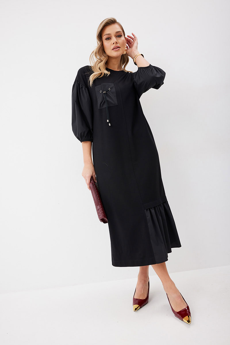 Платье женское прямого силуэта без подкладки из трикотажной ткани длиной до середины икры. Передняя часть платья со средним швом. По левой половинке переда внизу платья пришит волан из ткани – компаньона. По правой половинке переда настрочен нагрудный карман из ткани – компаньона с декоративными элементами. В боковых швах платья функциональные карманы. Спинка платья со средним швом, в котором расположена застежка – «молния». По низу левой половинки спинки пришит волан из ткани – компаньона. Горловина имеет округлую форму. Линия плеча спущена. Рукав выполнен из ткани – компаньона со сборкой вверху рукава и резинкой по низу рукава.