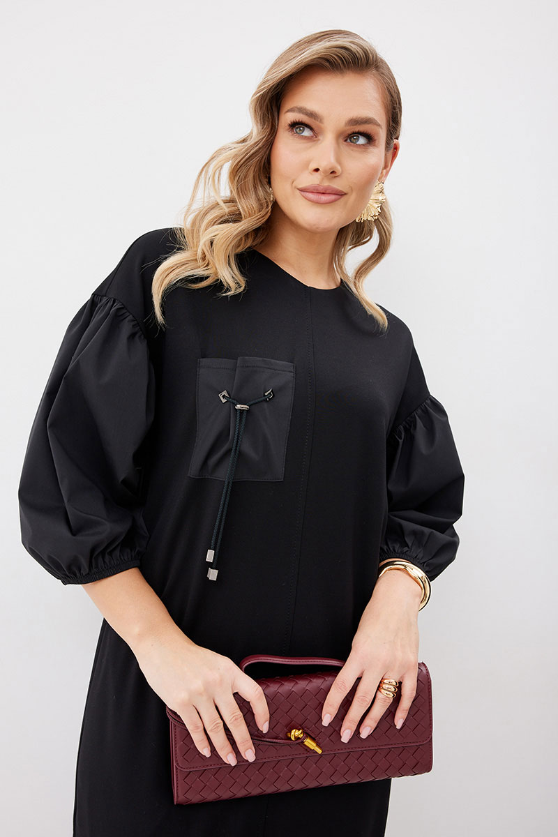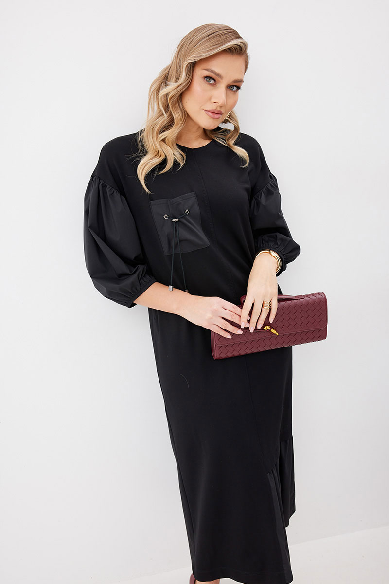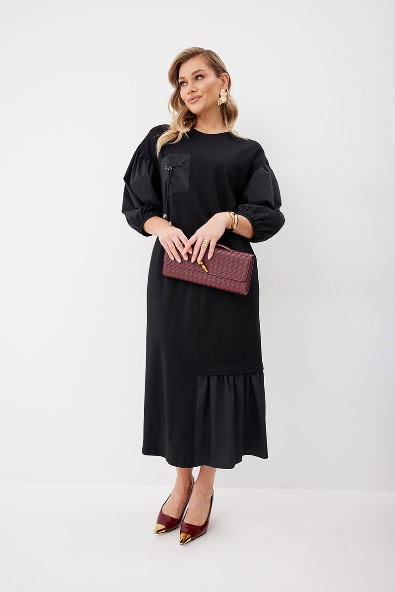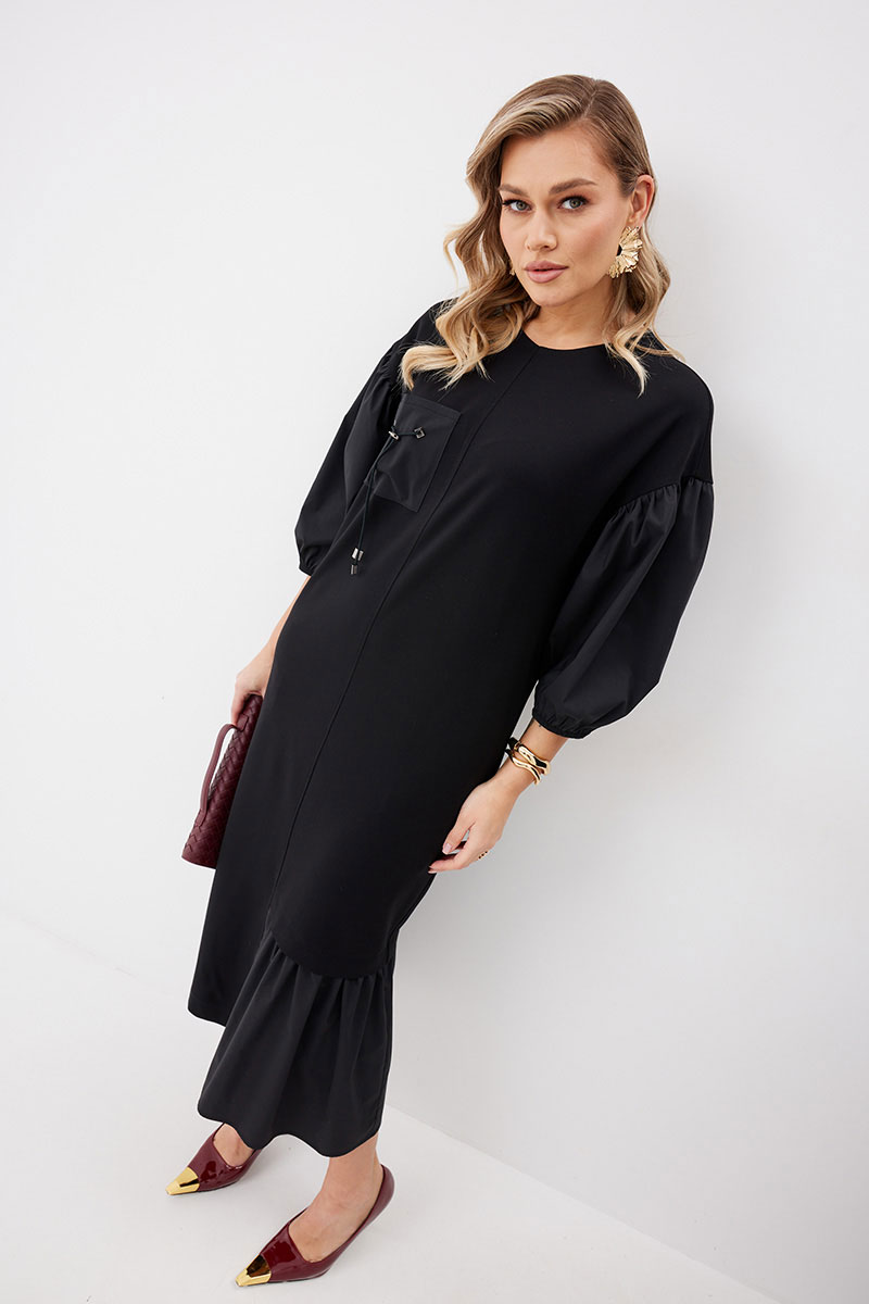 Платье женское прямого силуэта без подкладки из трикотажной ткани длиной до середины икры. Передняя часть платья со средним швом. По левой половинке переда внизу платья пришит волан из ткани – компаньона. По правой половинке переда настрочен нагрудный карман из ткани – компаньона с декоративными элементами. В боковых швах платья функциональные карманы. Спинка платья со средним швом, в котором расположена застежка – «молния». По низу левой половинки спинки пришит волан из ткани – компаньона. Горловина имеет округлую форму. Линия плеча спущена. Рукав выполнен из ткани – компаньона со сборкой вверху рукава и резинкой по низу рукава.