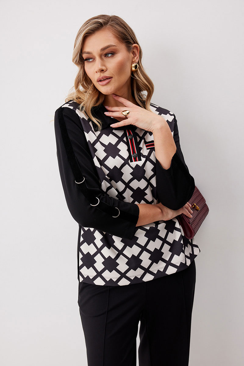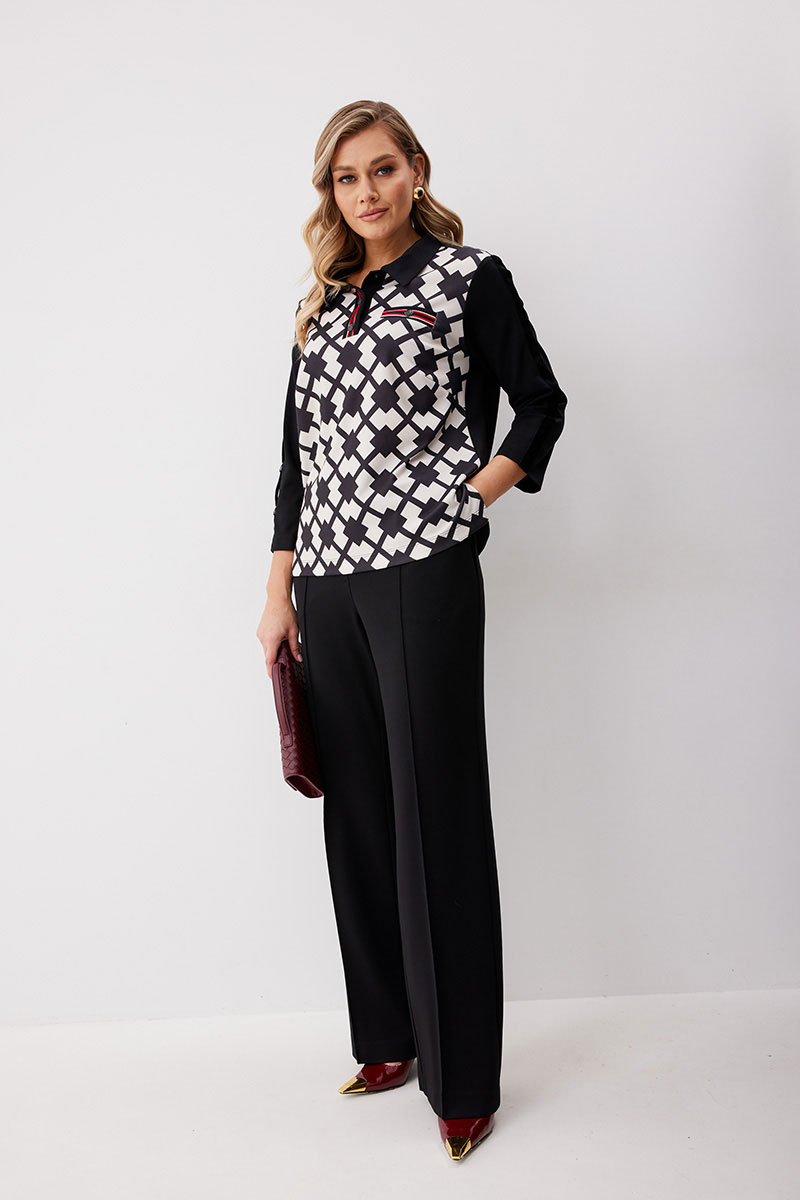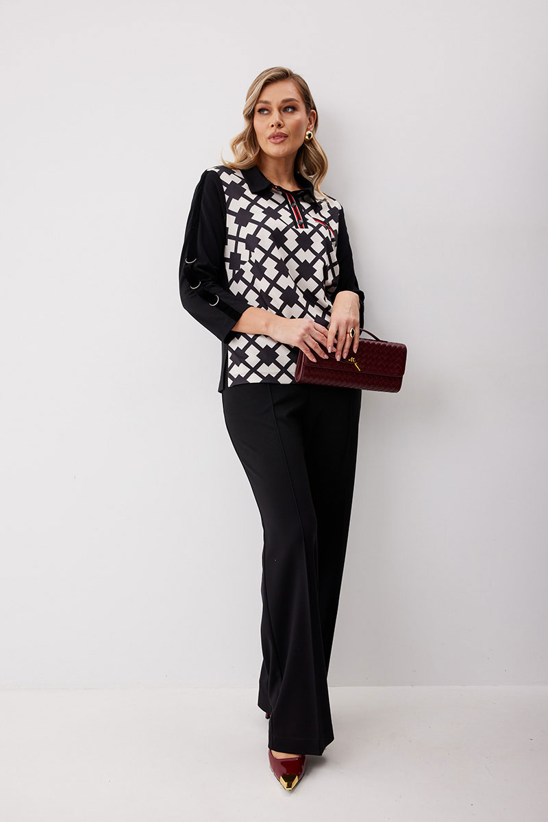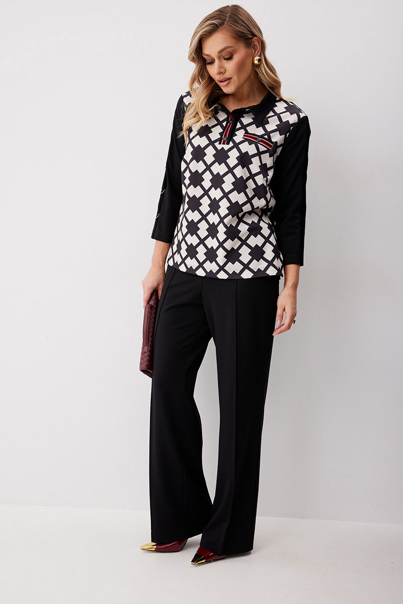 Костюм состоящий из блузы с брюками. Блуза по типу «поло» из трикотажной ткани длиной до середины бедра с застежкой до линии груди. Втачные планки обработаны декоративной тесьмой и застегиваются на кнопки. Перед выполнен из ткани с принтом. По левой половинке выполнен карман обманка с листочкой с декоративной тесьмой и кнопкой. Спинка прямая. Горловина обработана втачным воротником. Рукав ¾ прямой одношовный. На рукавах настрочена декоративная бархатная лента, на правом рукаве с тремя полукольцами. Брюки прямого силуэта из трикотажной ткани с поясом на частичной резинке. По передним половинкам брюк застрочены стрелки и выполнены наклонные карманы с отрезным бочком. Верх кармана декорирован бархатной тесьмой. По передним половинкам отстрочен гульфик (имитация). По спинке брюк застрочены вытачки.