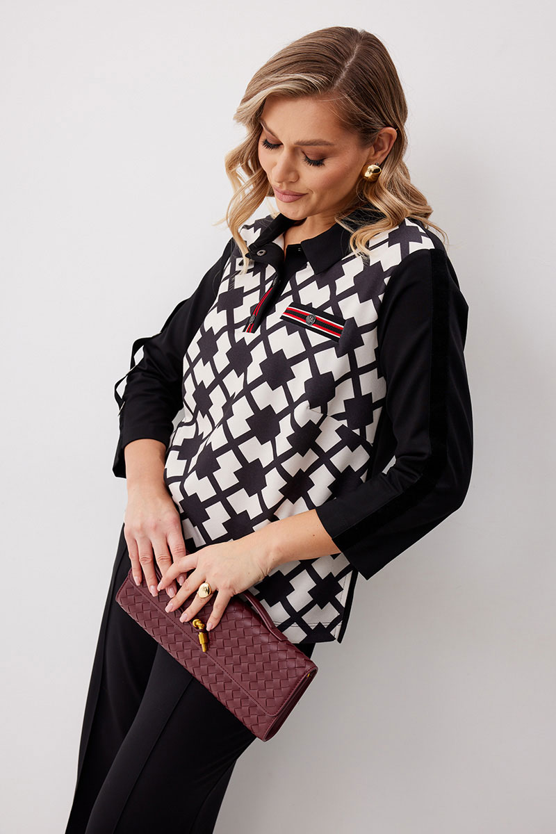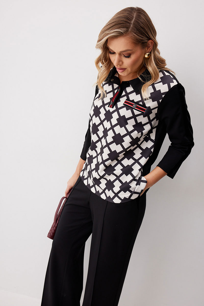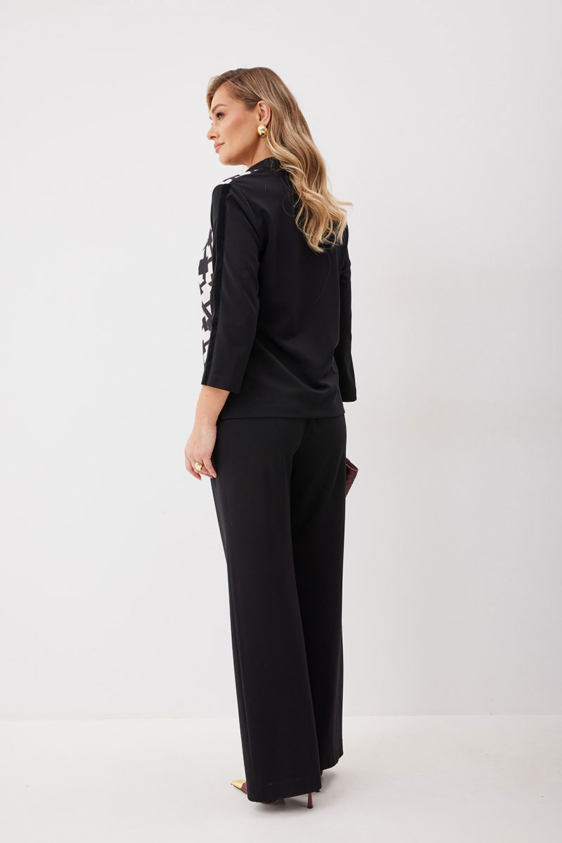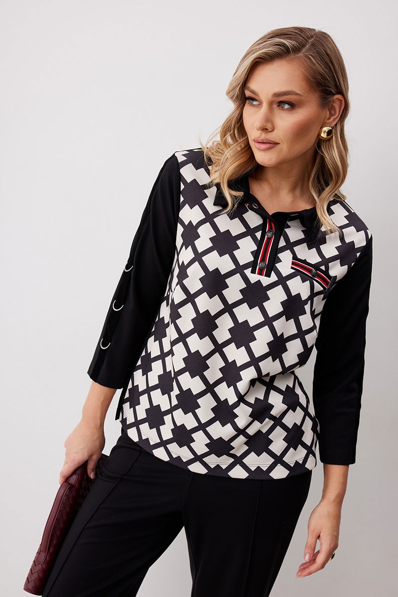 Костюм состоящий из блузы с брюками. Блуза по типу «поло» из трикотажной ткани длиной до середины бедра с застежкой до линии груди. Втачные планки обработаны декоративной тесьмой и застегиваются на кнопки. Перед выполнен из ткани с принтом. По левой половинке выполнен карман обманка с листочкой с декоративной тесьмой и кнопкой. Спинка прямая. Горловина обработана втачным воротником. Рукав ¾ прямой одношовный. На рукавах настрочена декоративная бархатная лента, на правом рукаве с тремя полукольцами. Брюки прямого силуэта из трикотажной ткани с поясом на частичной резинке. По передним половинкам брюк застрочены стрелки и выполнены наклонные карманы с отрезным бочком. Верх кармана декорирован бархатной тесьмой. По передним половинкам отстрочен гульфик (имитация). По спинке брюк застрочены вытачки.