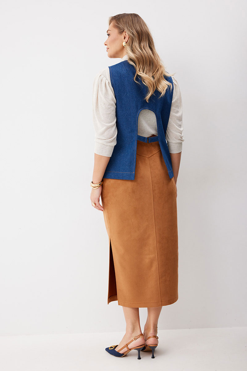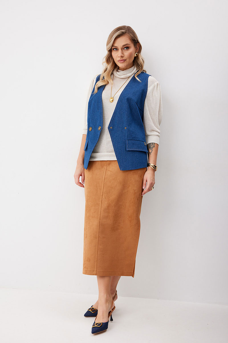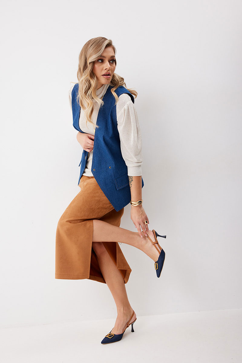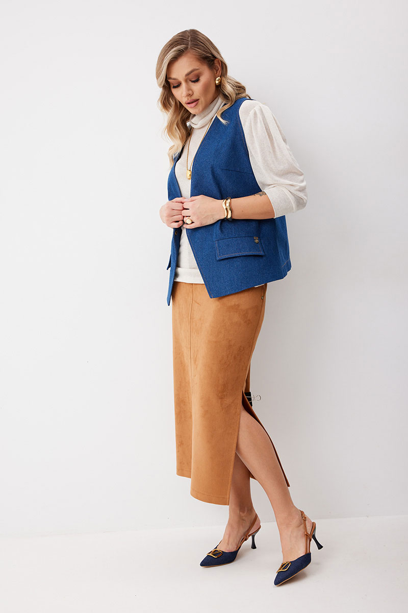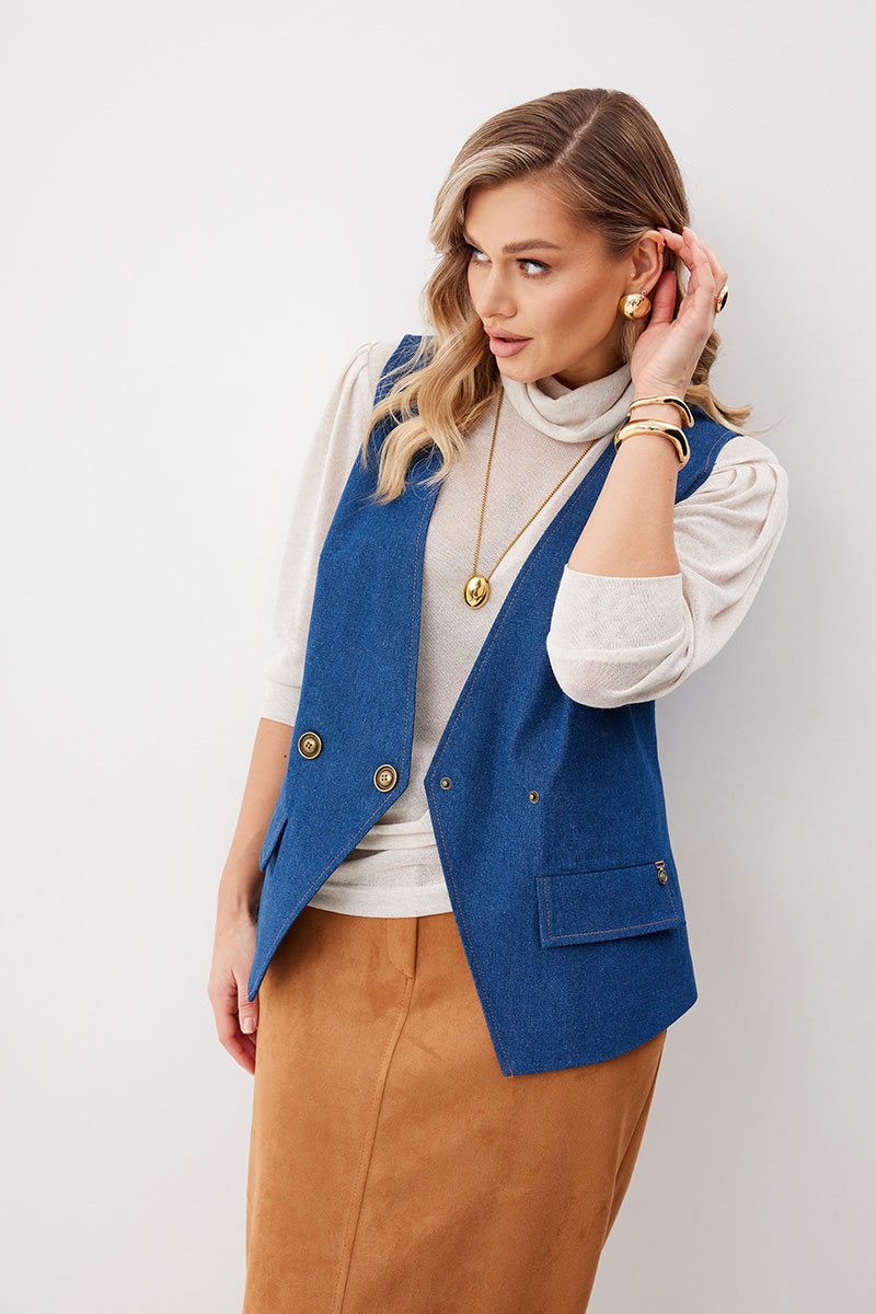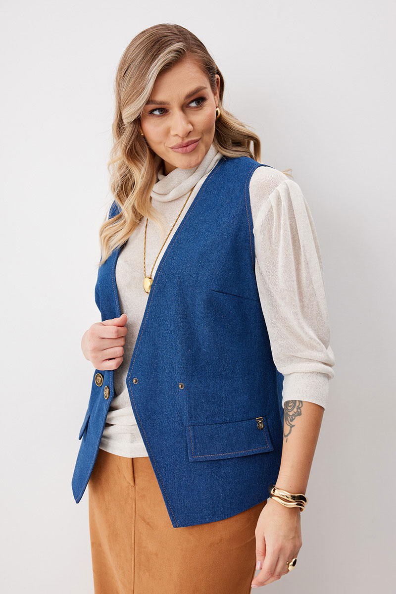 Жилет женский из джинсовой ткани на частичной подкладке. На передних половинках нагрудные вытачки и пропезные карманы с клапаном. Перед на подкладке, линия борта углом. Спинка с плечевыми вытачками имеет вырез по центру, с пояском по линии талии. Жилет застегивается на декоративные кнопки. Линия борта, горловины, вырез и низ на спинке отстрочен отделочными нитками.