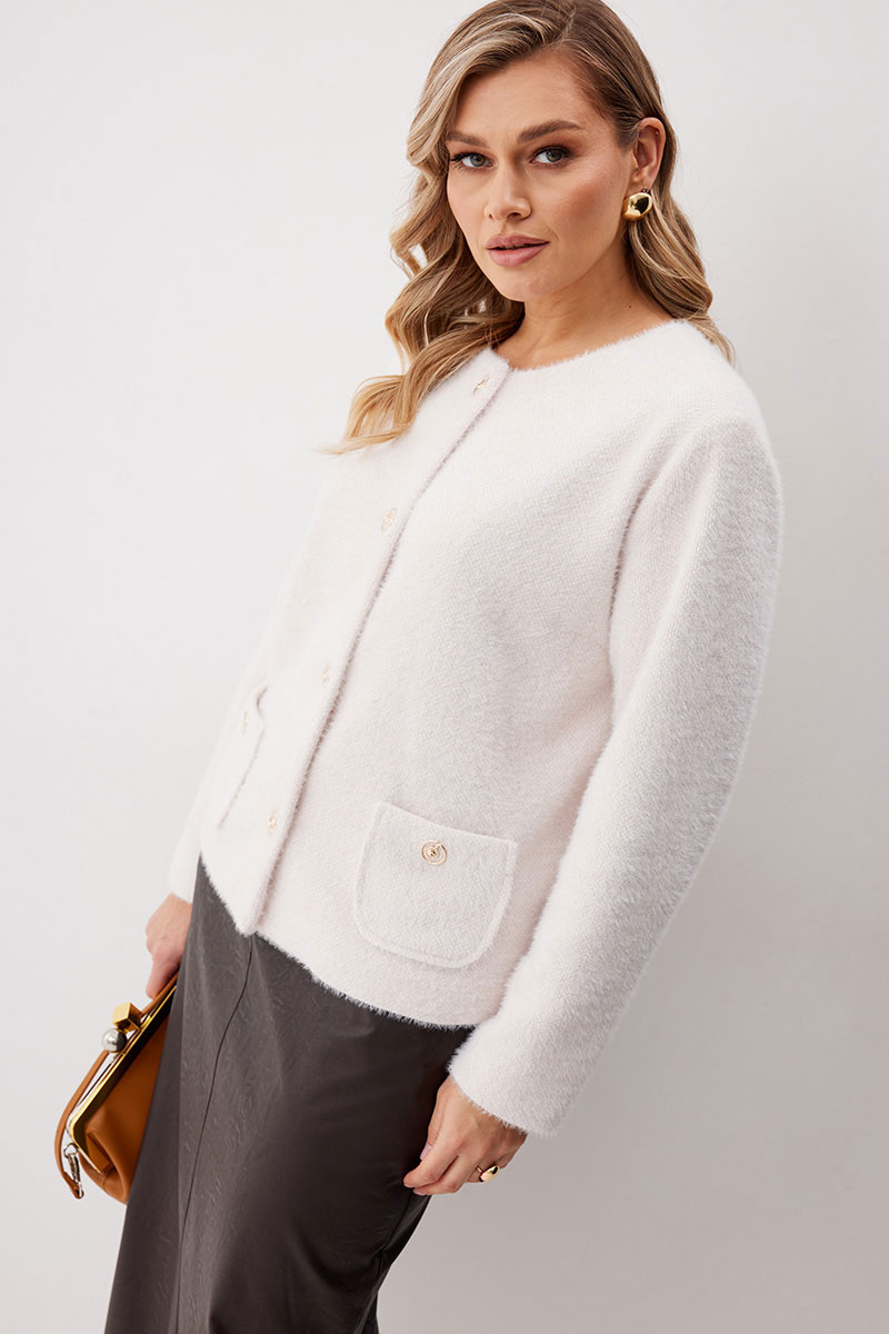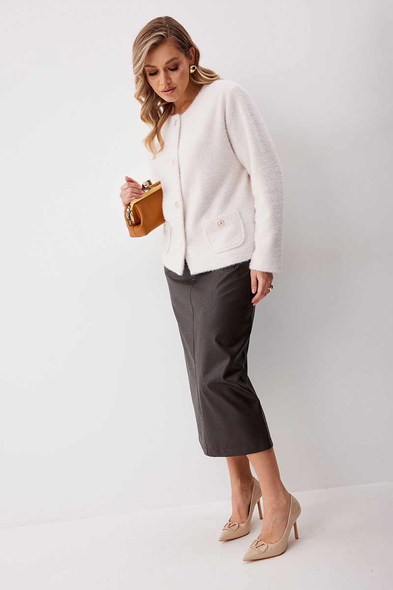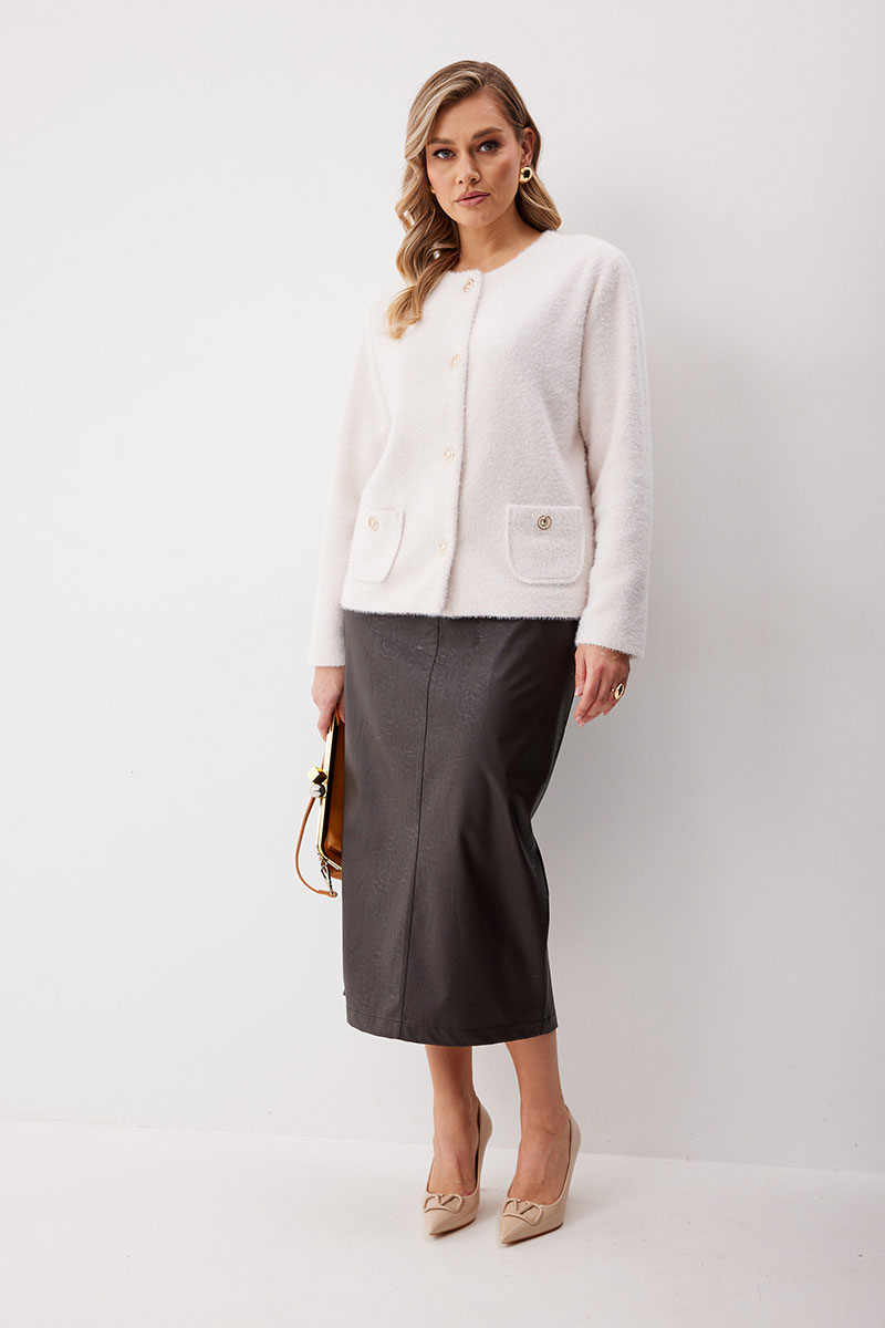 Жакет женский из трикотажной ткани прямого силуэта на подкладке. На деталях переда настрочены накладные карманы округлой формы застегивающиеся на декоративные кнопки. Спинка прямая. Рукав двухшовный с имитацией шлицы. Горловина округлой формы. Жакет застегивается на декоративные кнопки.