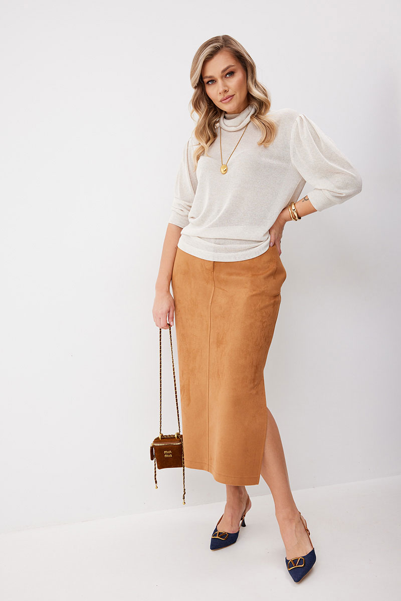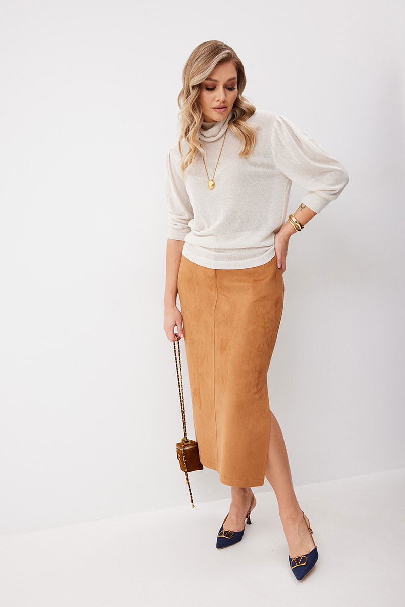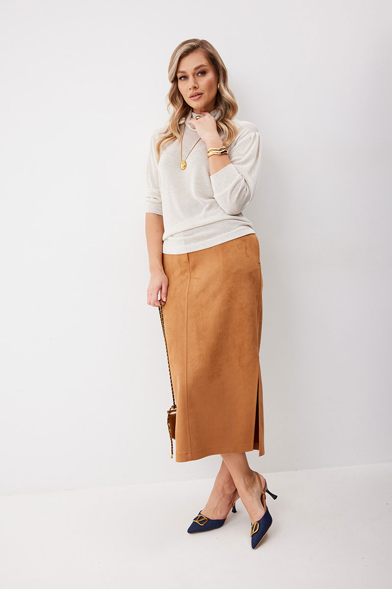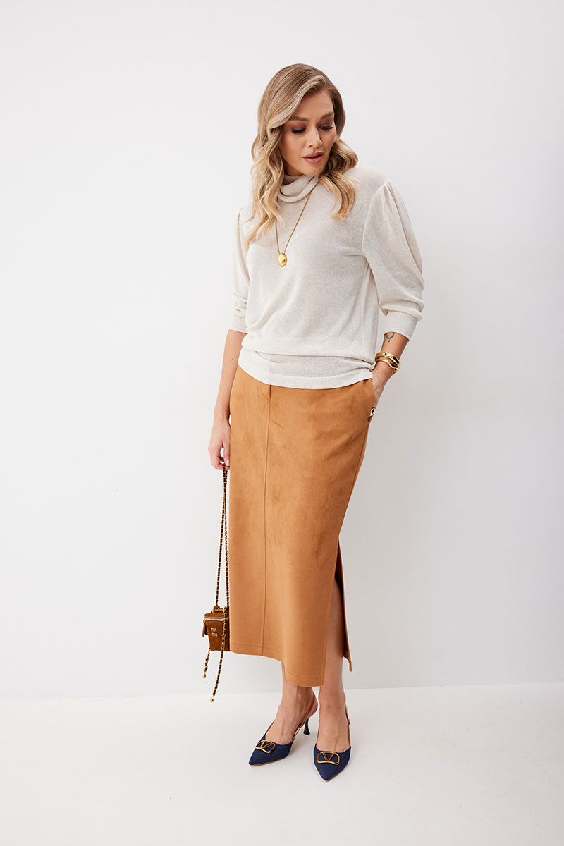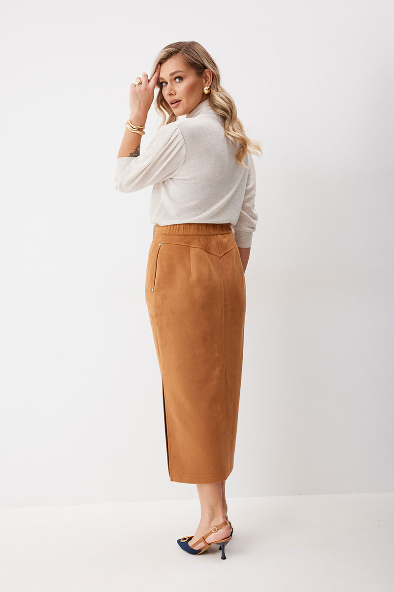 Юбка женская прямого силуэта. Перед со средним швом, в котором обработана застежка на молнию. Задняя половинка юбки со средним швом и кокеткой. В боковых швах обработаны карманы, в левом по низу разрез. Верх обработан притачным поясом (частично на резинке), застегивающимся на кнопку. Декоративные элементы и фурнитура могут отличаться от заявленных на фото. Цвет материала может отличаться по тону в зависимости от настроек вашего монитора!