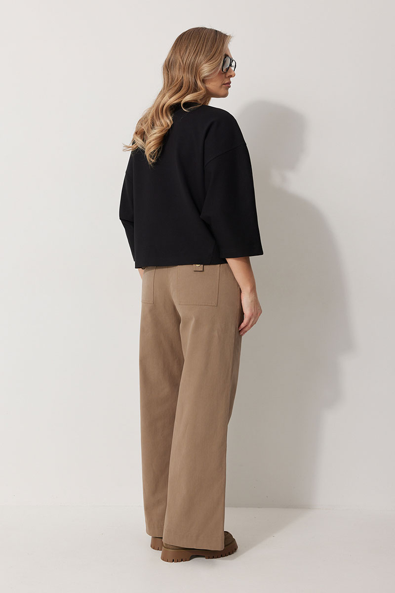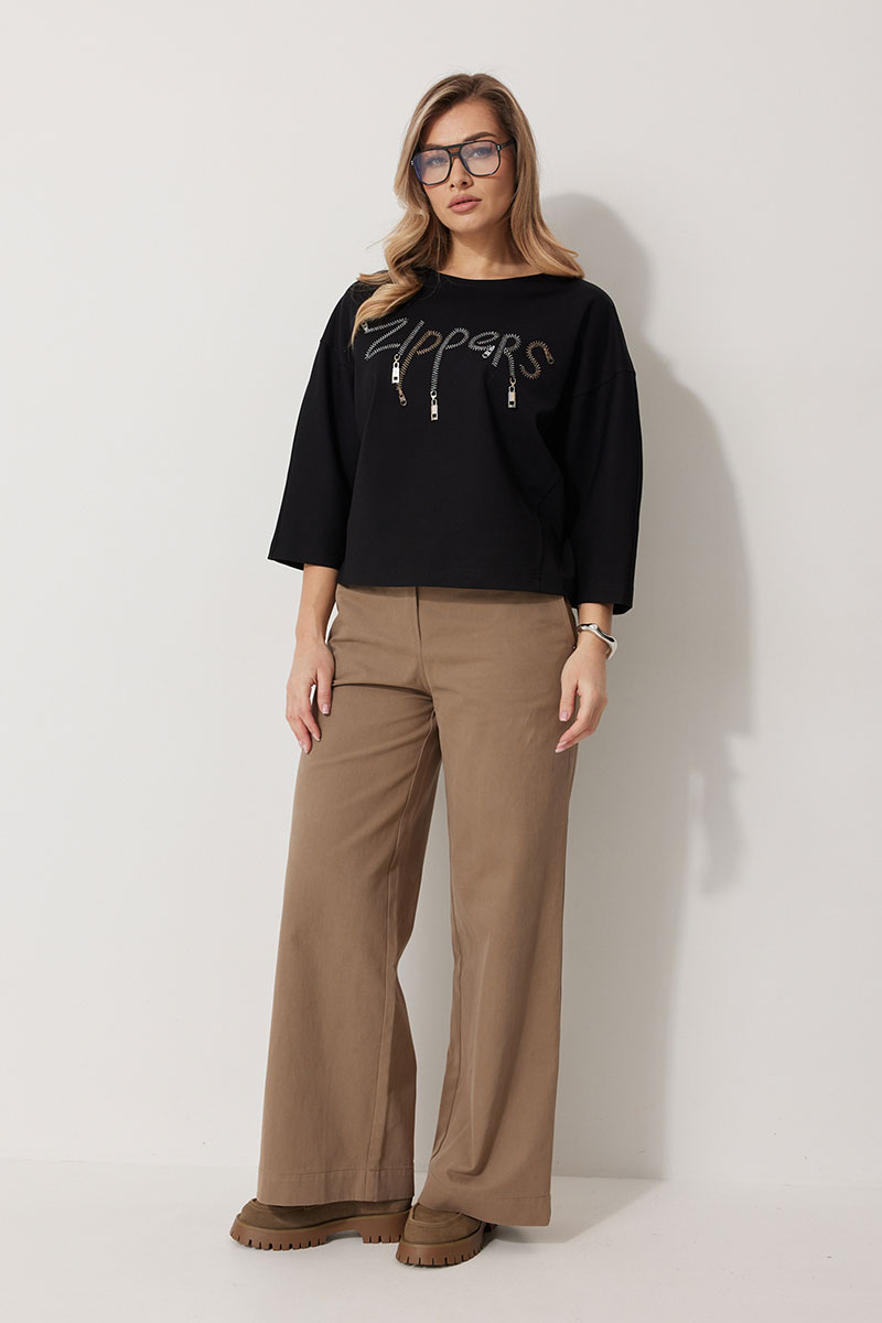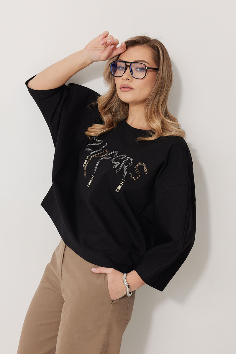Джемпер женский прямого силуэта «летучая мышь» с округлой горловиной и спущенной линией плеча. По переду в области груди расположена авторская вышивка с пришивным декором. Рукав двухшовный 3/4 соединен с отрезным бочком полочки и спинки.