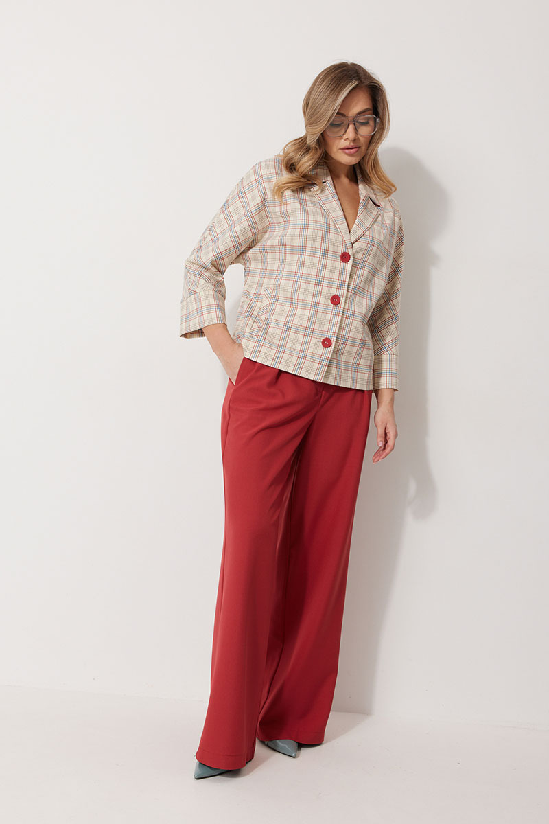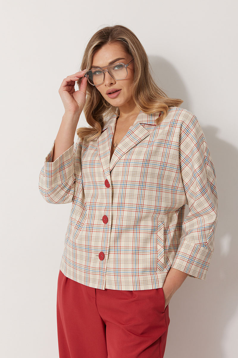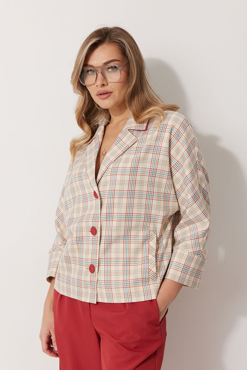 Жакет без подкладки, кроя «летучая мышь», с центральной однобортной застежкой на петли и пуговицы. По переду обработаны вертикальные прорезные карманы с листочкой. Спинка цельнокроеная. Горловина V-образной формы, обработана воротником пиджачного типа с контрастным кантом. Рукав 7/8, по низу обработан широкой притачной манжетой.