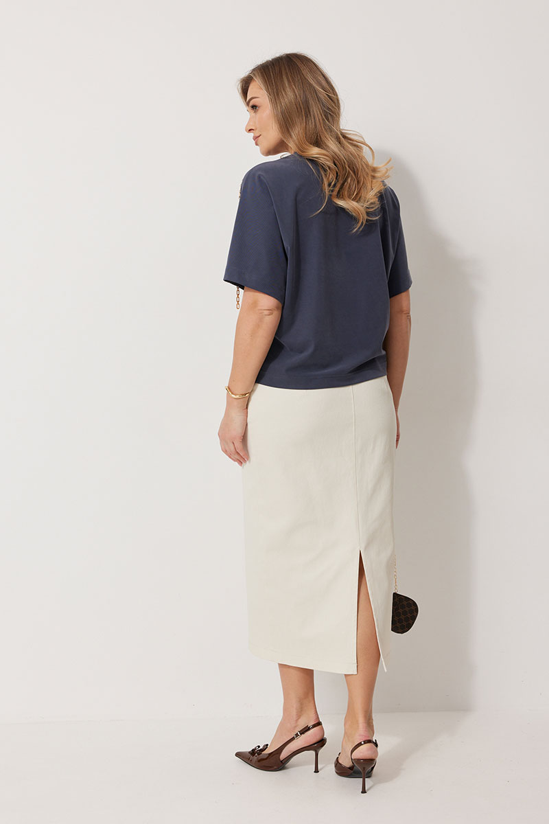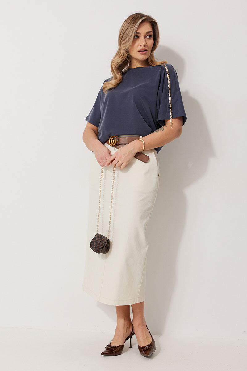 Джемпер женский прямого силуэта с цельнокроеным рукавом. Горловина имеет округлую форму, обработана притачной бейкой. На левом плече располагается притачная кокетка с декором.