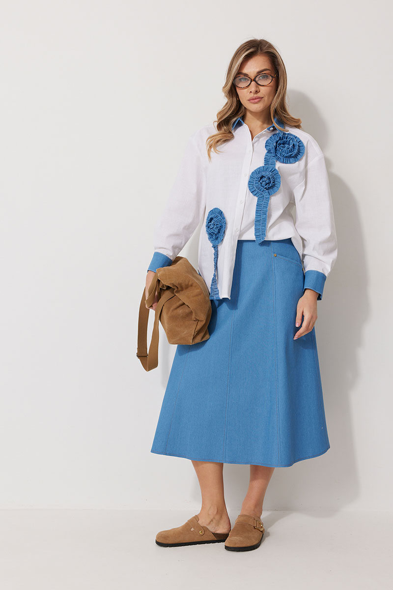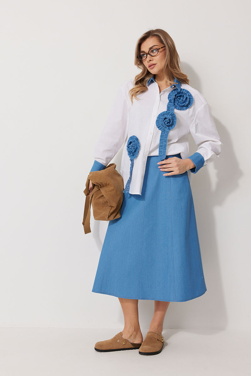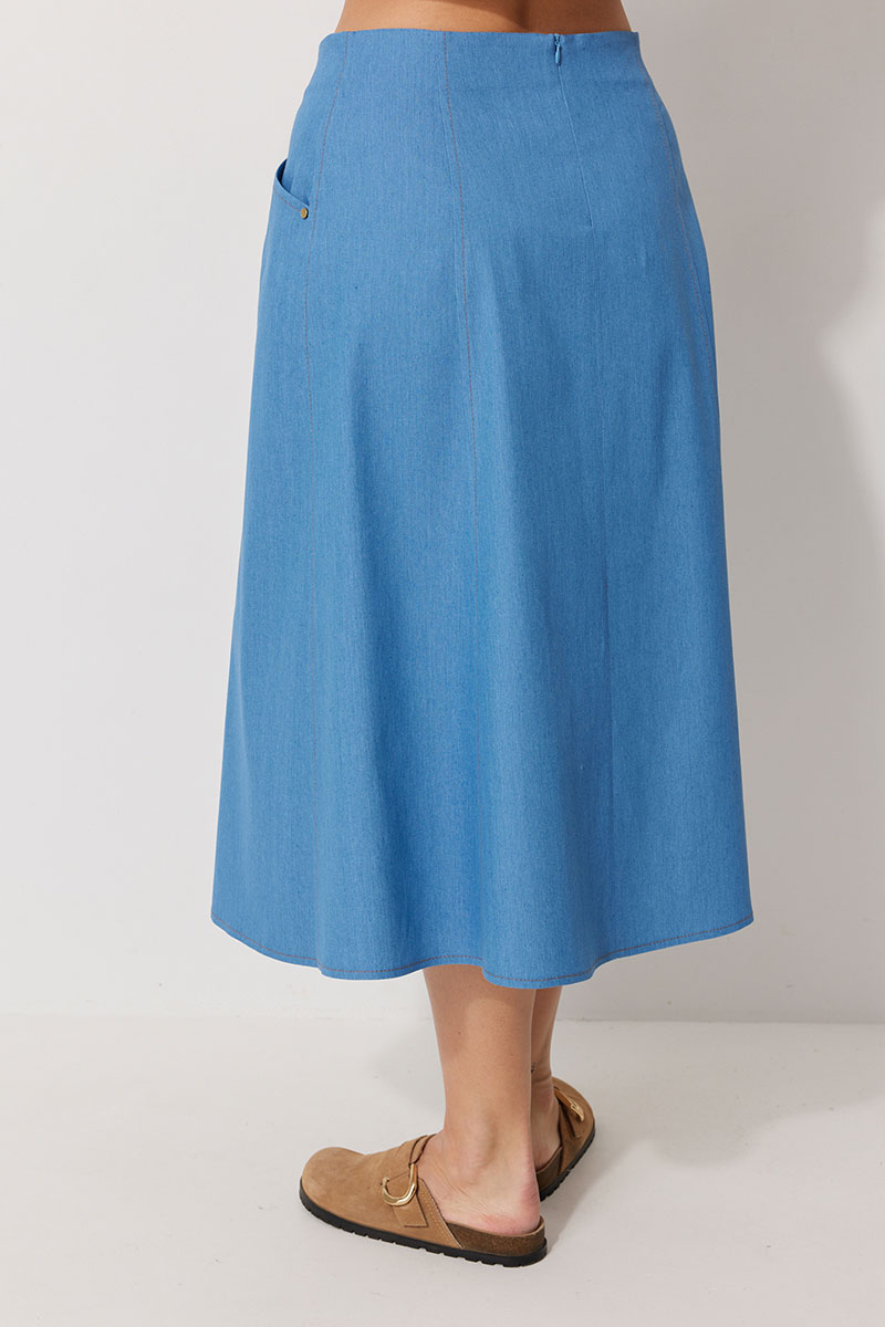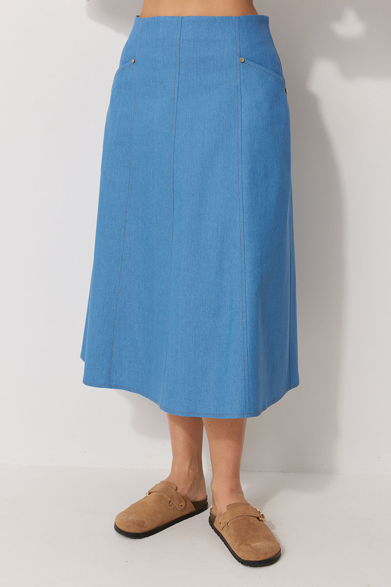Юбка женская А-силуэта длиной до середины икры. Перед юбки состоит из 4 клиньев. Вверху передней части юбки располагается карман с отрезным бочком с хольнитенами по концам крмана. Спинка юбки состоит из 4 клиньев. Швы всех клиньев отстрочены контрастной отделочной строчкой По среднему шву юбки находится застежка – молния. Верхний срез юбки обработан обтачкой.