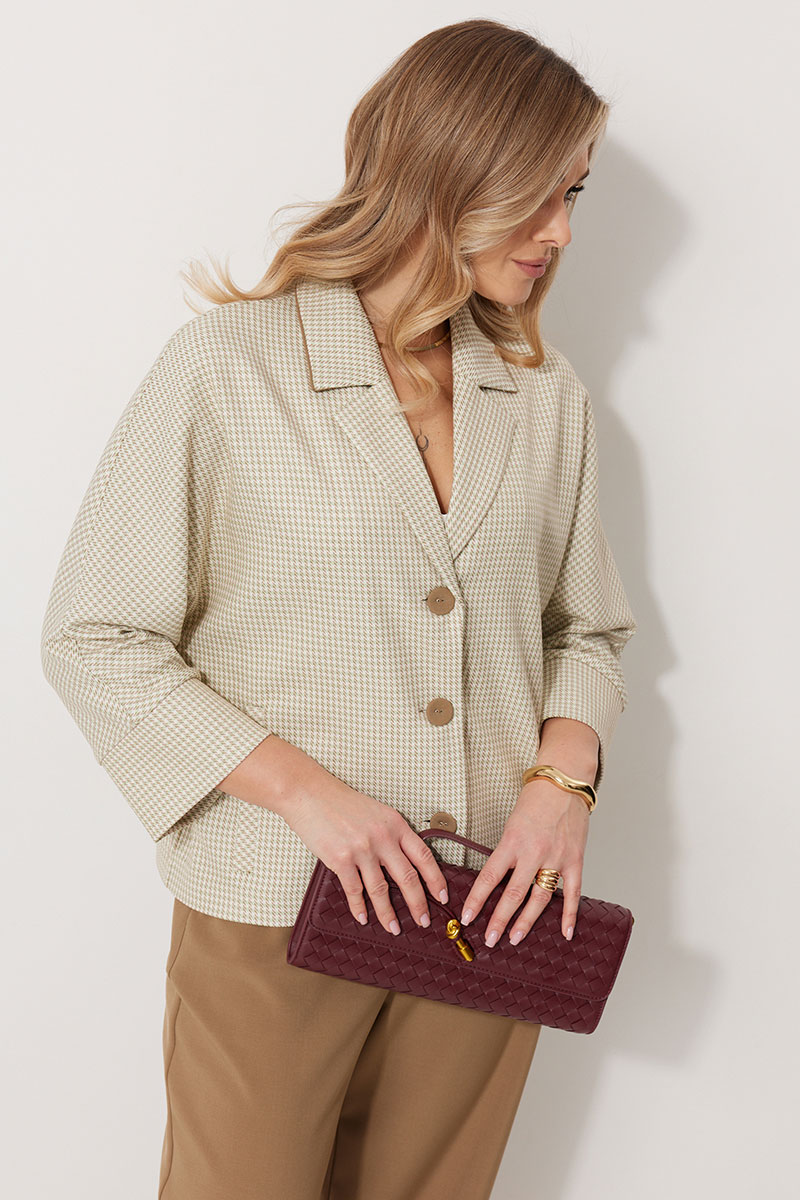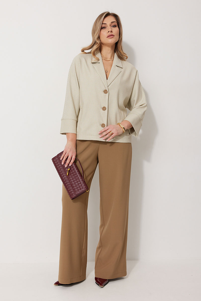 Жакет без подкладки, кроя «летучая мышь», с центральной однобортной застежкой на петли и пуговицы. По переду обработаны вертикальные прорезные карманы с листочкой. Спинка цельнокроеная. Горловина V-образной формы, обработана воротником пиджачного типа с контрастным кантом. Рукав 7/8, по низу обработан широкой притачной манжетой.