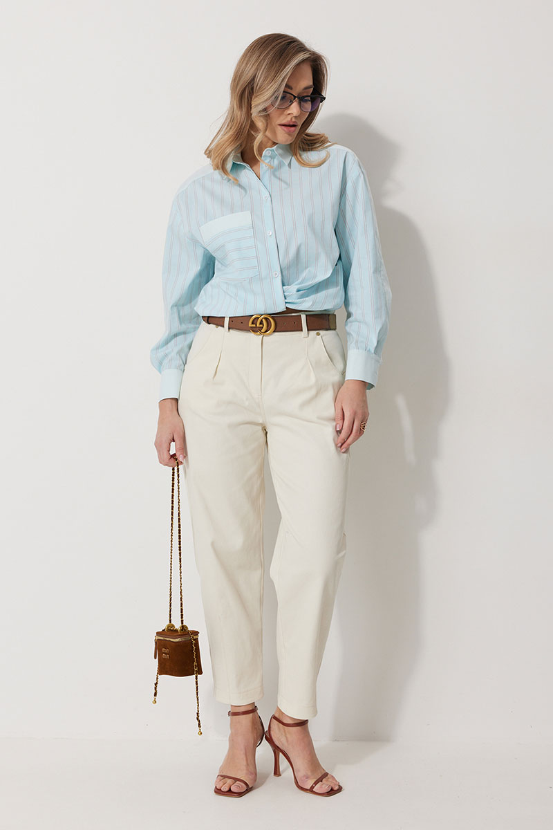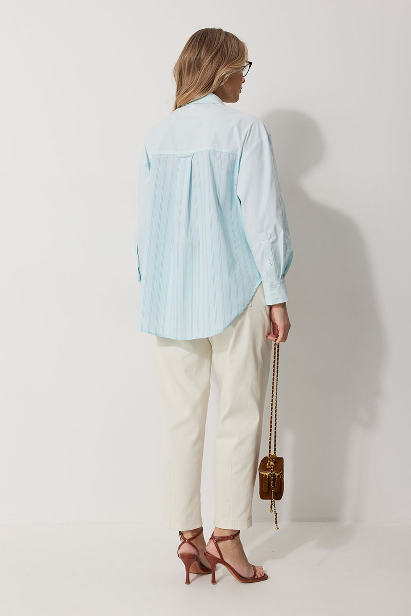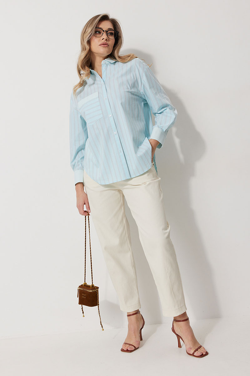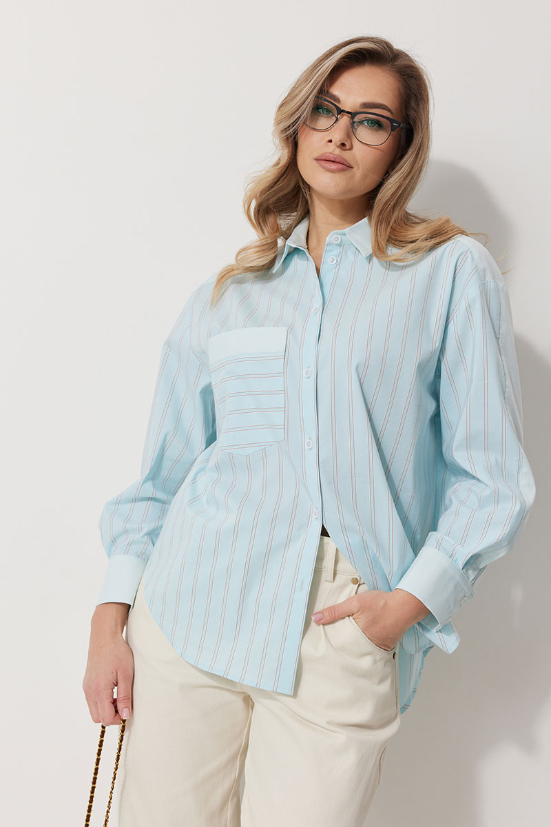 Блузка женская прямого силуэта. Полочки из ткани в полоску. На правой полочке настрочен накладной карман с комбинацией тканей. Перед обработан цельнокроеными планками с центральной застежкой на петли и пуговицы. Спинка из ткани в полоски с кокеткой из ткани компаньона. По верхней части спинки заложена бантовая складка. Плечо спущено. Рукав длинный, двухшовный. Одна часть рукава из ткани в полоску, другая из ткани компаньона. Рукав по низу со складкой, обработан широкой притачной манжетой застегивающейся на петли и пуговицы. Разрез рукава обработан притачными отрезными планками. Манжета и притачные планки из ткани компаньона. Низ разноуровневый, закругленной формы. Горловина обработана воротником рубашечного типа с отрезной стойкой из ткани компаньона.