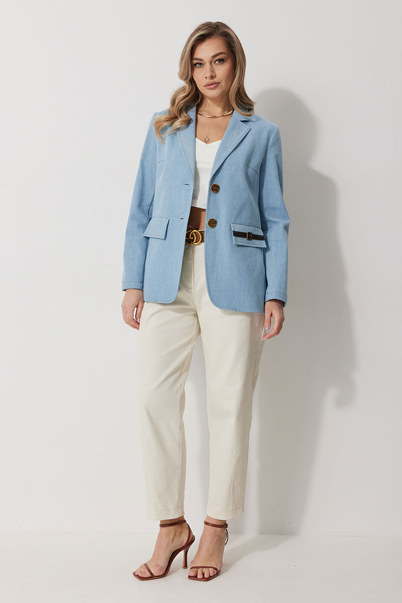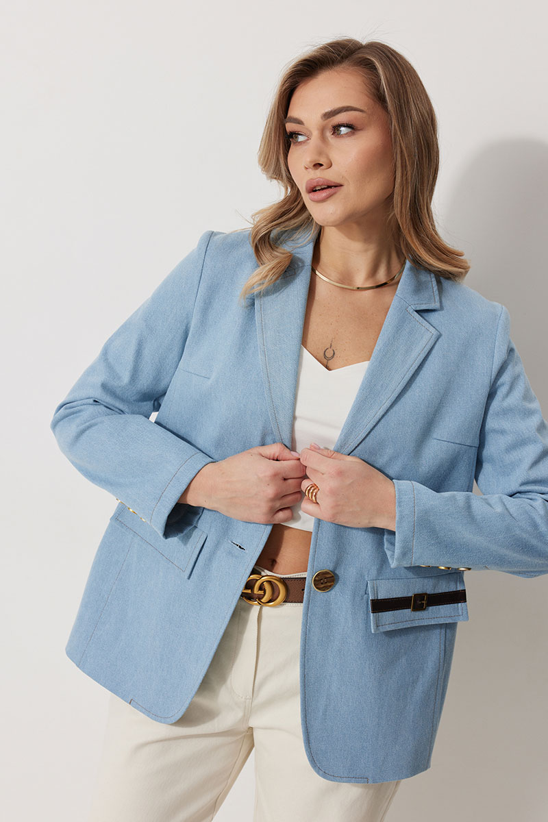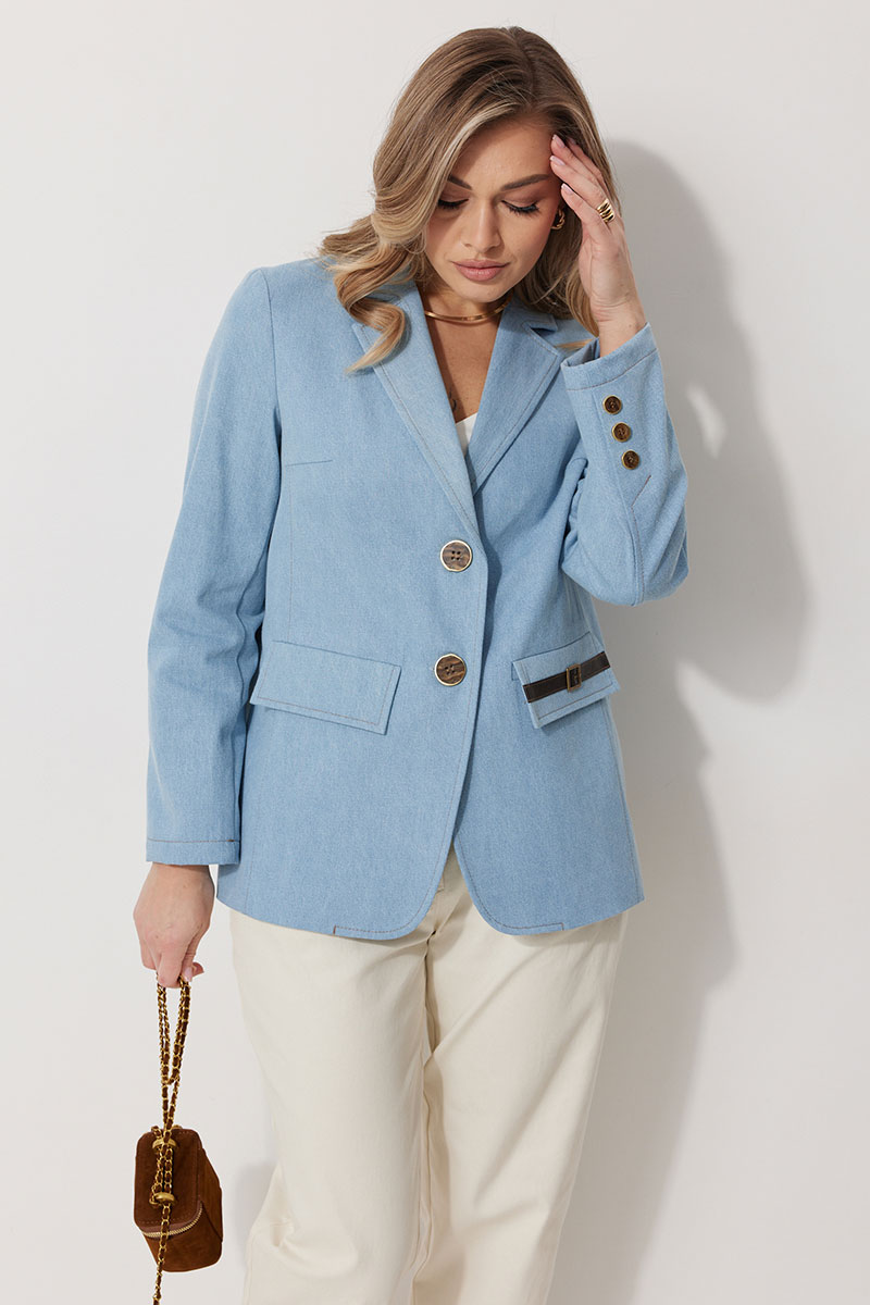 Жакет женский прямого силуэта на частичной контрастной подкладке. Жакет однобортный, длинной до середины бедра с округлой формой борта. Полочка с отрезными бочками и вытачкой. В нижней части расположены прорезные карманы с клапаном. На левом клапане расположен декоративный элемент. Спинка с отрезными бочками и отрезной кокеткой. Рукав втачной, полной длинны. По низу рукава обработана имитация шлицы с отделочными строчками и декоративными пуговицами. Воротник в жакете втачной с отрезной стойкой и лацканами. Жакет застегивается на петли и отделочные пуговицы. По воротнику, лацкану, борту, клапанам и швам спинки и полочки прострочены отделочные строчки.