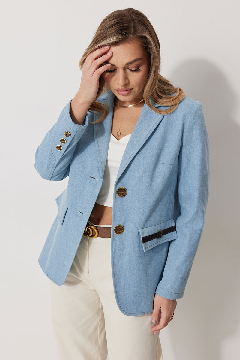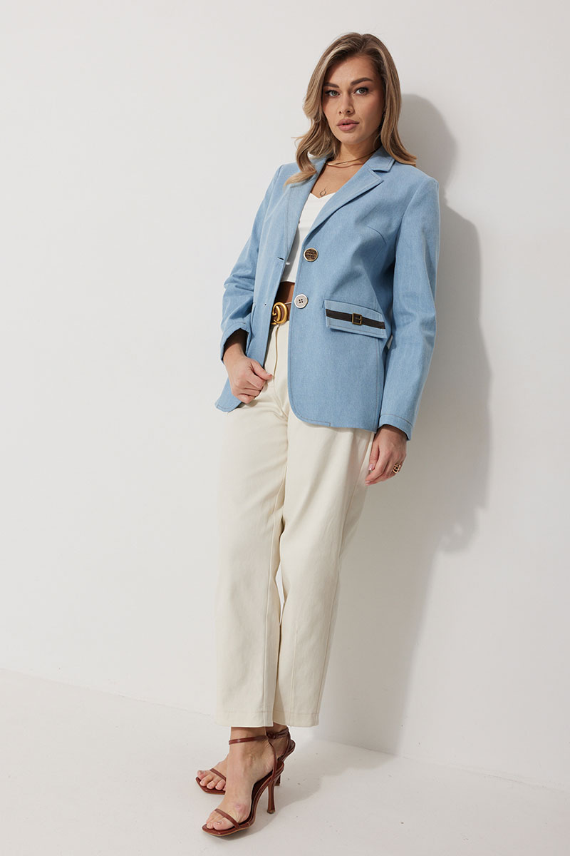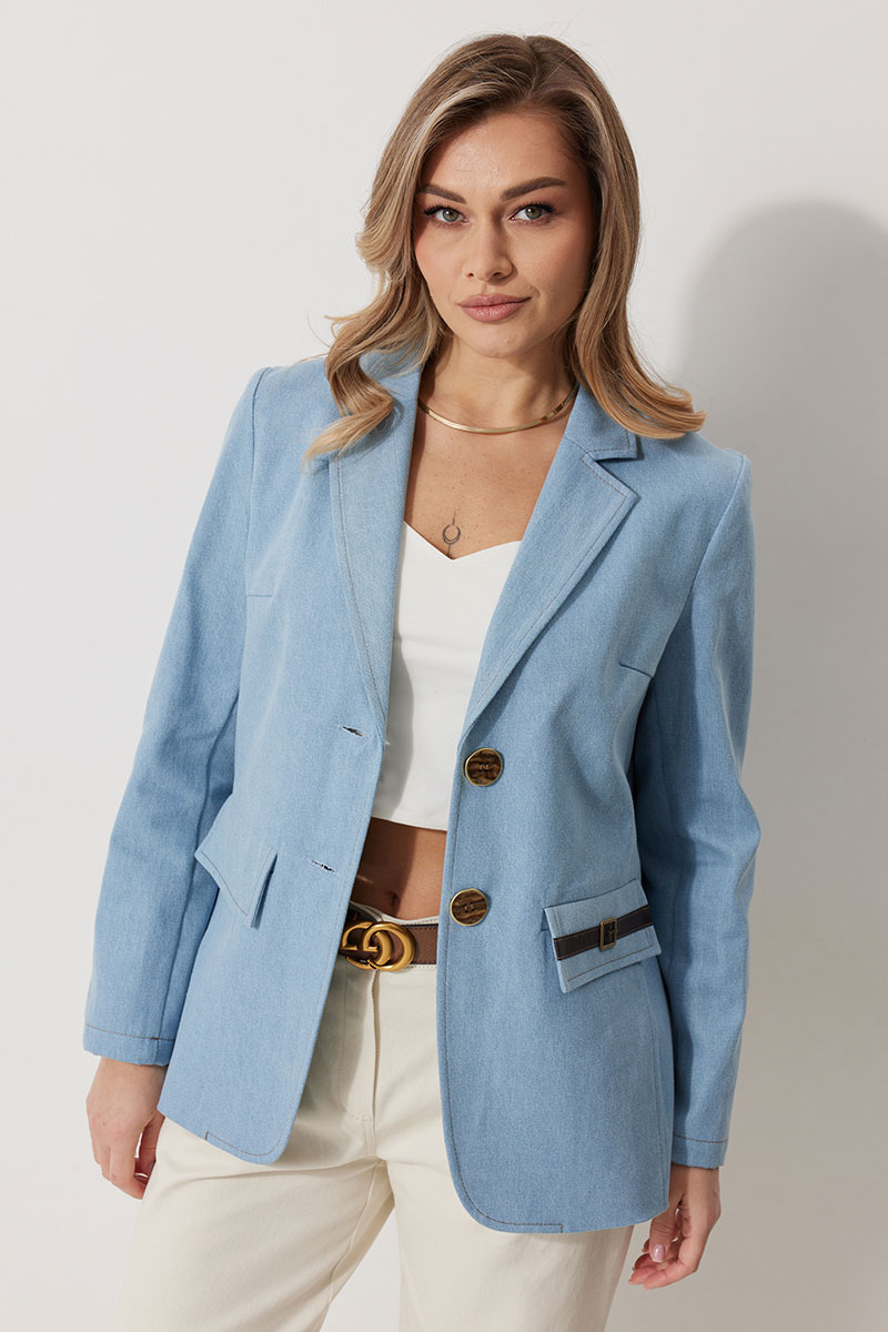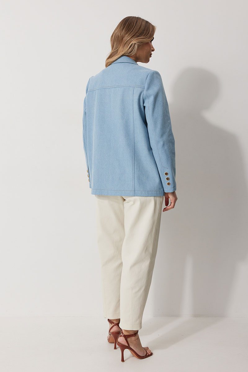 Жакет женский прямого силуэта на частичной контрастной подкладке. Жакет однобортный, длинной до середины бедра с округлой формой борта. Полочка с отрезными бочками и вытачкой. В нижней части расположены прорезные карманы с клапаном. На левом клапане расположен декоративный элемент. Спинка с отрезными бочками и отрезной кокеткой. Рукав втачной, полной длинны. По низу рукава обработана имитация шлицы с отделочными строчками и декоративными пуговицами. Воротник в жакете втачной с отрезной стойкой и лацканами. Жакет застегивается на петли и отделочные пуговицы. По воротнику, лацкану, борту, клапанам и швам спинки и полочки прострочены отделочные строчки.