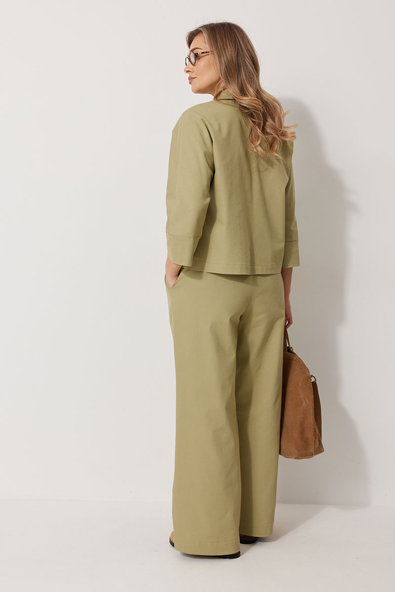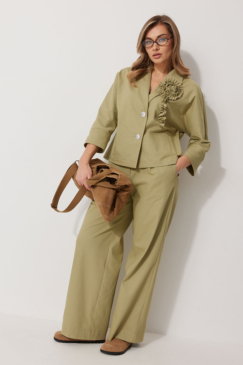 Жакет без подкладки, кроя «летучая мышь», с центральной однобортной застежкой на петли и пуговицы. По переду обработаны вертикальные прорезные карманы с листочкой. Спинка цельнокроеная, слева расположен декор в виде авторской броши. Горловина V-образной формы, обработана воротником пиджачного типа. Рукав 7/8, по низу обработан широкой притачной манжетой.