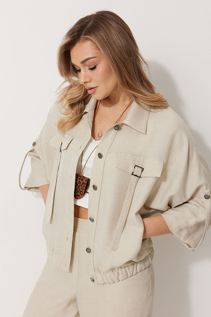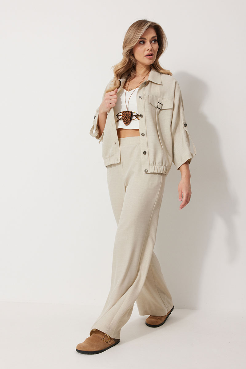 Костюм женский, состоящий из жакета и брюк. Жакет без подкладки, кроя «летучая мышь» длиной до линии бедра. По переду отрезные бочки с карманами «в шве». В шве кокетки полочки располагаются клапаны с декоративными элементами и хлястиком. Спинка с отрезными бочками и кокеткой. Рукав цельнокроеный 7/8длины, состоящий из четырех частей с патой по низу , застегивающейся на петлю и пуговицу. Низ жакета обработан резинкой. Застежка центральная на отрезные планки, застегивающиеся на петли и пуговицы. Горловина обработана втачным воротником с цельнокроеной стойкой. Брюки женские, прямого силуэта. По переду обработана имитация застежки. Карманы расположены в боковом шве. На задних половинках брюк застрочены вытачки. Верх обработан притачным поясом (частично на резинке).