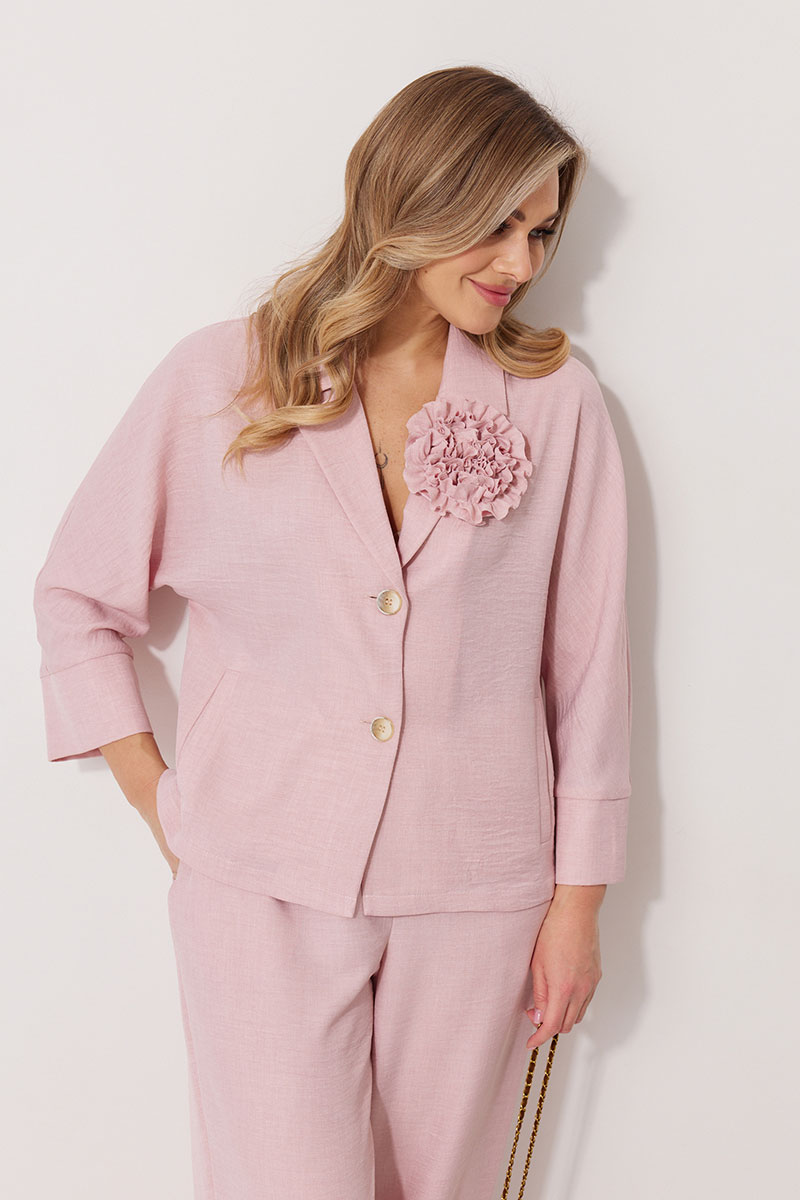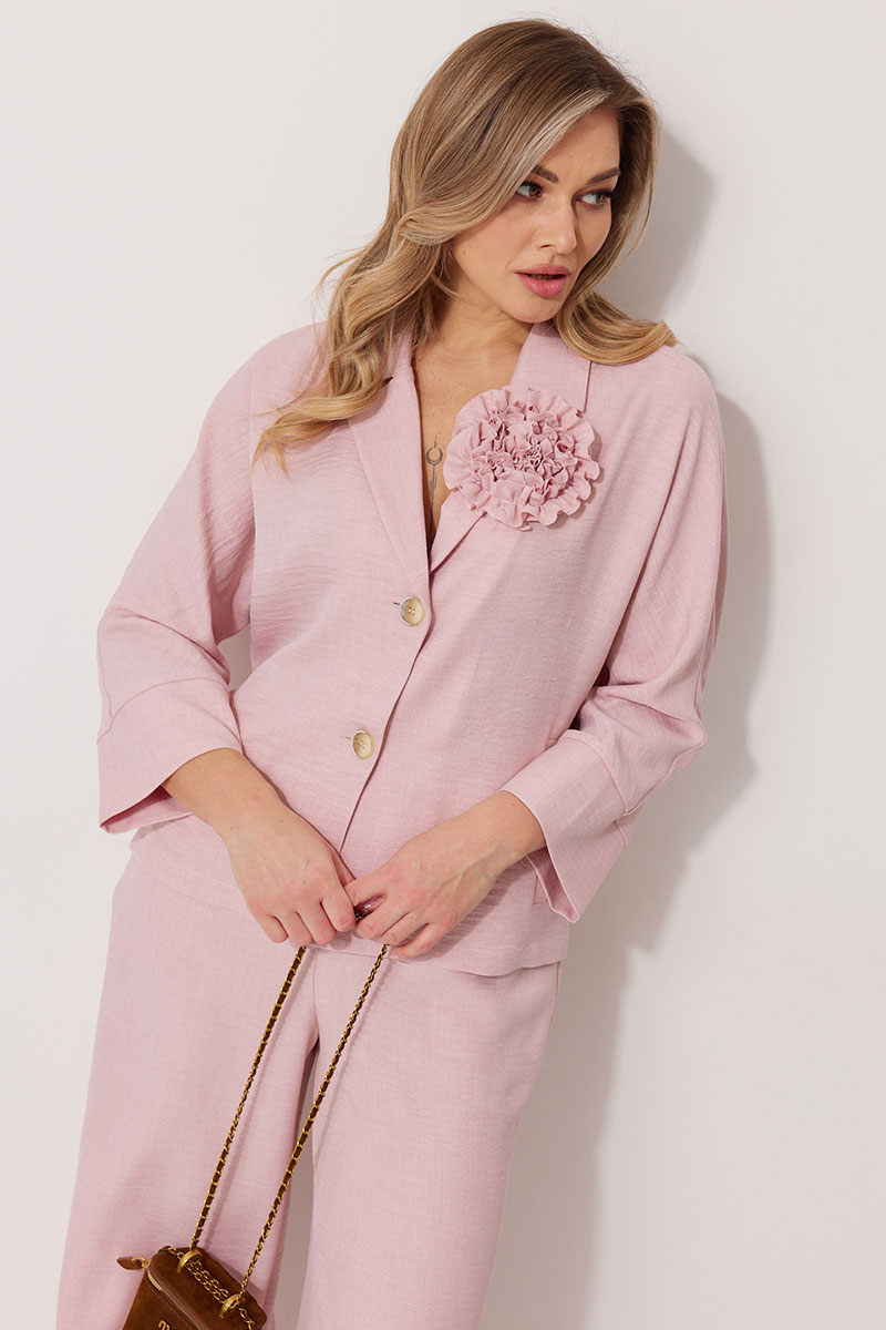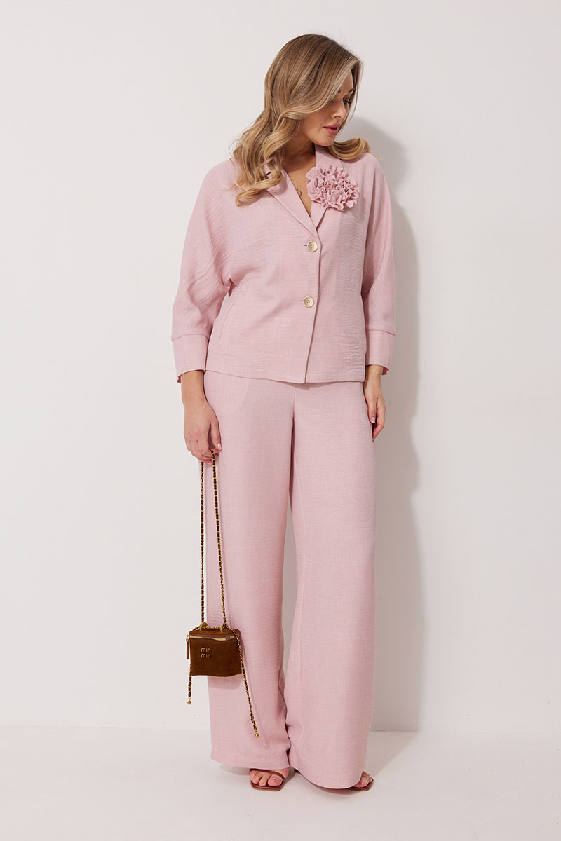 Костюм женский, состоящий из жакета и брюк. Жакет без подкладки, кроя «летучая мышь», с центральной однобортной застежкой на петли и пуговицы. По переду обработаны вертикальные прорезные карманы с листочкой. Спинка цельнокроеная, слева расположен декор в виде авторской броши. Горловина V-образной формы, обработана воротником пиджачного типа. Рукав 7/8, по низу обработан широкой притачной манжетой. Брюки женские, расширенные. По переду обработана застежка на молнию, обработаны карманы с наклонным входом. На задних половинках брюк застрочены вытачки. Верх обработан широким притачным поясом (частично на резинке), застегивающимся на петлю и пуговицу.