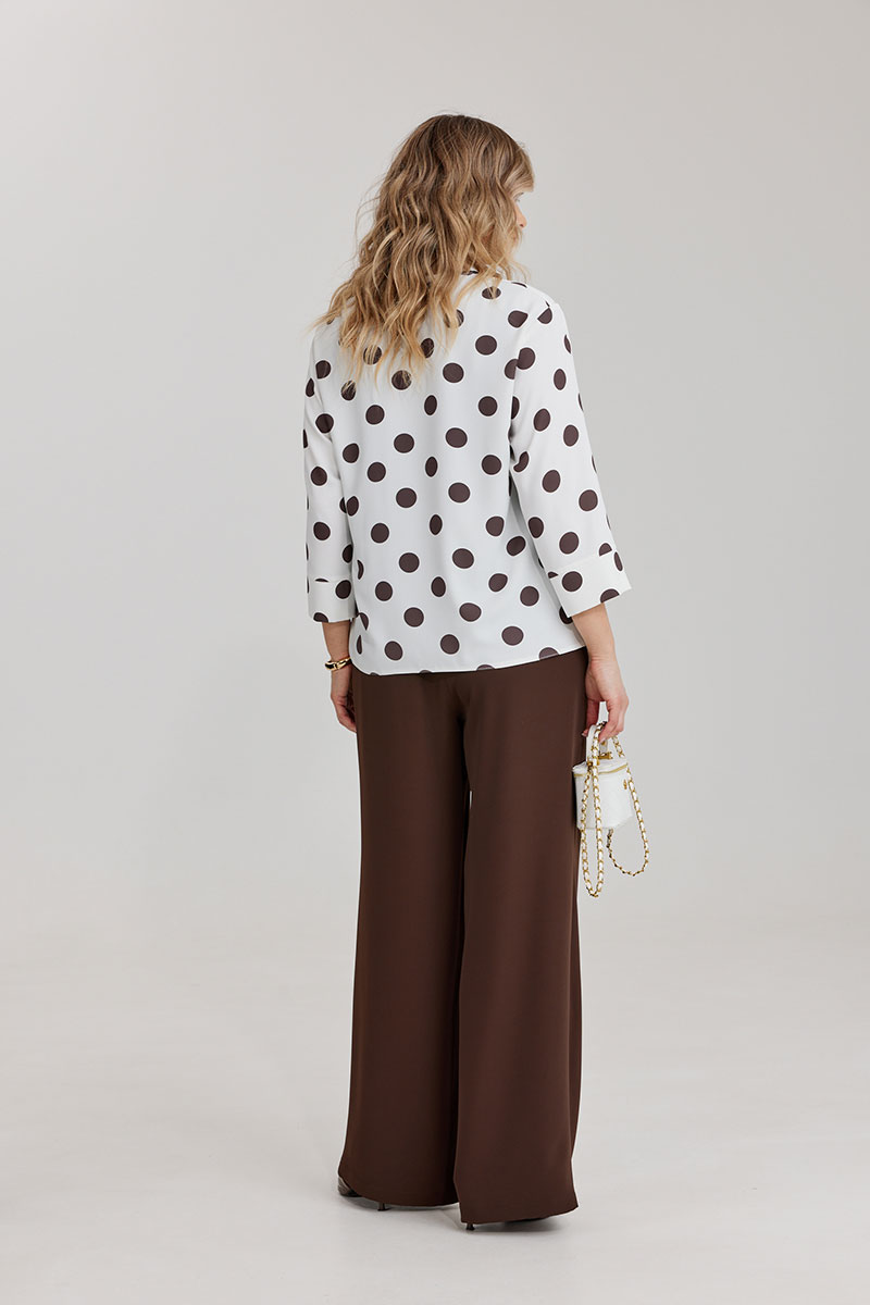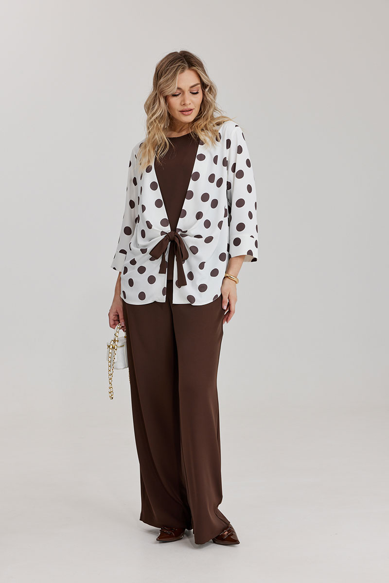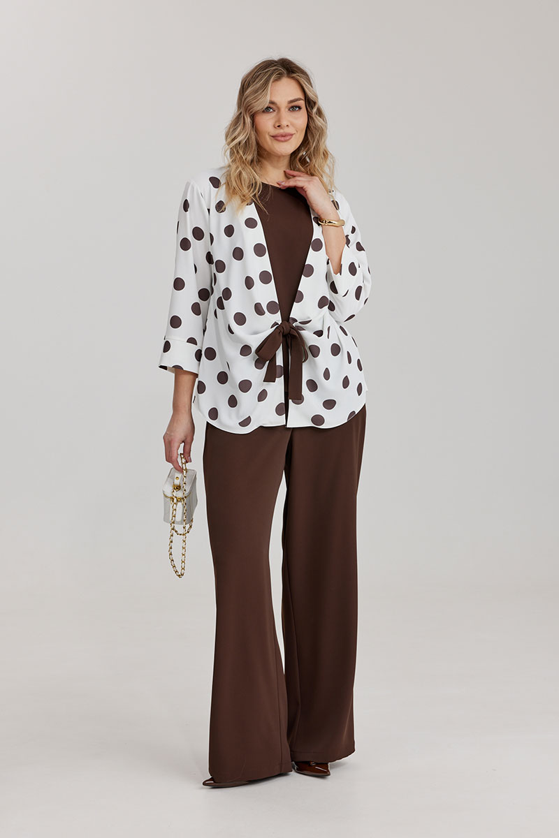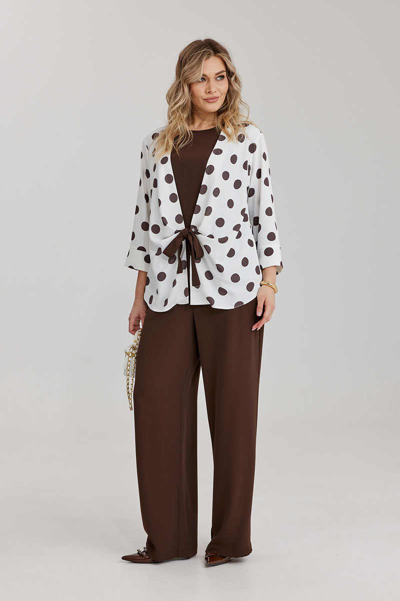 Костюм женский из плательно-костюмной струящейся ткани, состоящий из брюк, топа и блузона Брюки длинные, свободного кроя, с широкими штанинами, мягко струятся по фигуре, создавая элегантный силуэт. По передней части брюк расположена застёжка на молнию и пуговицу на поясе. По задней части пояса имеется резинка, обеспечивающая комфортную посадку и удобство в носке. Топ А-силуэта с округлой горловиной, выполнен из однотонной ткани. Модель свободно ниспадает от линии груди, обеспечивая комфорт и лёгкость в носке, и гармонично дополняет комплект. Блузон свободного силуэта выполнен из ткани с контрастным принтом «горох». Модель с втачным рукавом длиной 3/4. Передняя часть оформлена завязками, которые позволяют регулировать посадку и подчеркивать линию талии. Легкая струящаяся ткань придает изделию изящность и комфорт при носке. Костюм подходит как для повседневных образов, так и для более нарядных выходов.
