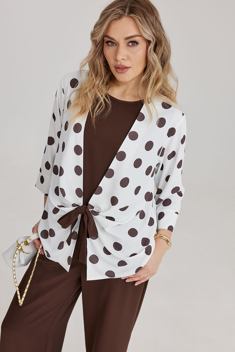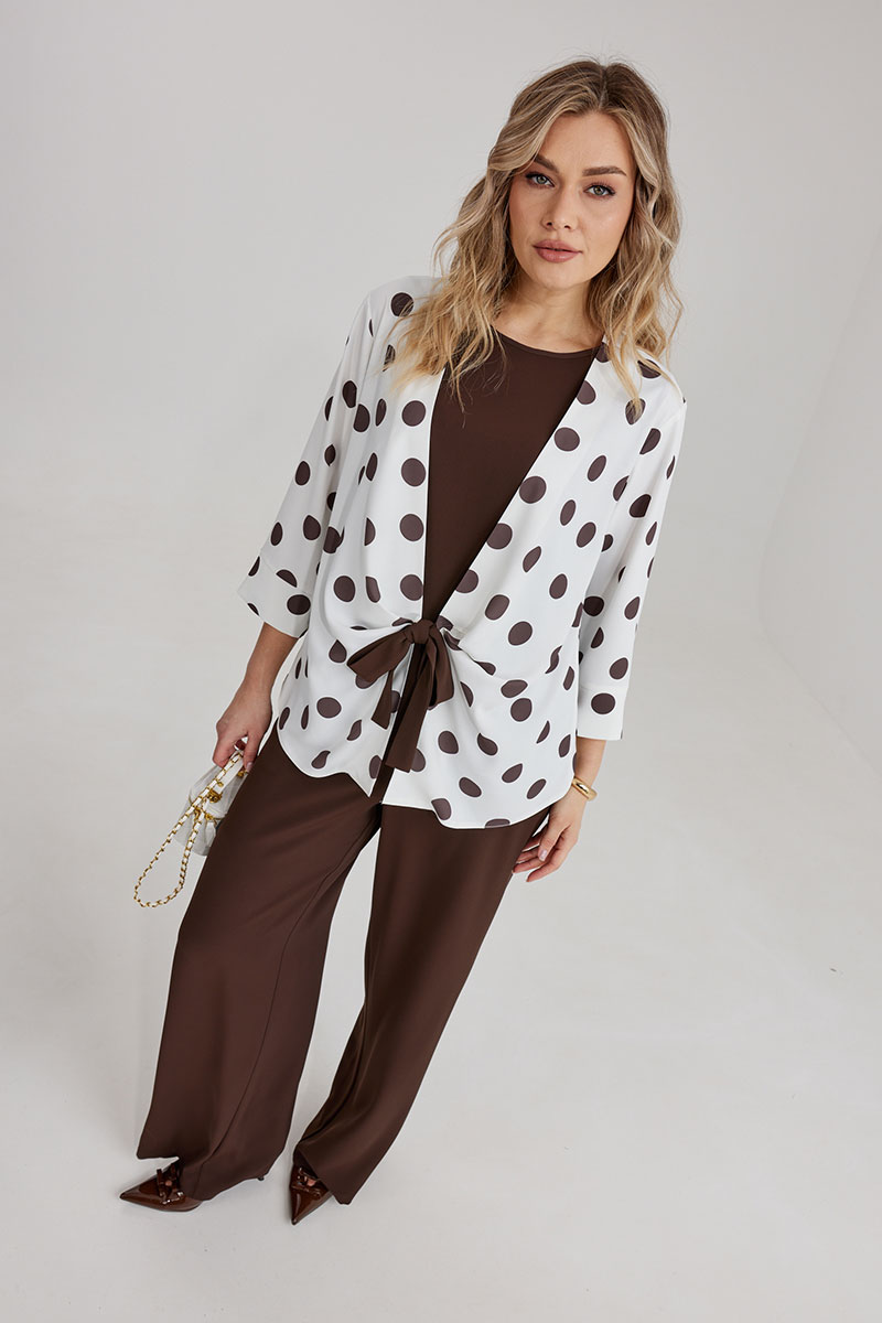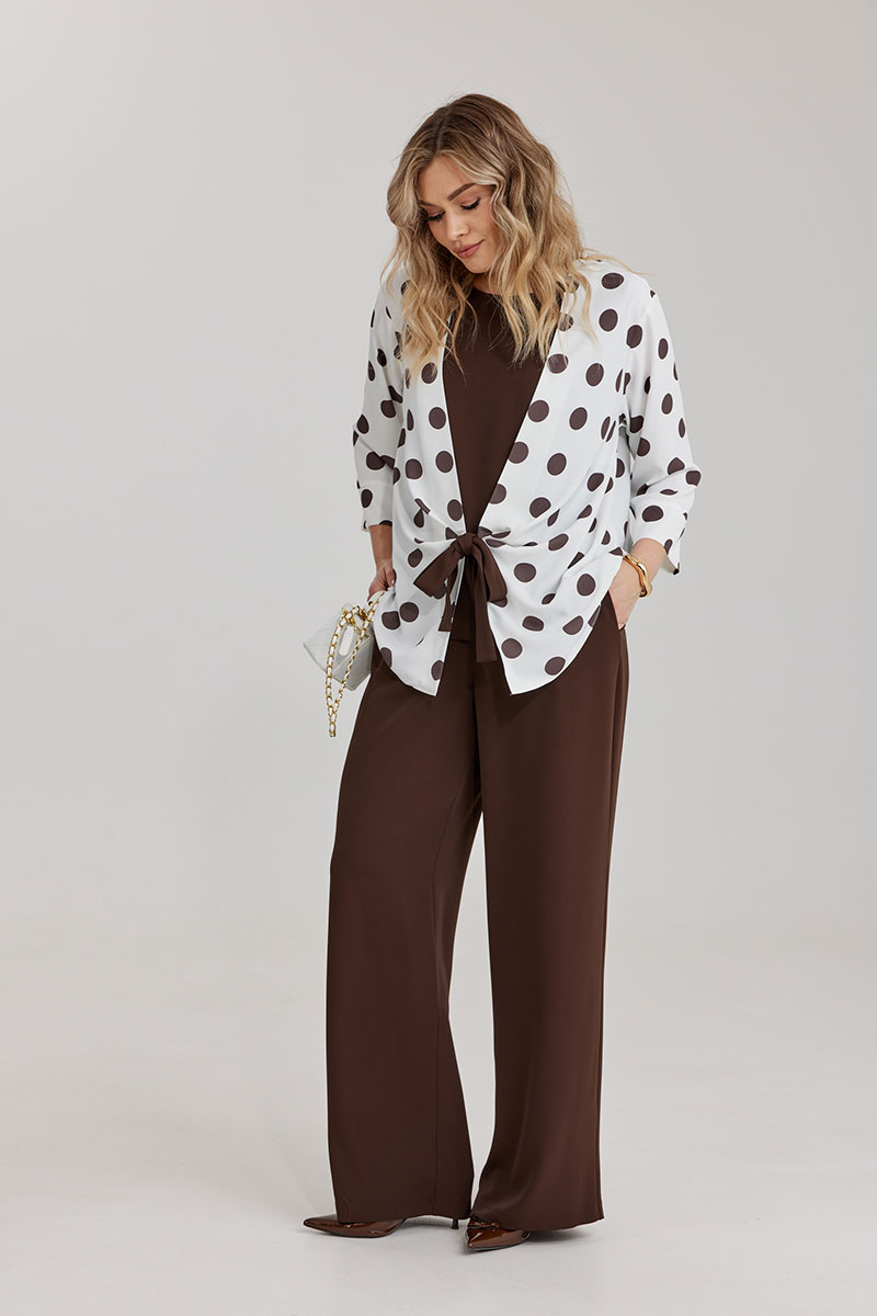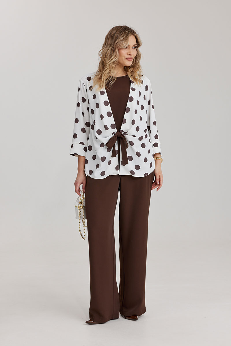 Костюм женский из плательно-костюмной струящейся ткани, состоящий из брюк, топа и блузона Брюки длинные, свободного кроя, с широкими штанинами, мягко струятся по фигуре, создавая элегантный силуэт. По передней части брюк расположена застёжка на молнию и пуговицу на поясе. По задней части пояса имеется резинка, обеспечивающая комфортную посадку и удобство в носке. Топ А-силуэта с округлой горловиной, выполнен из однотонной ткани. Модель свободно ниспадает от линии груди, обеспечивая комфорт и лёгкость в носке, и гармонично дополняет комплект. Блузон свободного силуэта выполнен из ткани с контрастным принтом «горох». Модель с втачным рукавом длиной 3/4. Передняя часть оформлена завязками, которые позволяют регулировать посадку и подчеркивать линию талии. Легкая струящаяся ткань придает изделию изящность и комфорт при носке. Костюм подходит как для повседневных образов, так и для более нарядных выходов.