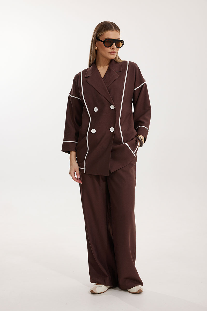 Жакет женский двубортный без подкладки прямого силуэта со спущенной линией плеча длиной за линию бедра. Перед жакета состоит из центральной и боковой части, между ними вставлен контрастного цвета отделочный кант. Спинка состоит из центральной и боковых деталей, в швах располагаются детали канта, контрастного цвета. Рукав втачной одношовный, по низу рукава пришита отрезная манжета, в швах располагается контрастный кант. Горловина обработана отрезным воротником с лацканом. Застежка двубортная на отделочные контрастные пуговицы. Брюки прямого силуэта с карманами в боковом шве и имитацией гульфика. На задних половинках брюк застрочены вытачки. Пояс притачной на резинке со шнуром в цвет отделочного канта.