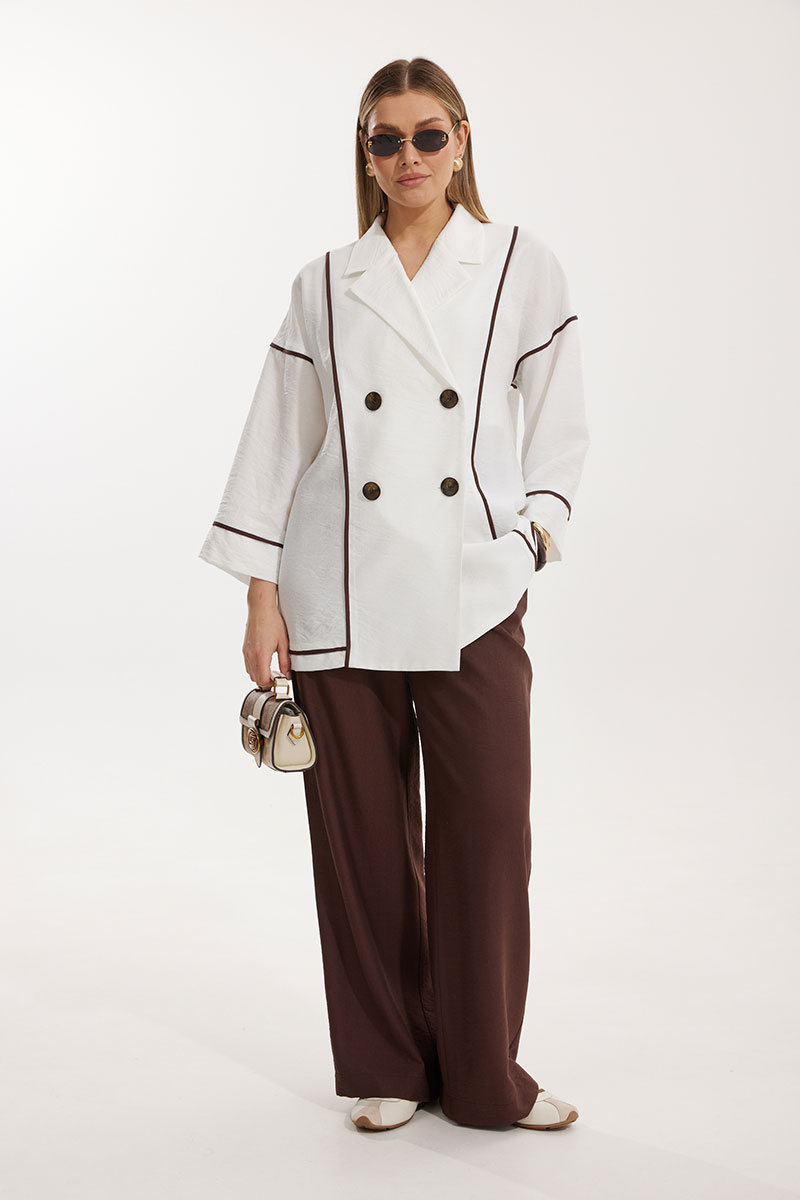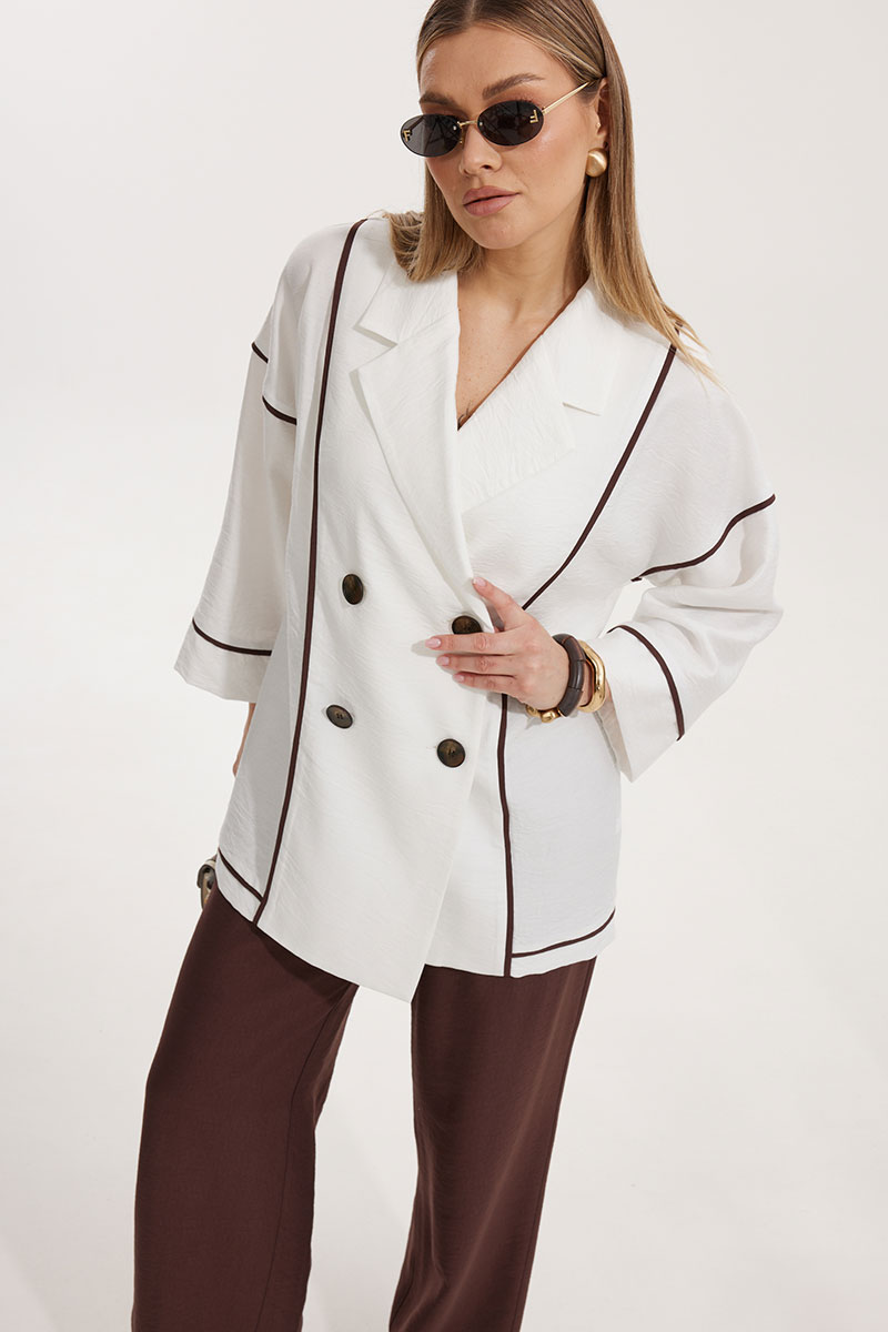 Жакет женский двубортный без подкладки прямого силуэта со спущенной линией плеча длиной за линию бедра. Перед жакета состоит из центральной и боковой части, между ними вставлен отделочный кант контрастного цвета. Спинка состоит из центральной и боковых деталей, в швах располагаются детали канта, контрастного цвета. Рукав втачной одношовный, по низу рукава пришита отрезная манжета, в швах располагается контрастный кант. Горловина обработана отрезным воротником с лацканом. Застежка двубортная на отделочные контрастные пуговицы. Брюки контрастного цвета прямого силуэта с карманами в боковом шве и имитацией гульфика. На задних половинках брюк застрочены вытачки. Пояс притачной на резинке со шнуром в цвет отделочного канта.