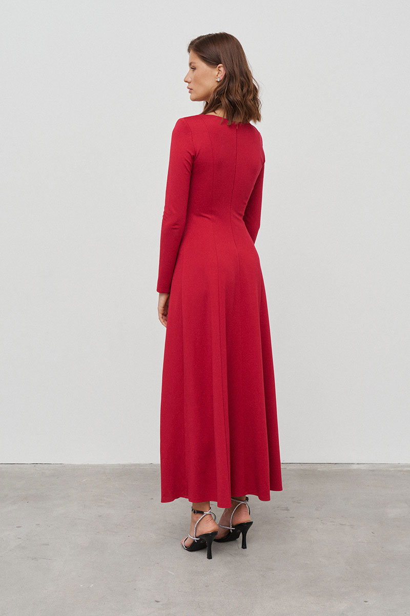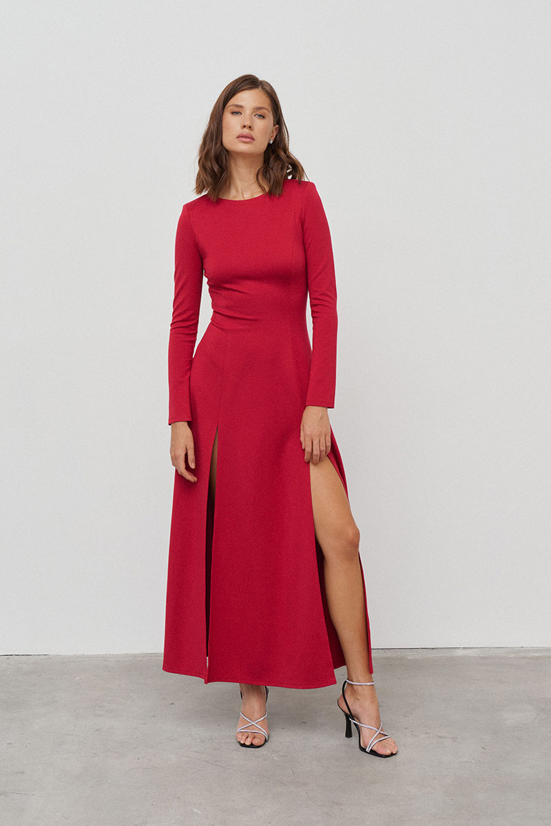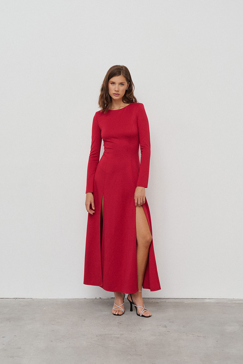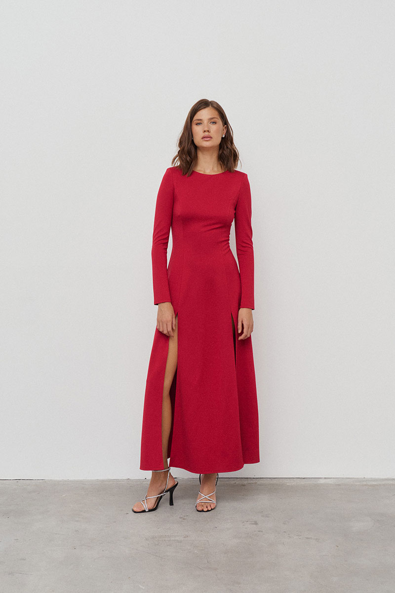 Платье-макси из трикотажного полотна с прилегающим лифом, длинным рукавом и плечевыми накладками. Юбка расклешённая с двумя высокими разрезами по переду. Застёжка на потайную молнию сзади.