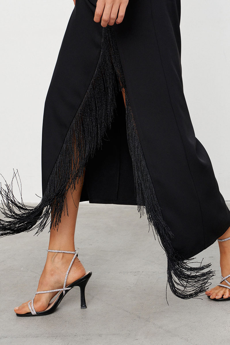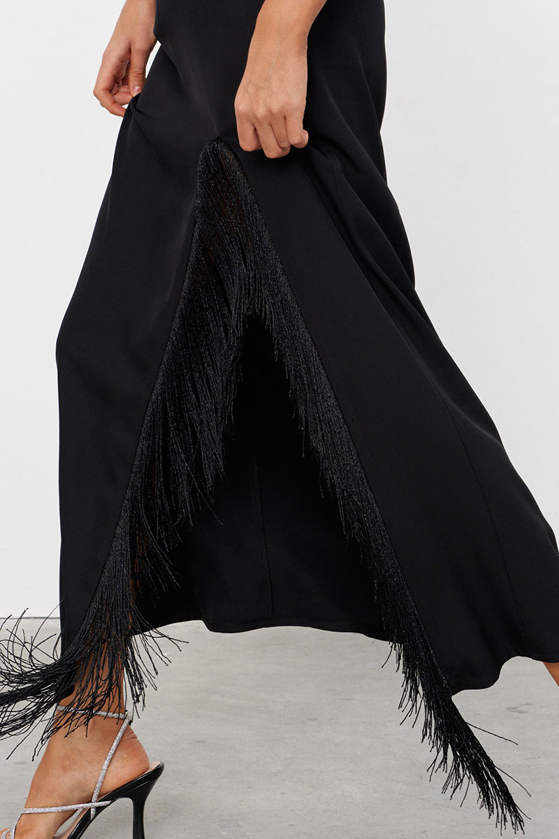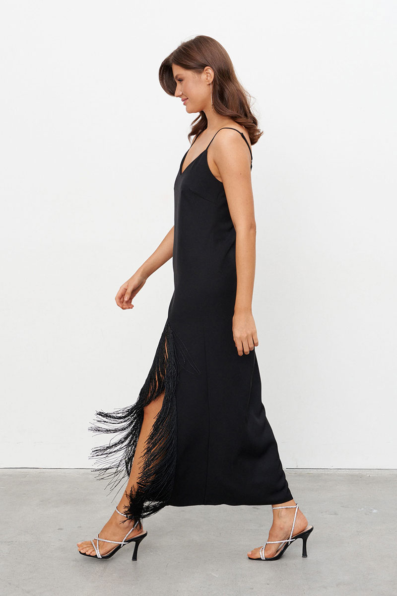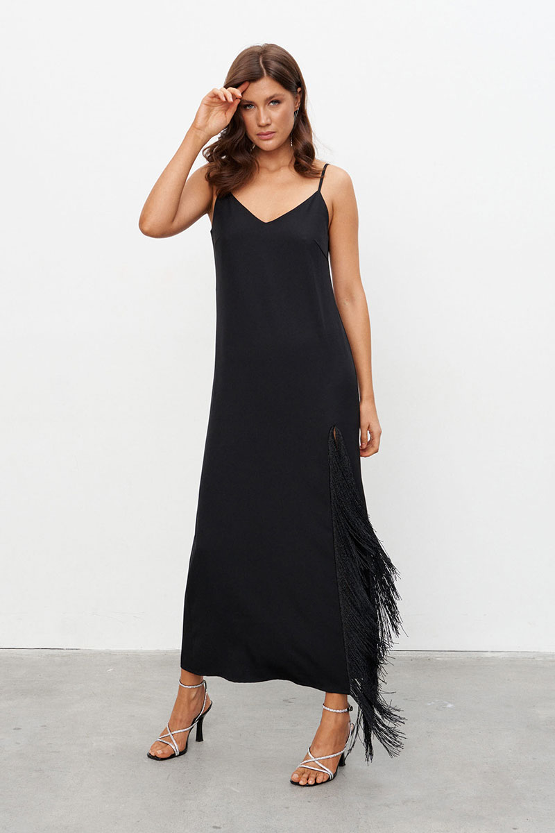 Платье-комбинация из струящейся ткани длиной макси с высоким разрезом, обрамлённым бахромой. Платье на бретелях длину которых можно регулировать. Застёжка на потайную молнию сбоку.