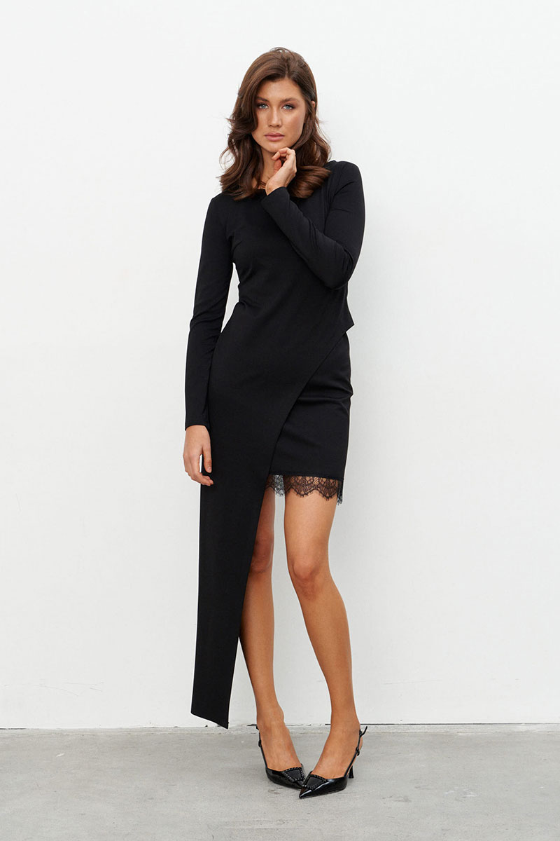 Комплект, имитирующие платье из трикотажного полотна, состоящий из джемпера с асимметричным низом и мини-юбки с кружевом.