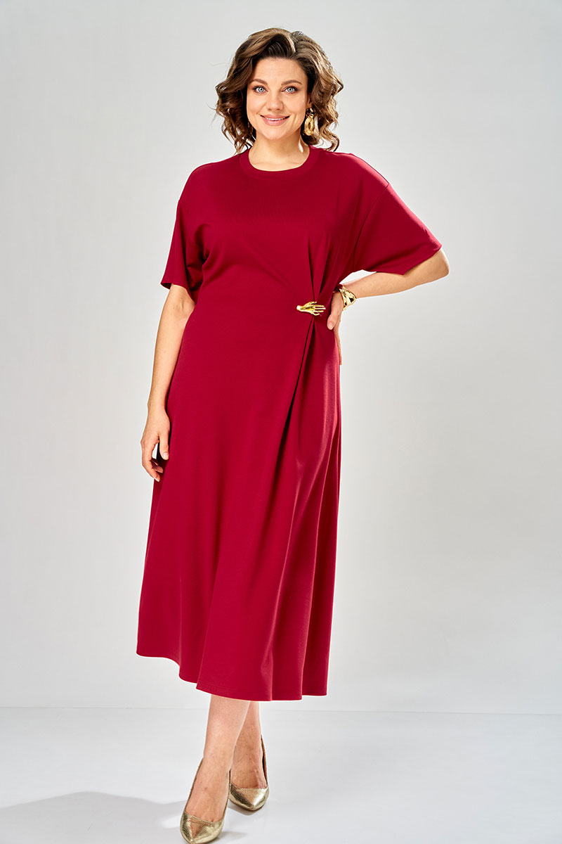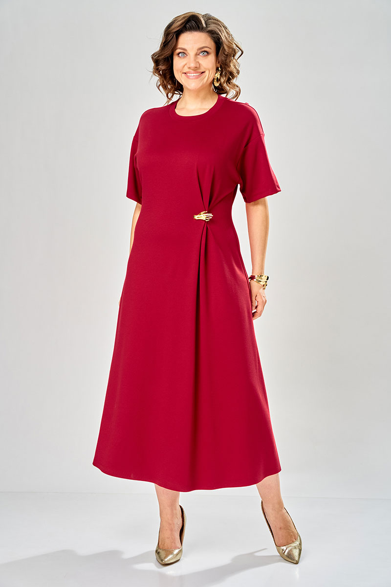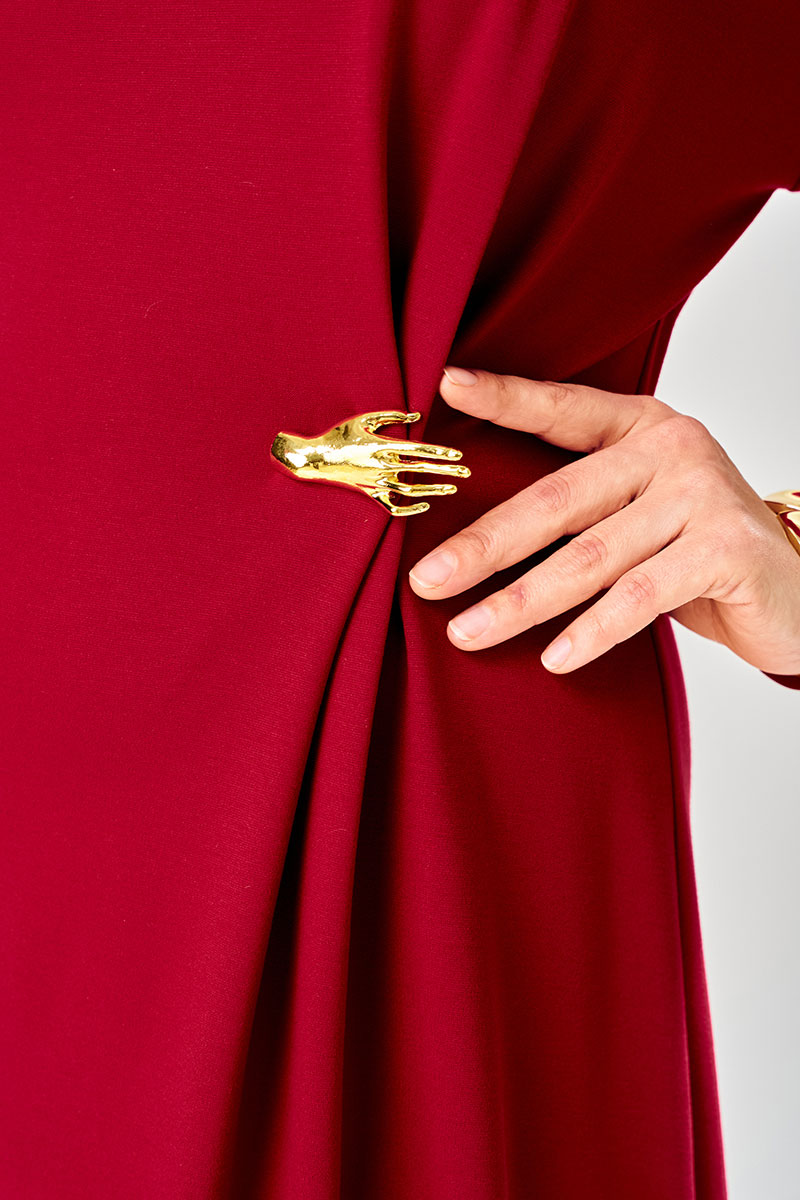 Платье свободного кроя, со спущенной линией плеча, короткий рукав обработан на посошковой машине. Платье длины миди. С декоративными за щипами по переду и брошью в виде руки. Спинка разрезна. Низ платья обработан на плоско шовной машине. Горловина обработана бейкой.