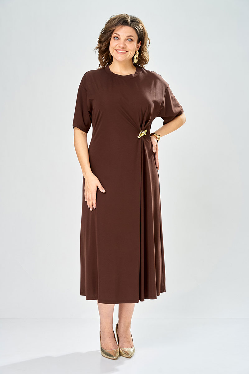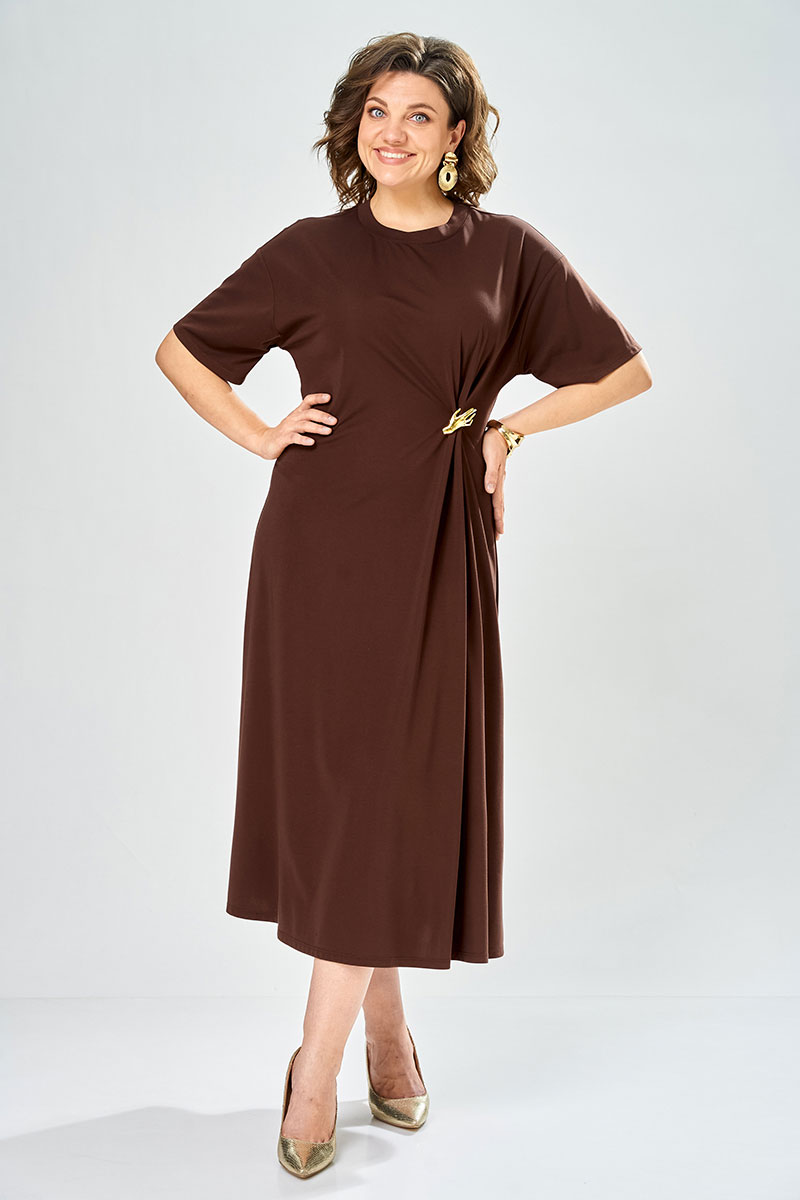 Платье свободного кроя, со спущенной линией плеча, короткий рукав обработан на посошковой машине. Платье длины миди. С декоративными за щипами по переду и брошью в виде руки. Спинка разрезна. Низ платья обработан на плоско шовной машине. Горловина обработана бейкой.