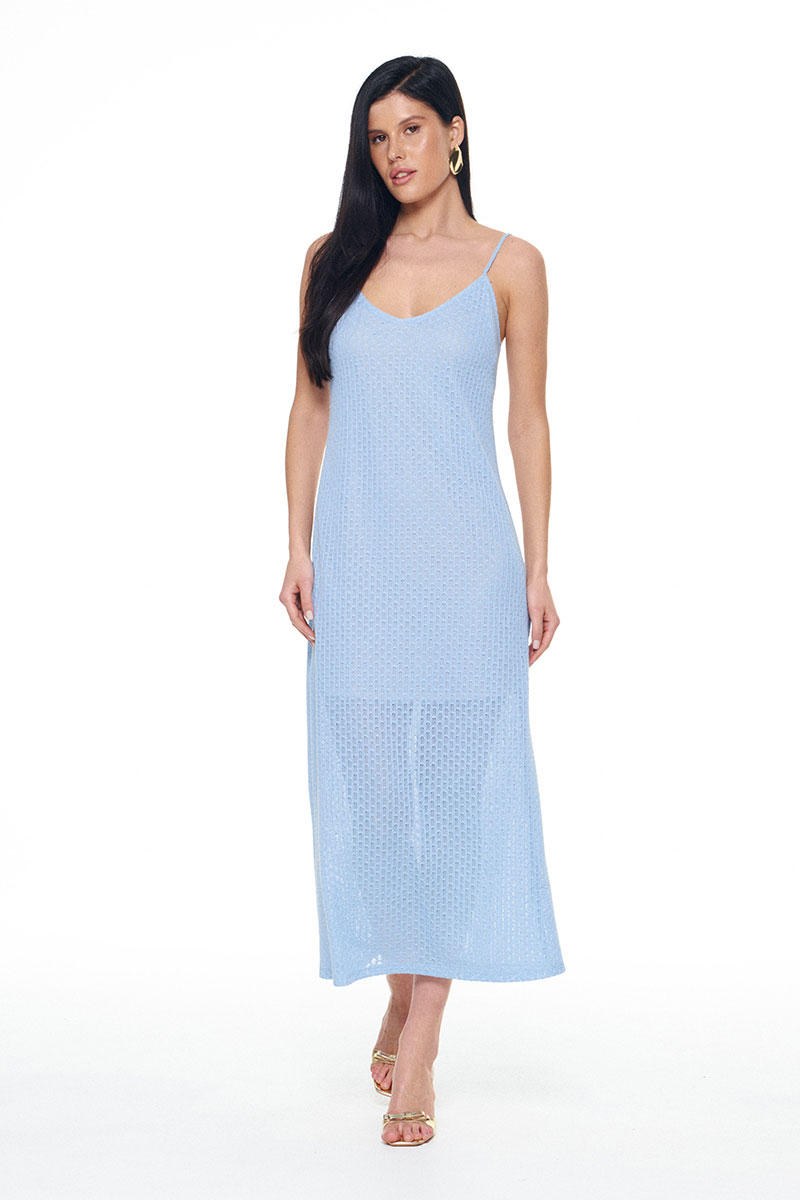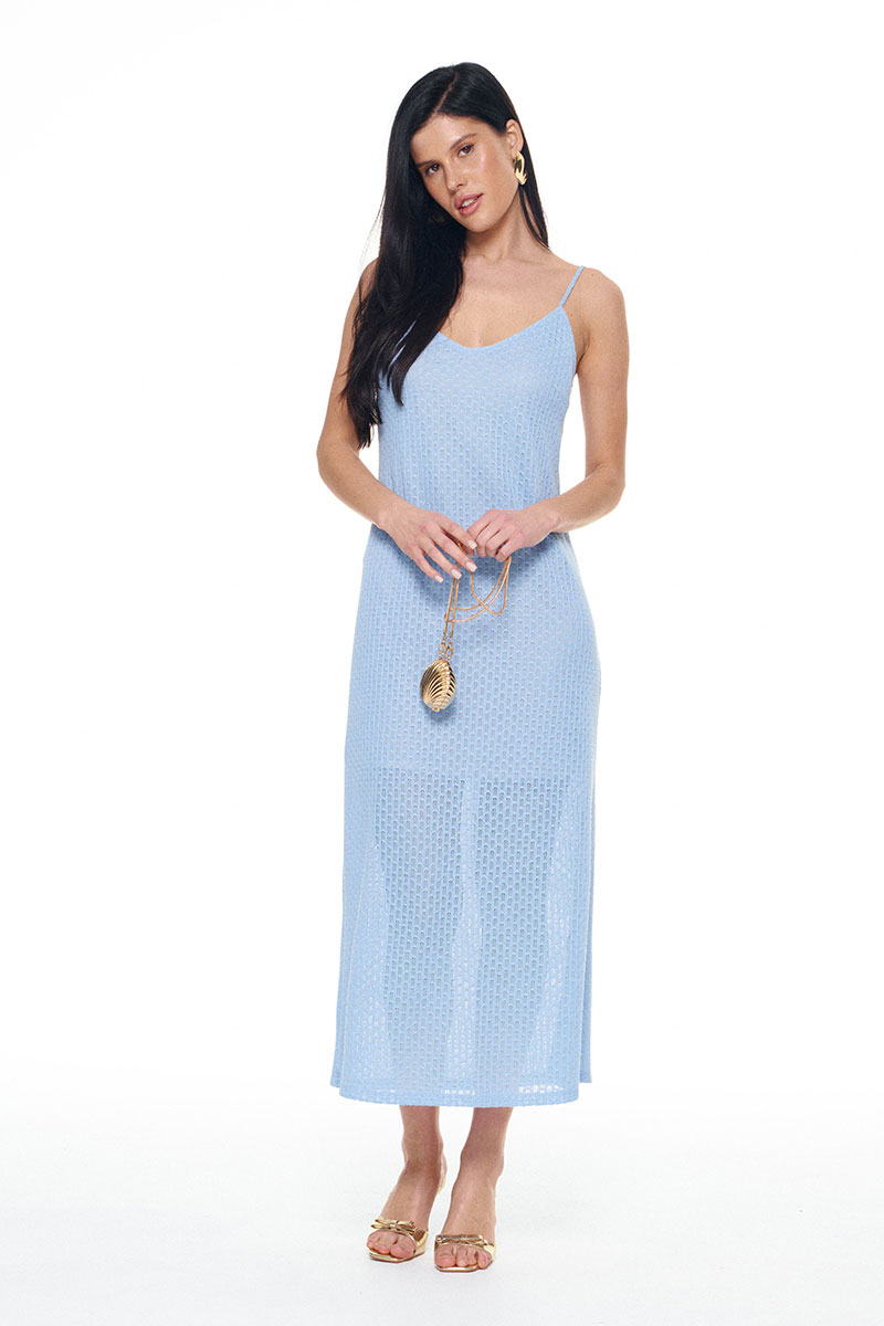 Платье на брителях, длинной миди, полуприлегающего силуэта. По переду наградные выточки. Ткань ткикотаж рыхлый вязки. Верх платья обработан трикотажной подкладкой. Низ пошшит на плоскошовной машине.