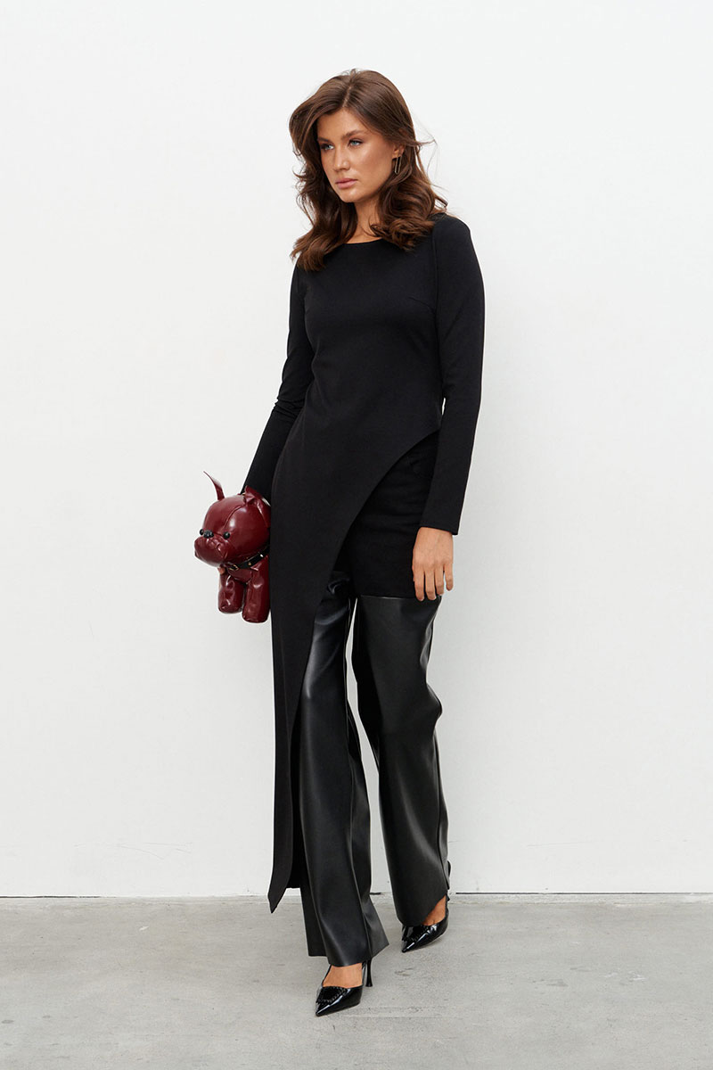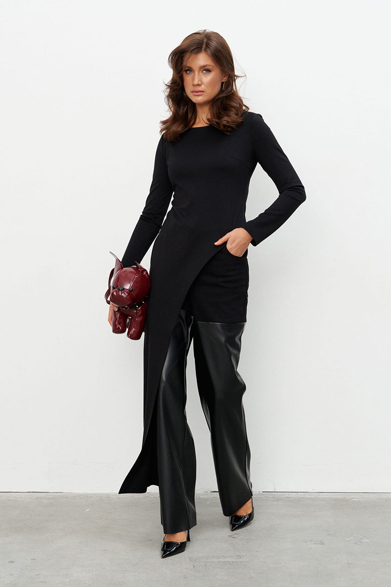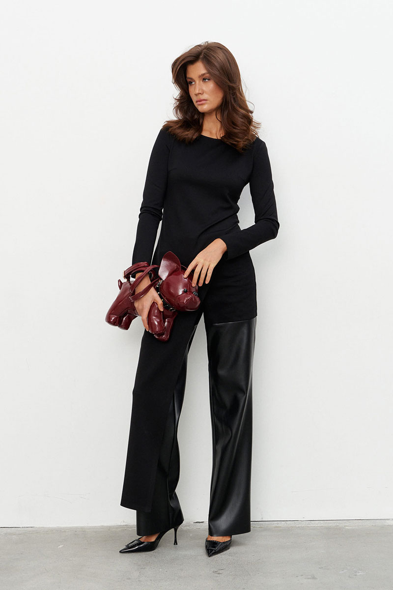 Брюки прямого силуэта выполнены на сочетании плотного джинса и экокожи. Брюки на поясе со шлёвками и застежкой на металлические пуговицы-болты. По переду два прорезных кармана, по спинке - два накладных.