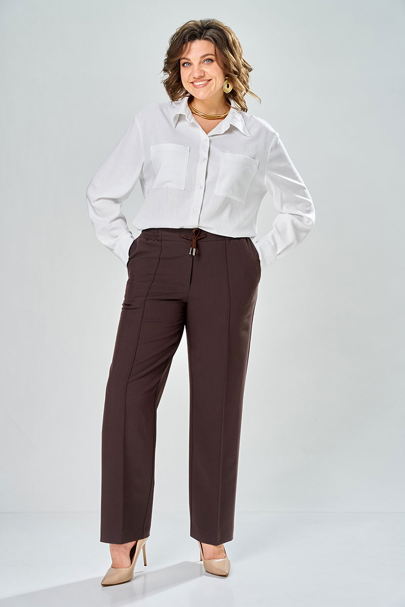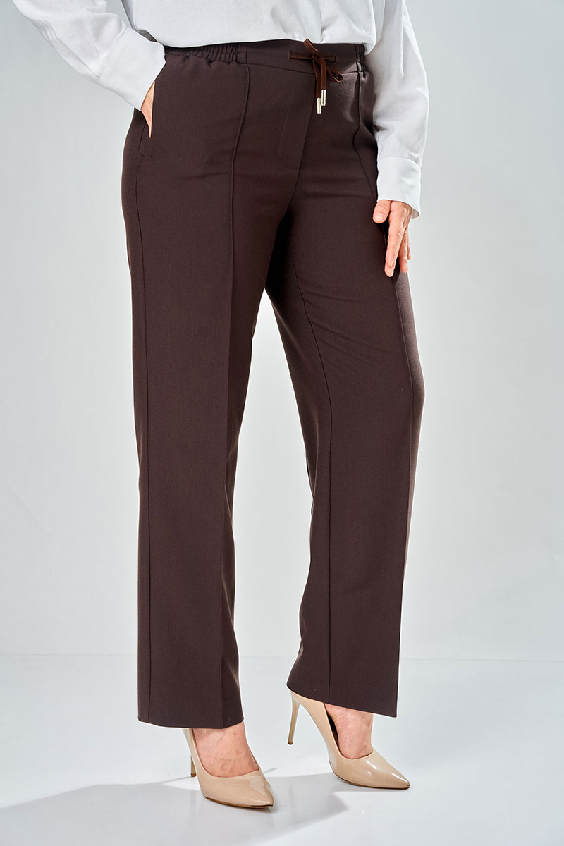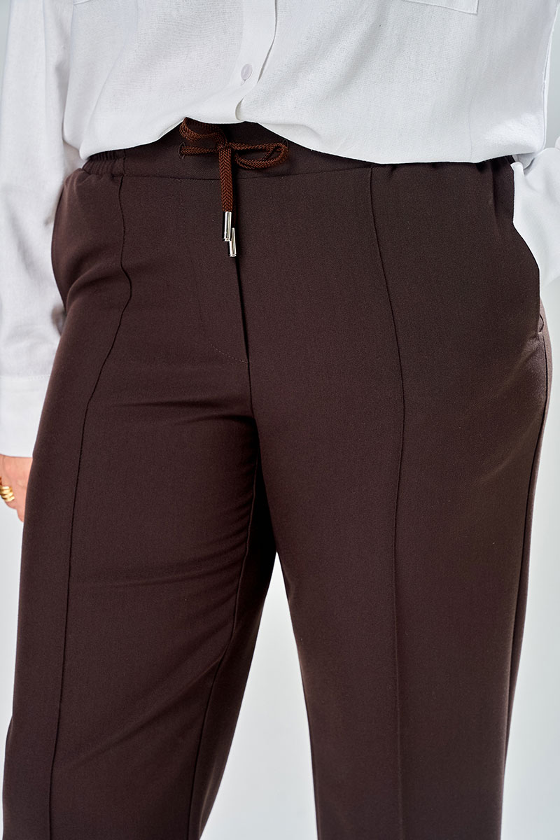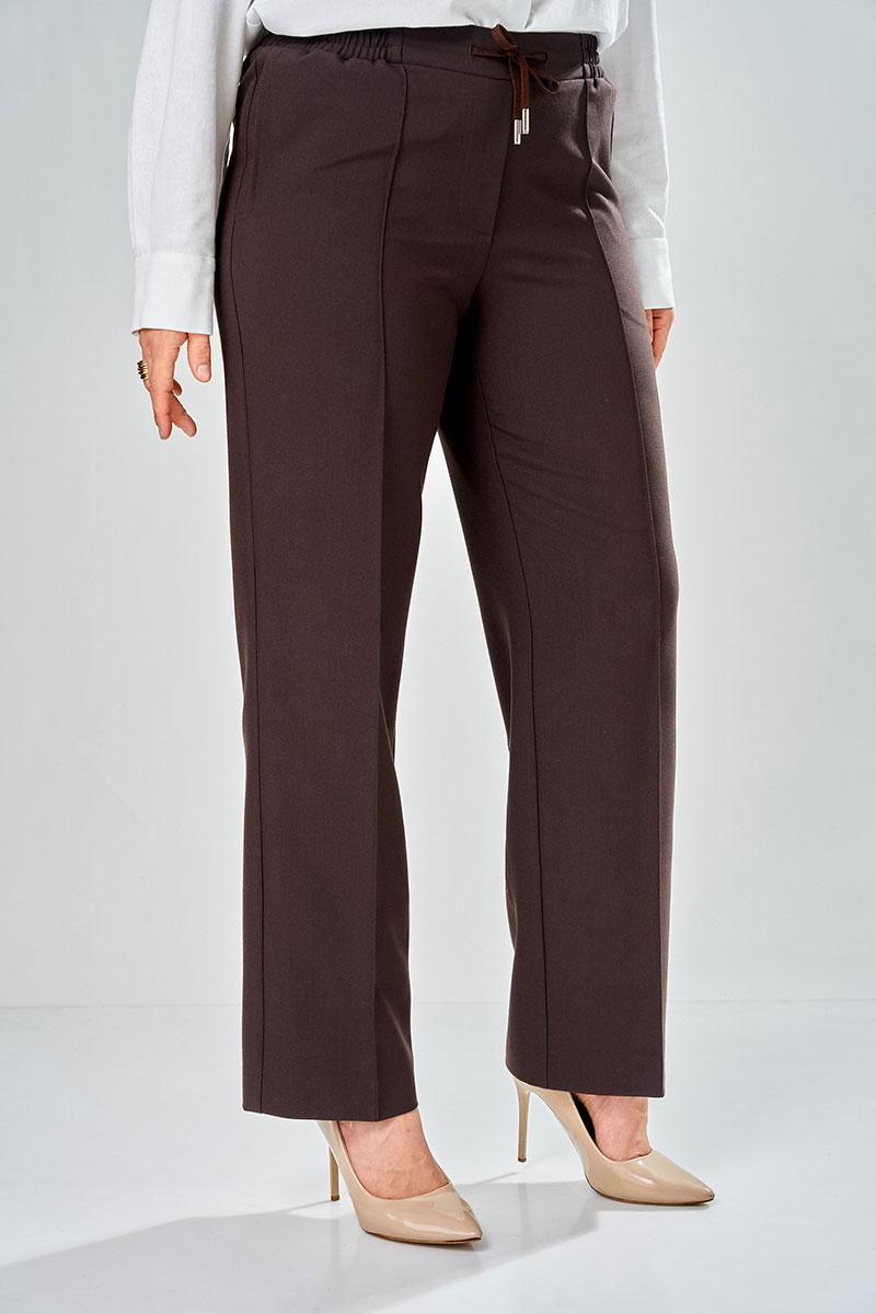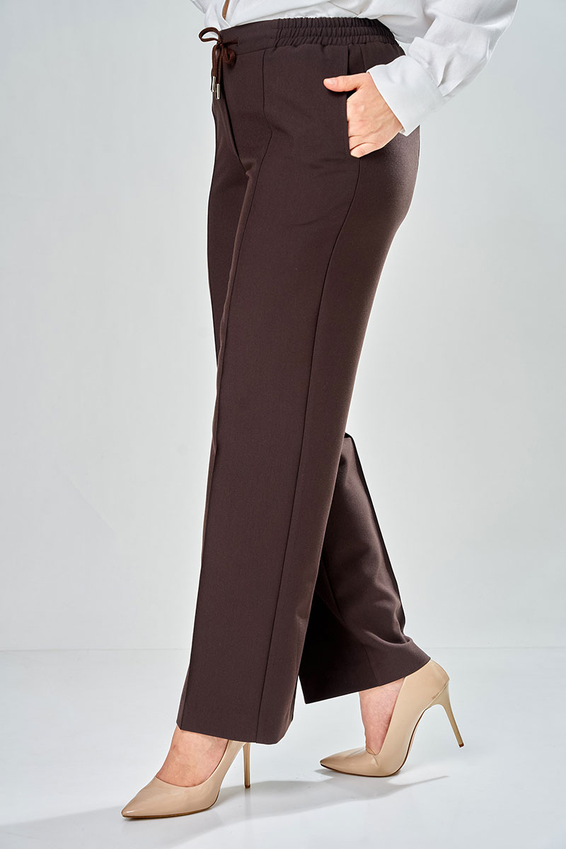 Брюки прямого силуэта с отсрочеными кантами на 0.2 см по переднему и заднему полотнищу. На переднем полотнище брюк расположены карманы. Верх пояса обработан поясам с резинкой, в пояс вставлен декоративный шнурок с наконечниками. Низ брюк обработан швом с открытым срезом.
