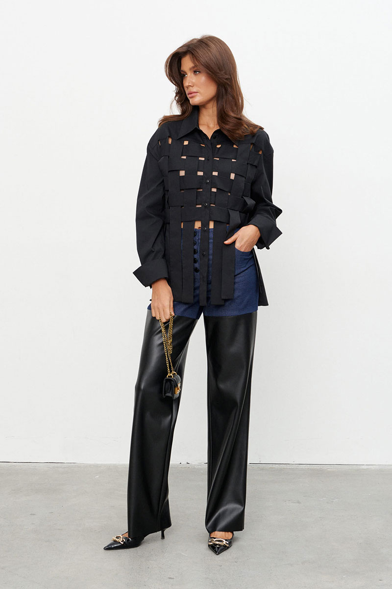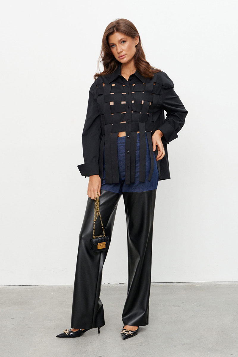 Хлопковая рубашка с дизайнерским решением по переду в виде переплетённых обтачных деталей. Линия плеча спущена, рукав с длинной манжетой, которую можно складывать пополам. Застёжка на планку с пуговицами спереди.