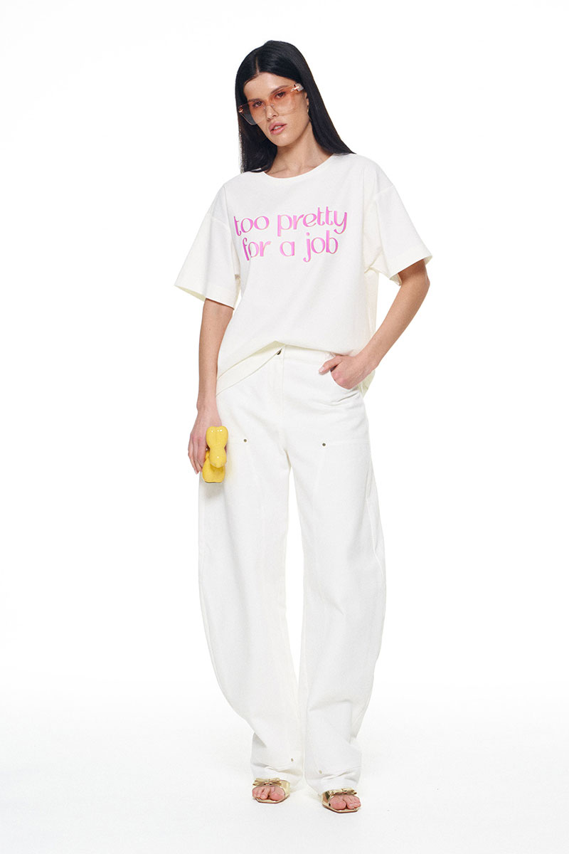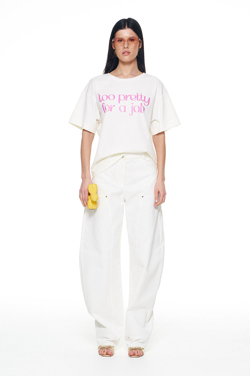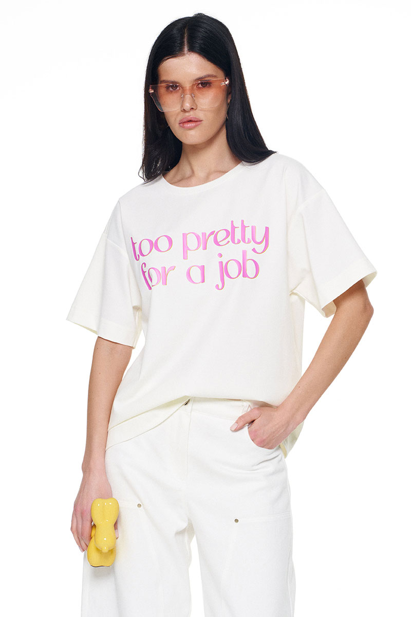 Оверсайз футболка из плотного трикотажа с ярким принтом надпись " too pretty for a job ". Линия плеча спущена, горловина отделана эластичной бейкой.