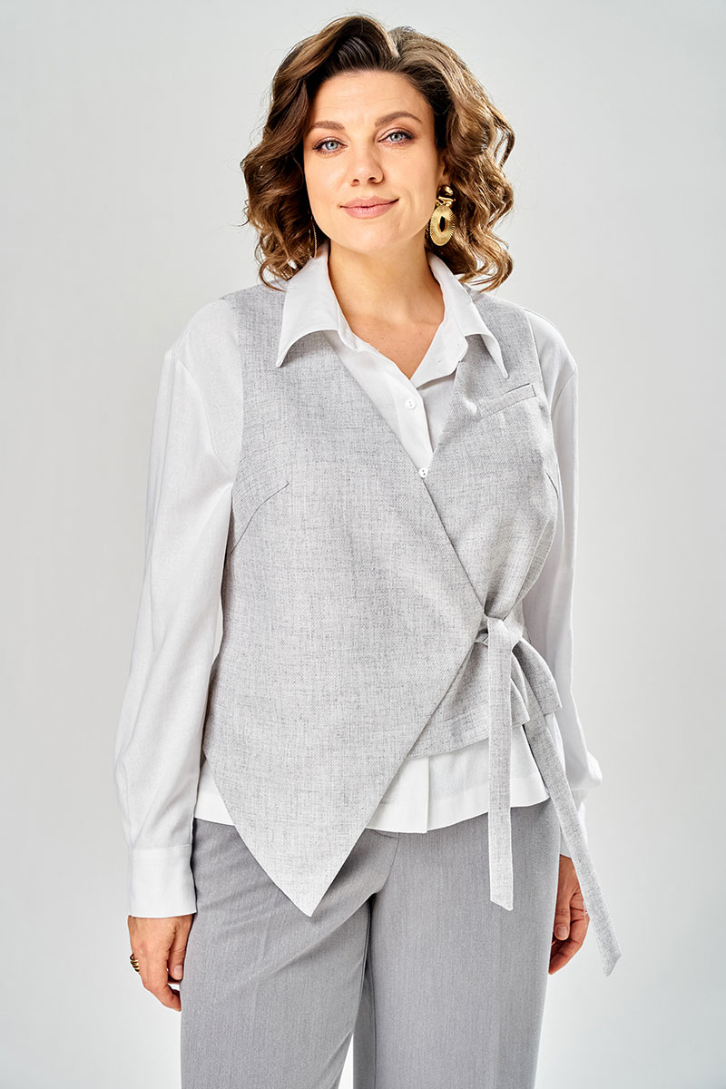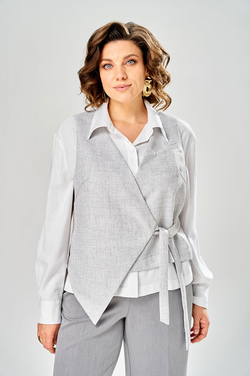 Жилетка полуприлегающего силуэта с фигурным передом. По левому переду расположен прорезной карман обманка. Застежка на потайную кнопку и пояс. Спинка разрезна. Низ обработан на обтачке. Изделие без подкладке.