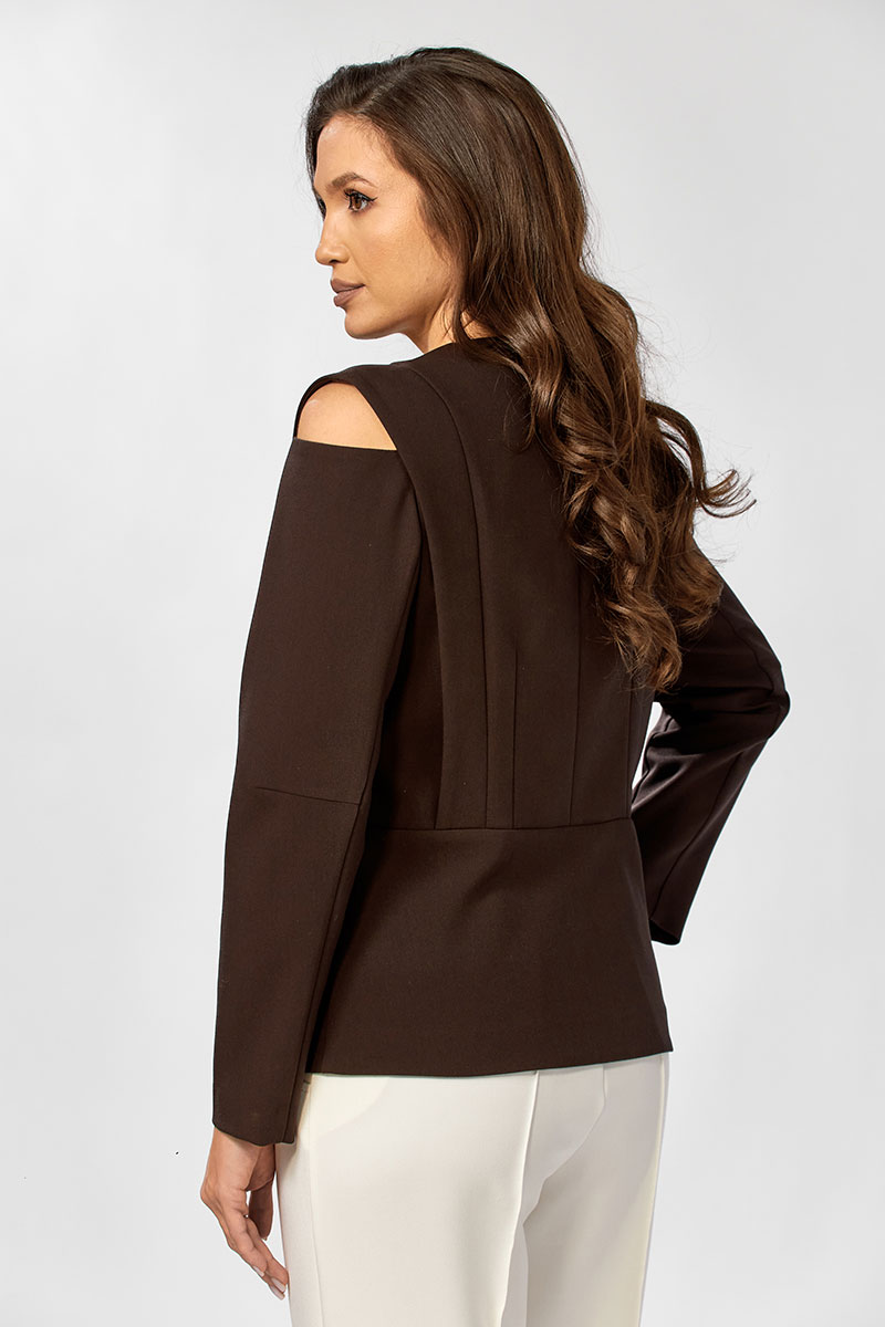 Жакет полуприлегающего силуэта. По полочке и спинке расположена отлетная кокетка, по низу изделия баска. Рукава длинные с открытым плечом. Структурированные плечи. Застежка на петли пуговицы. Жакет без подкладки. Низ изделия подшит на плоскошовной машине.