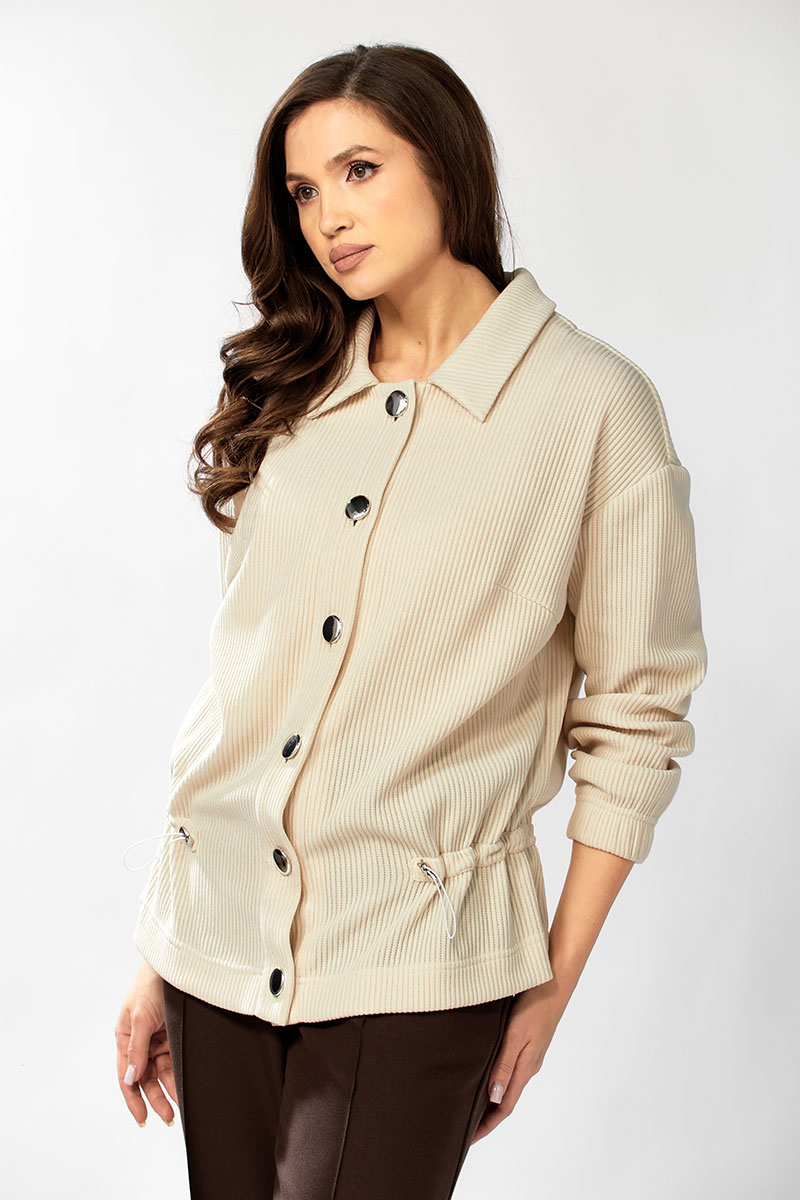 Бомбер прямого силуэта с длинными спущенными рукавами, низ рукава обработан резинкой. По спинке кокетка, на кокетке пришит декоративный элемент. По переду карман обманка. Застежка на петли пуговицы. Низ изделия подшит на плоскошовной машине. На линии талии настрочена кулиса, регулируется по ширине. Изделия без подкладки.