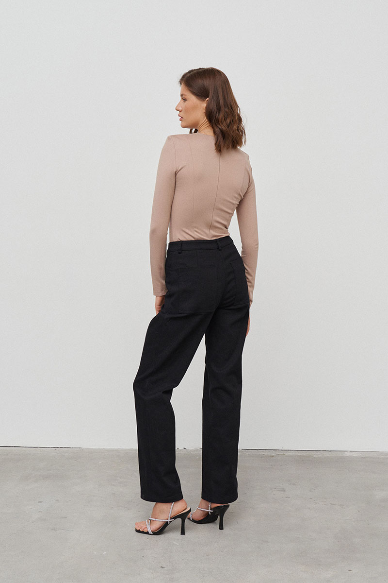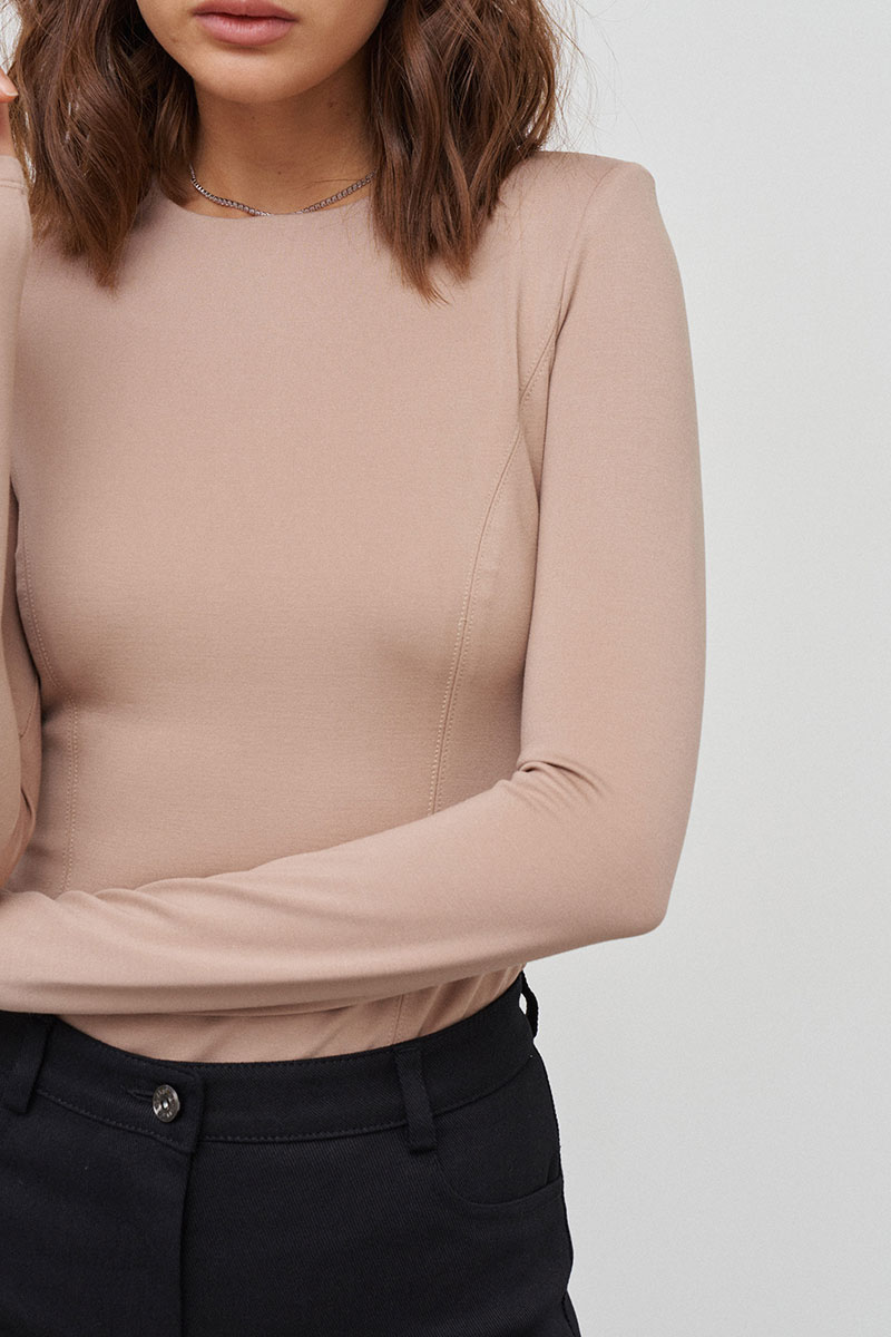 Джемпер из трикотажного полотна прилегающего силуэта с длинным рукавом и плечевыми накладками. По переду и спинке рельефы для плотного приталивания по фигуре. Вырез горловины круглый. Сзади застёжка на потайную молнию.