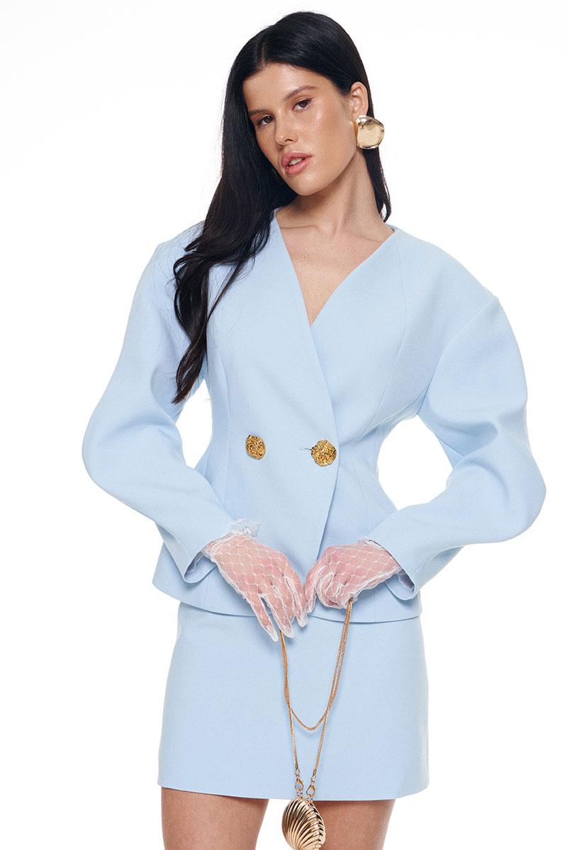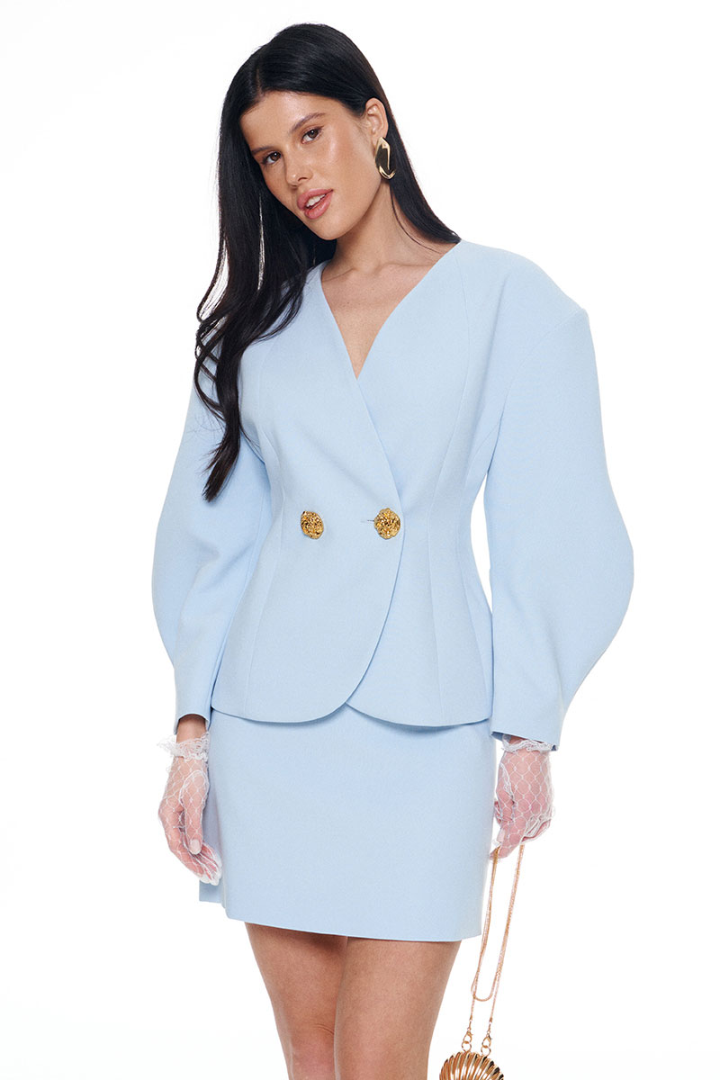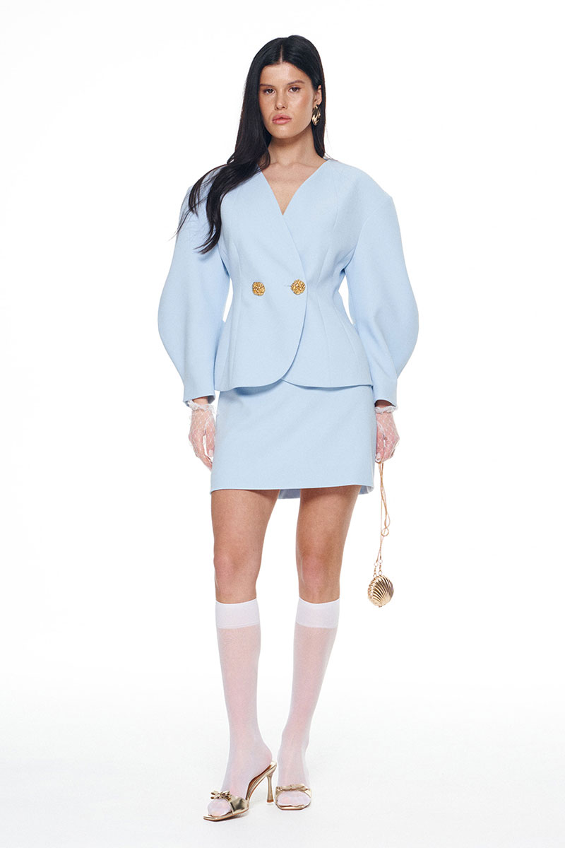 Костюм из плотной поливискозы состоящий из жакета и мини-юбки. Жакет на подкладке приталенного силуэта придаёт фигуре эффект песочных часов. Архитектурные рукава делают образ сложным и изысканным. Застежка на две большие золотые пуговицы. Юбка-мини на подкладке с застёжкой на потайную молнию сзади.