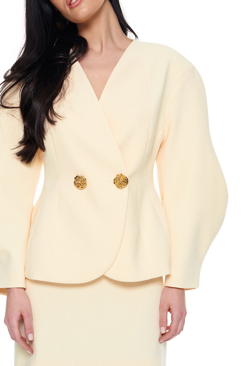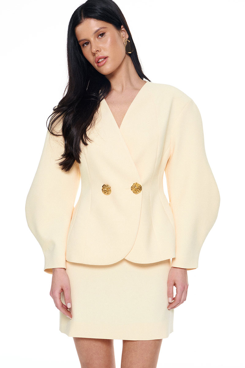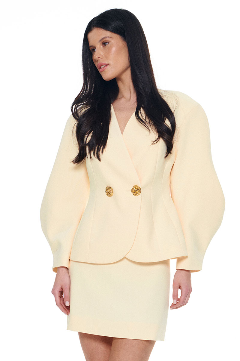 Костюм из плотной поливискозы состоящий из жакета и мини-юбки. Жакет на подкладке приталенного силуэта придаёт фигуре эффект песочных часов. Архитектурные рукава делают образ сложным и изысканным. Застежка на две большие золотые пуговицы. Юбка-мини на подкладке с застёжкой на потайную молнию сзади.