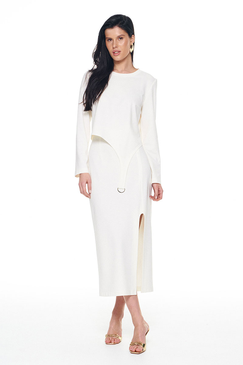 Комплет состоит из джемпера и юбки. Джемпер прямого силуэта укороченный, перед ассиметричный. По переду декоративный элемент полукольцо. Рукав длинный одношовный. Спинка разрезная. Горловина обработан бейкой с основной ткани. Низ рукова и изделия обработан на плоскошевной машине. Юбка миди прямого силуэта с завышенной линией талии, по преду юбки распаложен разрез. Верх юбки обработан обтачкой и резинкой, низ юбки на плоскошевной машине.