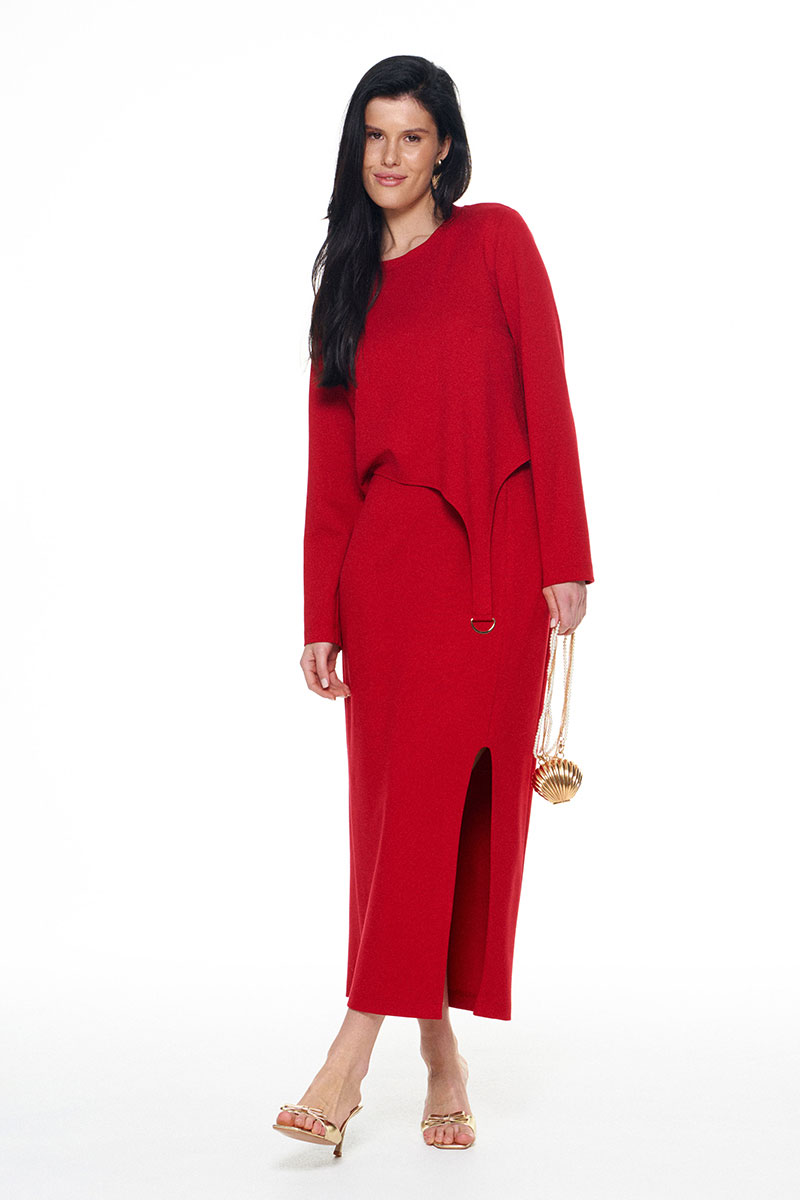 Комплет состоит из джемпера и юбки. Джемпер прямого силуэта укороченный, перед ассиметричный. По переду декоративный элемент полукольцо. Рукав длинный одношовный. Спинка разрезная. Горловина обработан бейкой с основной ткани. Низ рукова и изделия обработан на плоскошевной машине. Юбка миди прямого силуэта с завышенной линией талии, по преду юбки распаложен разрез. Верх юбки обработан обтачкой и резинкой, низ юбки на плоскошевной машине.