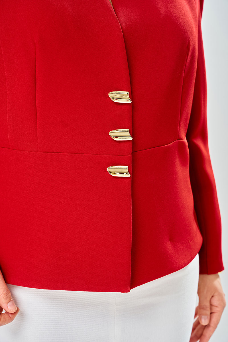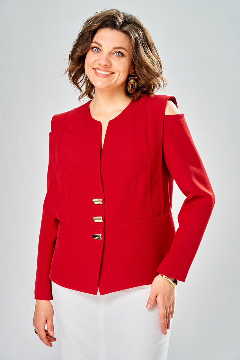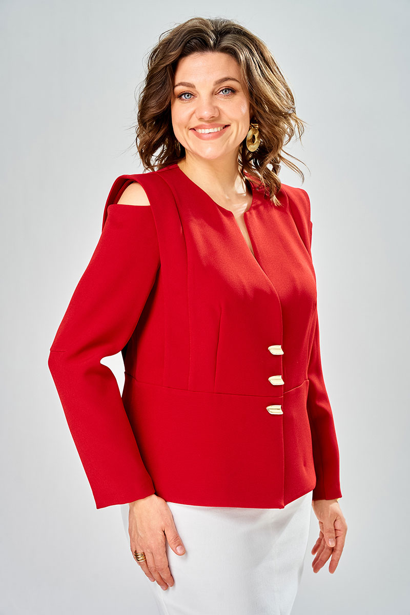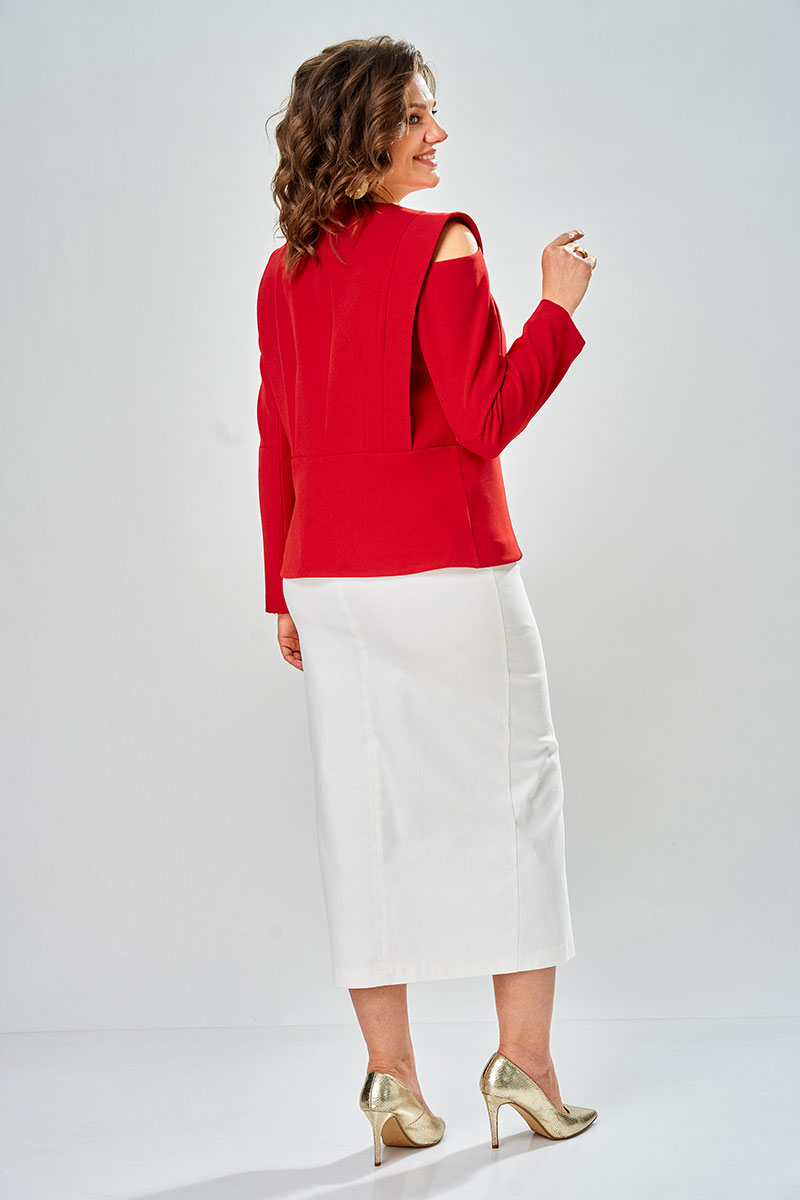 Жакет полуприлегающего силуэта. По полочке и спинке расположена отлетная кокетка, по низу изделия баска. Рукава длинные с открытым плечом. Структурированные плечи. Застежка на петли пуговицы. Жакет без подкладки. Низ изделия подшит на плоскошовной машине. Юбка прямого силуэта с завышенной линией талией. По переднему полотнищу расположены карманы хулиганы. На задней половинке юбки расположена кокетка. Застежка на молнии, пуговицу. Низ обработан швом в подгибку с открытым срезом.