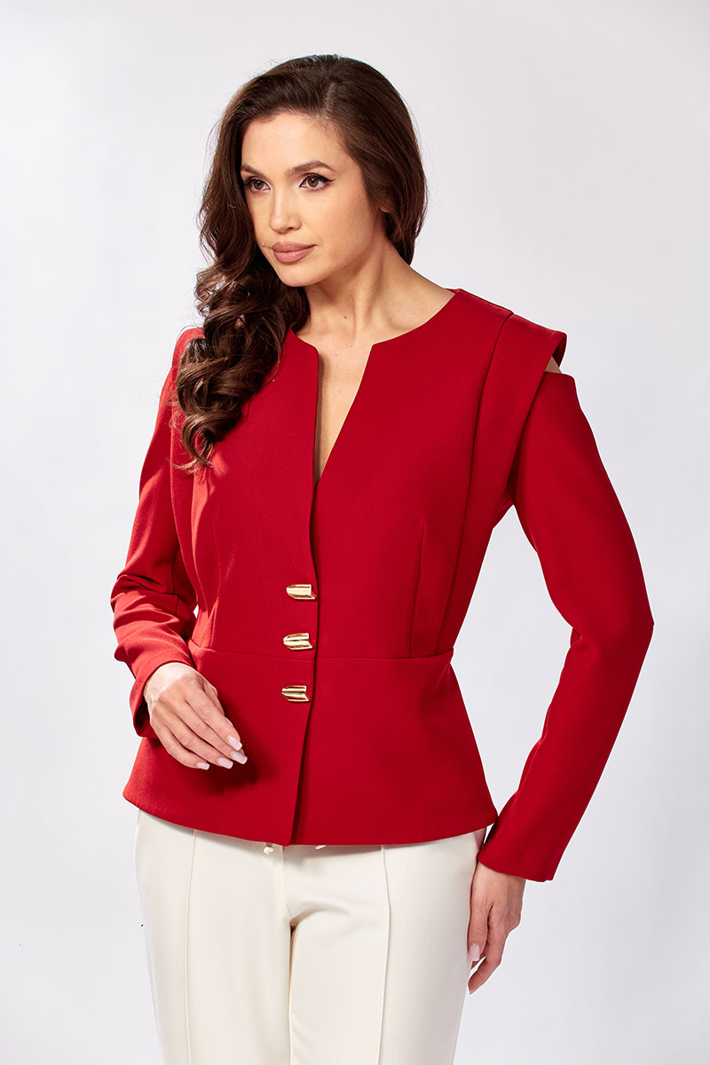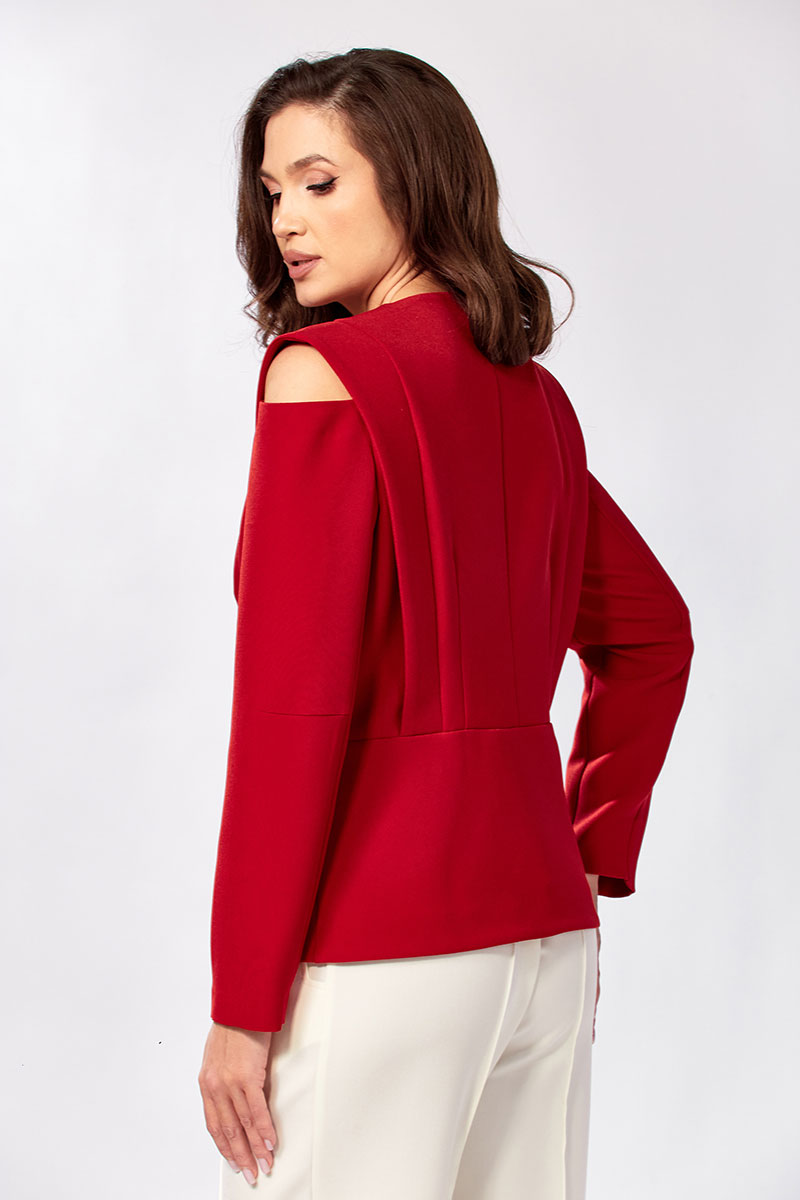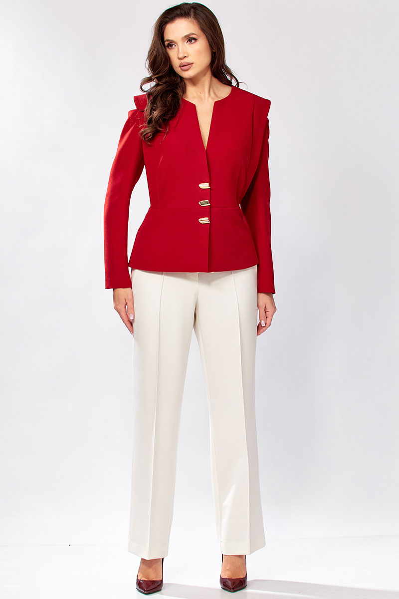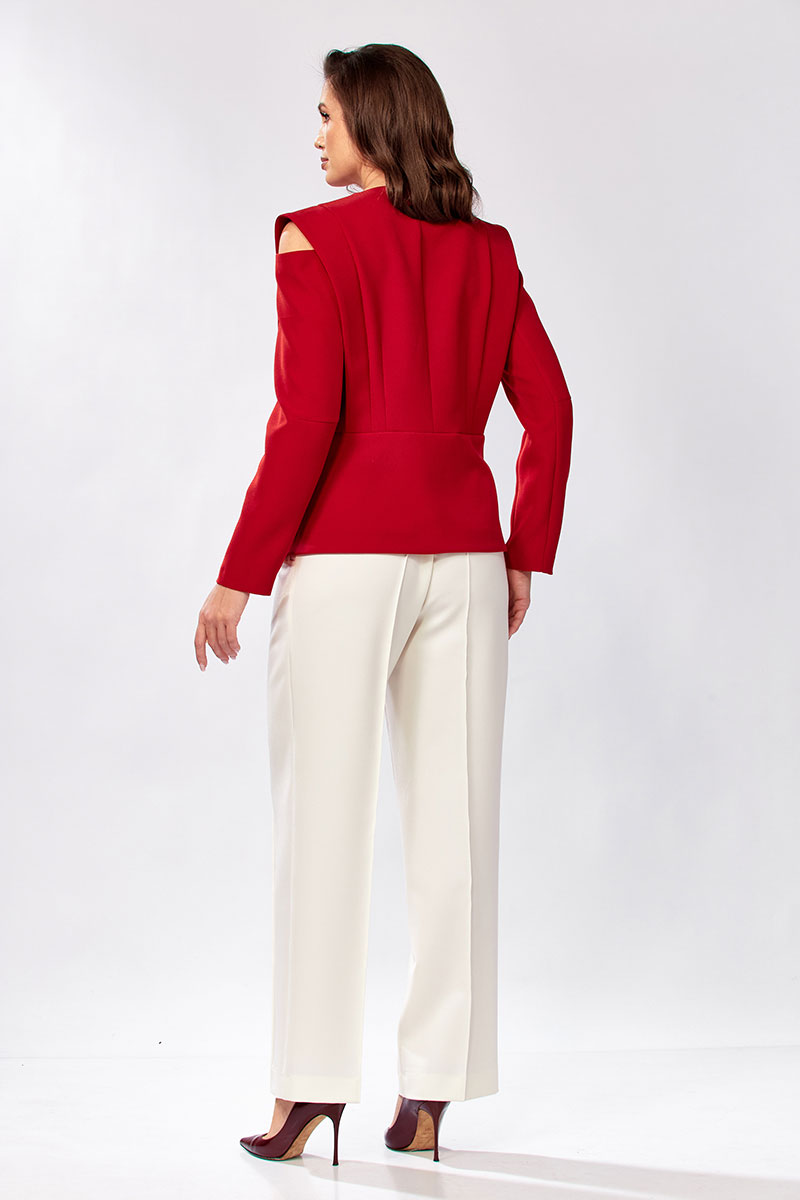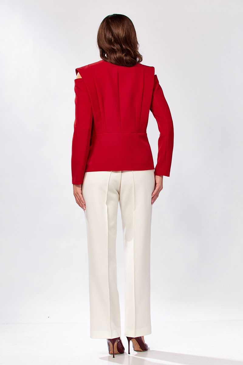 Костюм состоящий из жакета и брюк. Жакет полуприлегающего силуэта. По полочке и спинке расположена отлетная кокетка, по низу изделия баска. Рука длинный с открытым плечом. Структурированные плечи. Застежка на петли пуговицы. Жакет без подкладки. Низ изделия подшит на плоскошовной мшине. Брюки прямого силуэта с отсрочеными кантами на 0.2 см по переднему и заднему полотнищу. На переднем полотнище брюк расположены карманы. Верх пояса обработан поясам с резинкой, в пояс вставлен декоративный шнурок с наконечниками. Низ брюк обработан швом с открытым срезом.