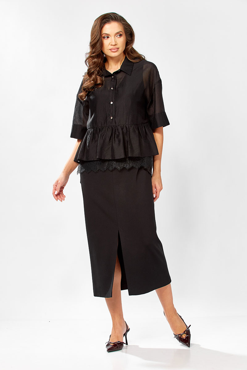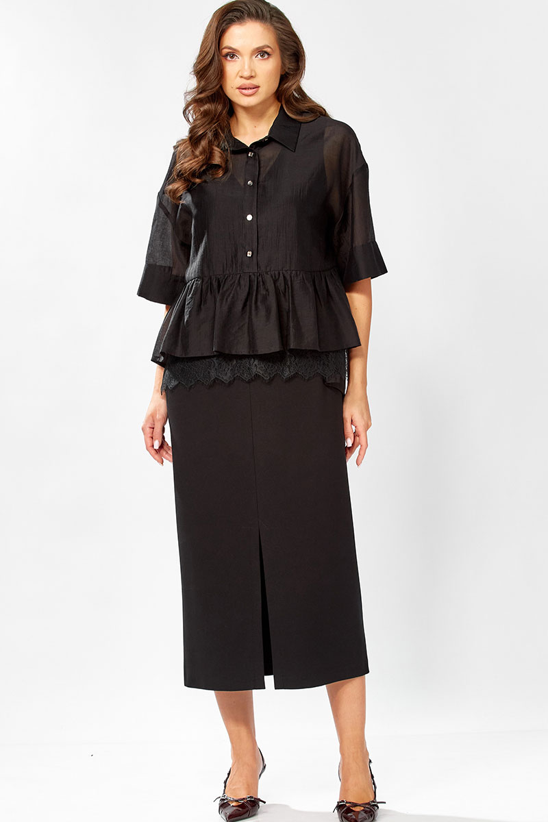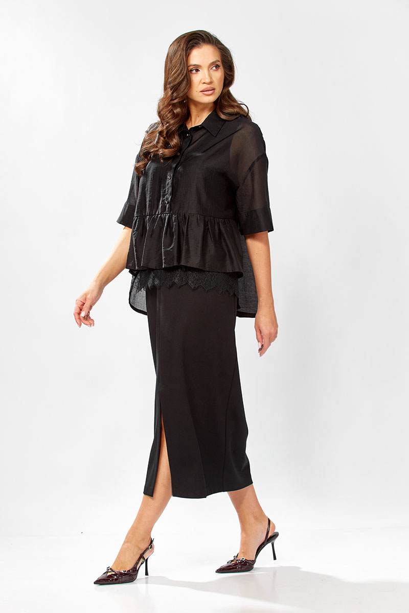 Платье полуприлегающего силуэт, без рукавовс V - образным вырезом. Платье длинное с разрезом по переду, спинка разрезная. Низ изделия подшит на плоскошовной машине. Блузка прямого силуэта с воротнтком стойкой, с коротким спущенным рукавом на манжете. Застежка по переду до талии на пели-пуговицы. По низу изделия баска, по переду настрочено декоративное кружево. Спинка удлиненная.